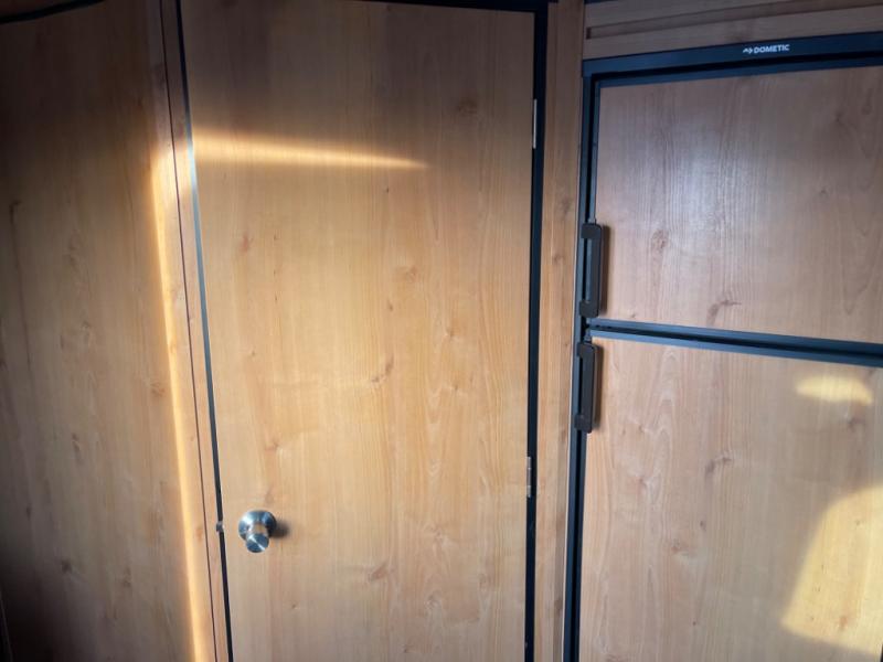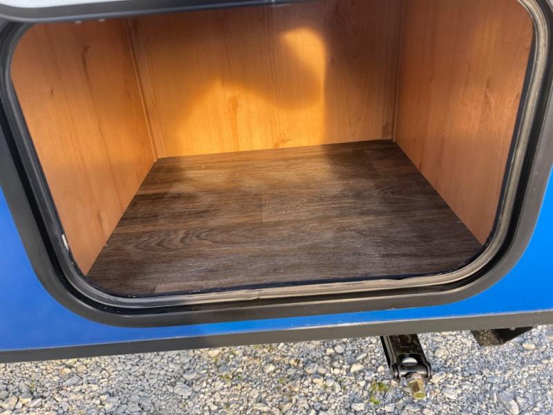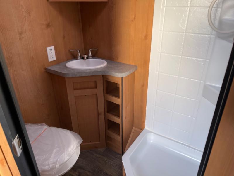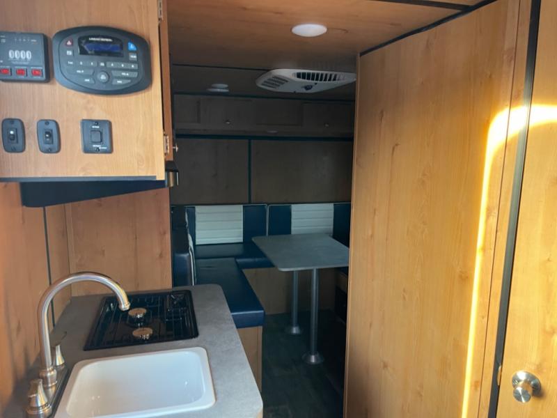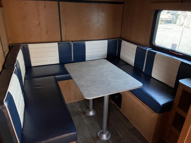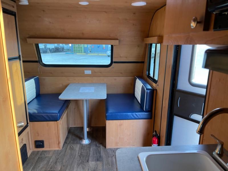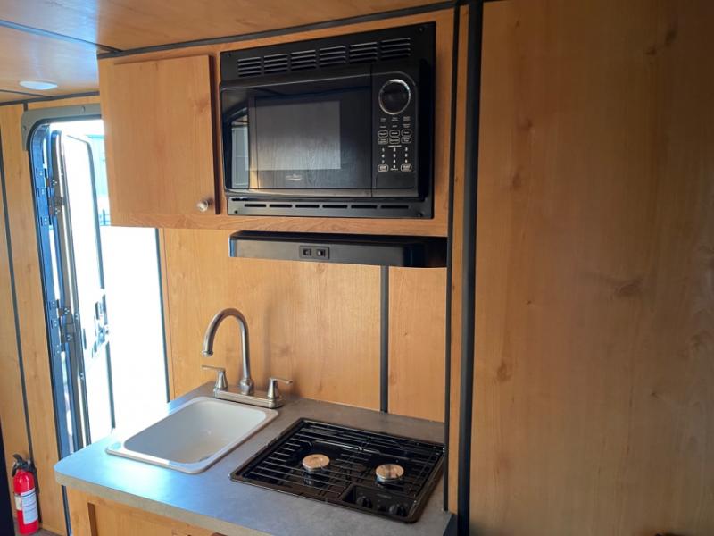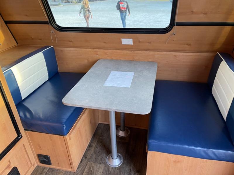 Whether you travel to festivals, RV parks, or local camp grounds, your trailer will be talked about! The exterior style of yesterday makes it noticeable! You will love this couples trailer yet you can offer sleeping space on the front dinette for one more. The rear offers a walk-around 60" x 74" queen bed with dual bedside closets, making this spacious and comfortable to get to the dry bath at night. The cook will have a microwave to easily make a meal and a two-burner cooktop, plus the 6 cu. ft. refrigerator to hold the cold items.