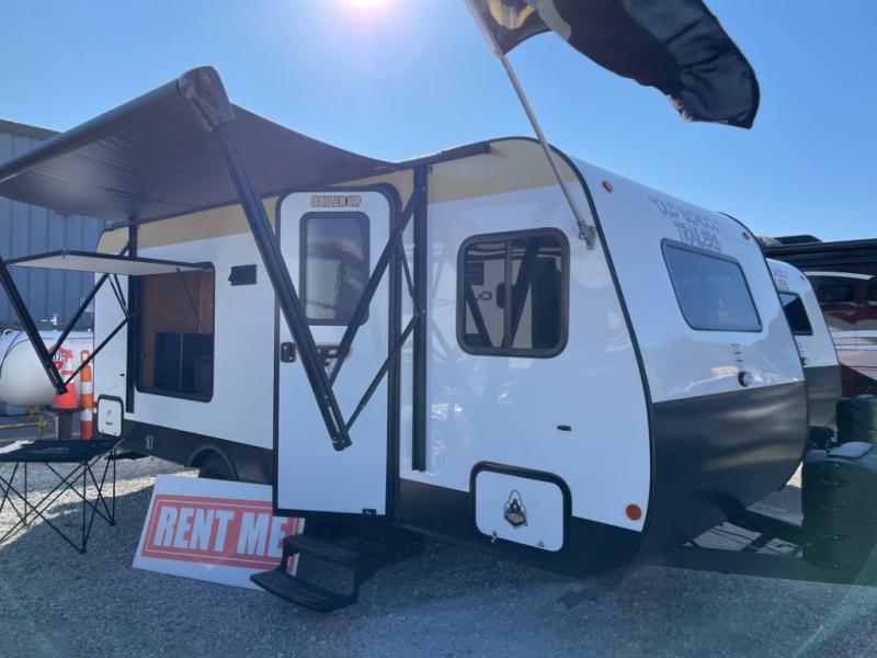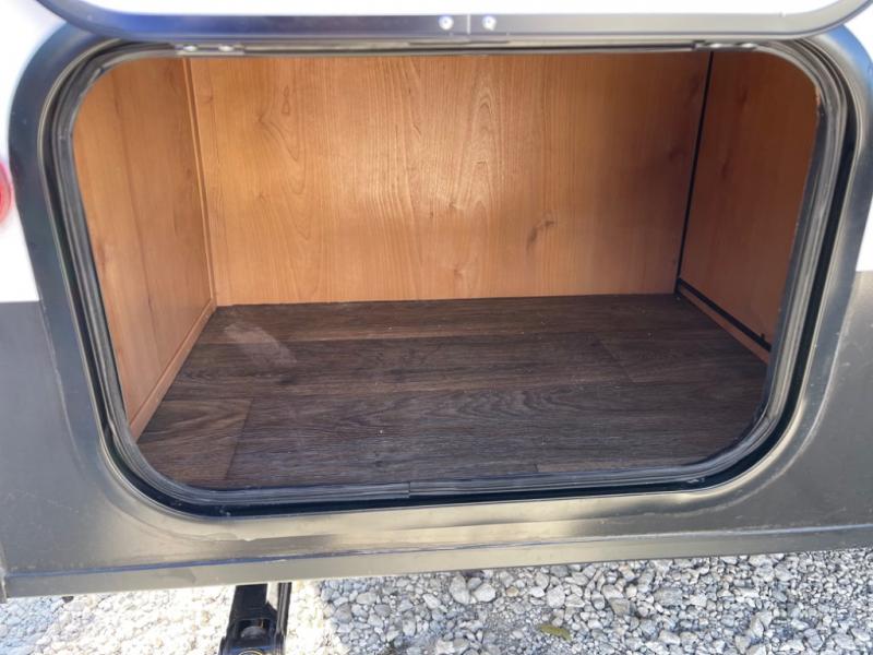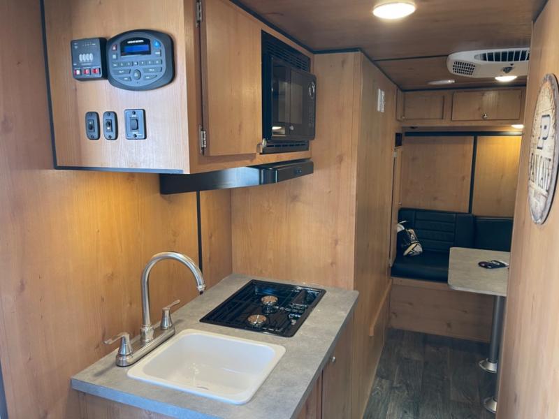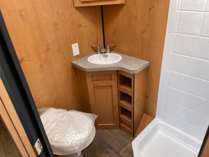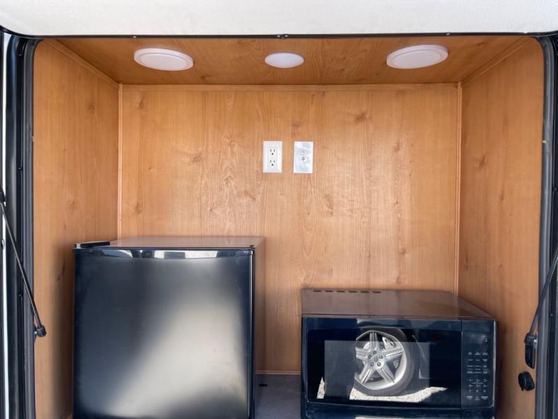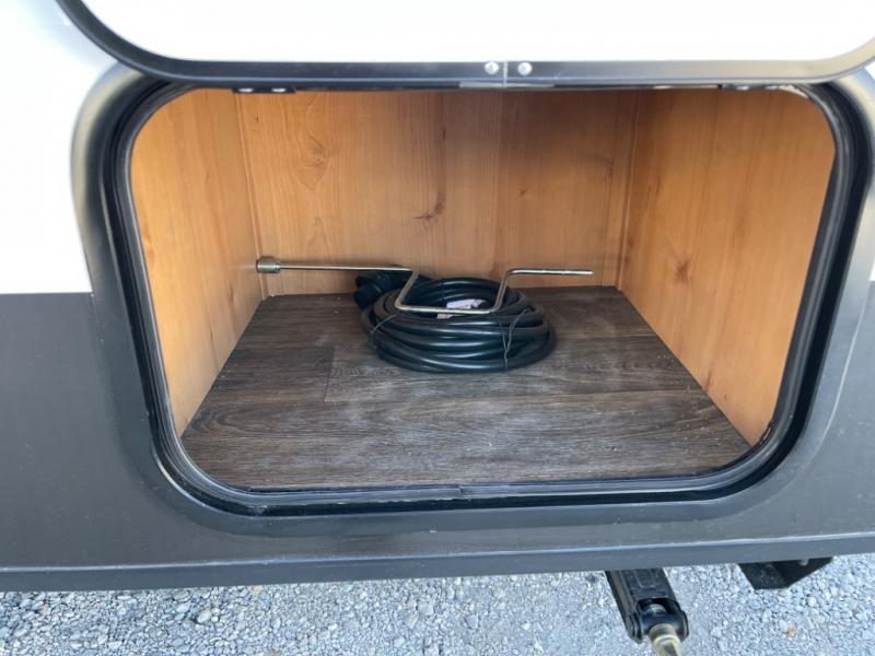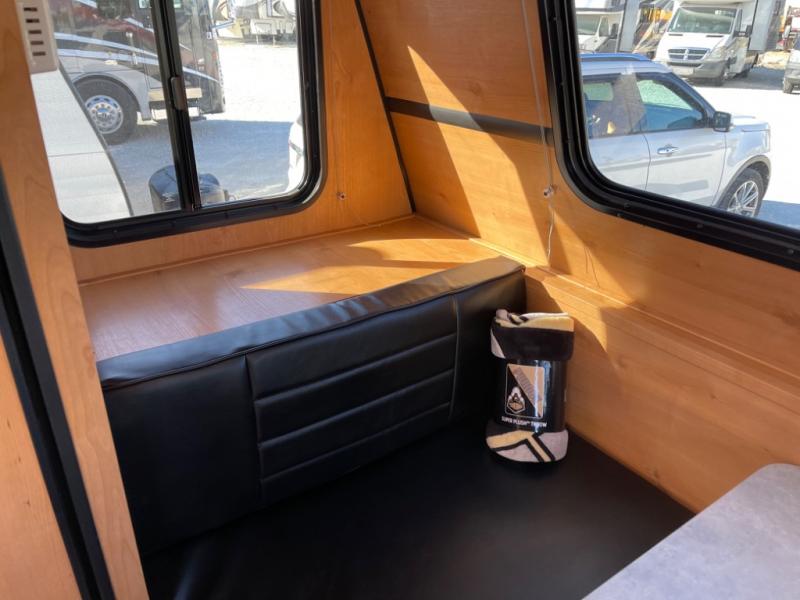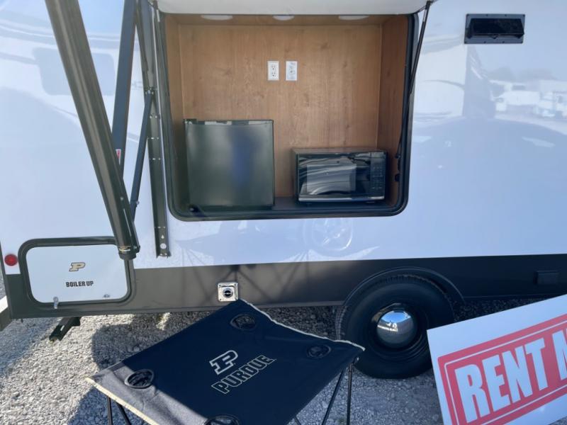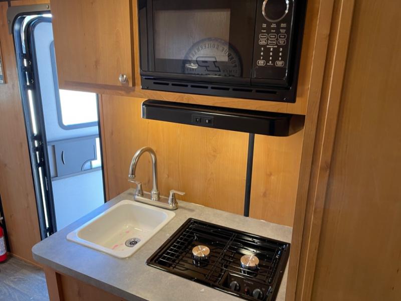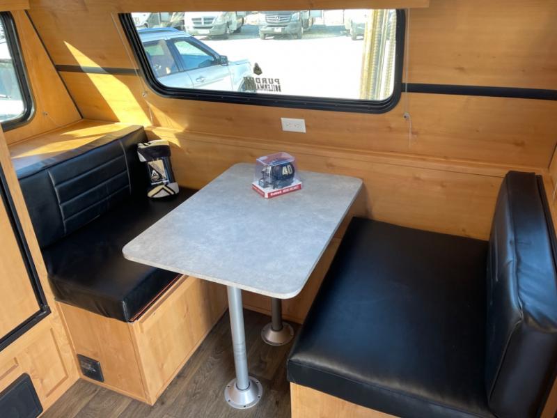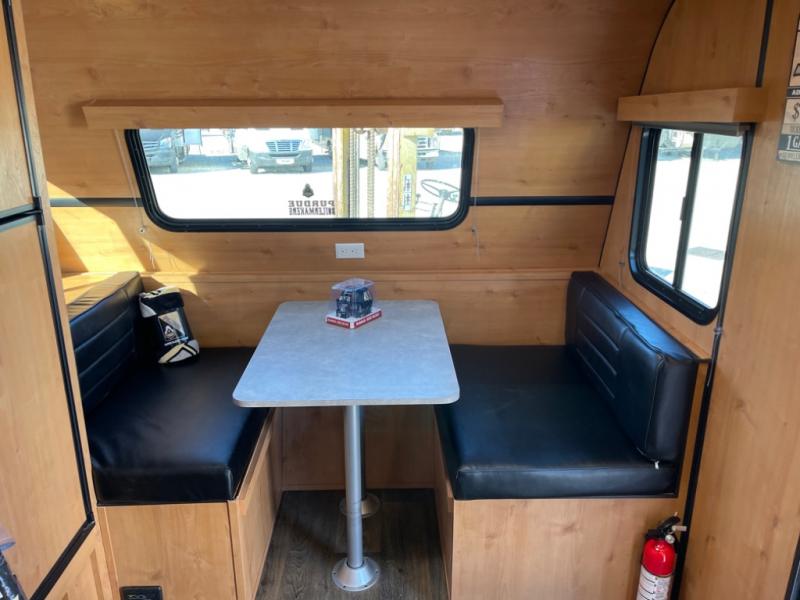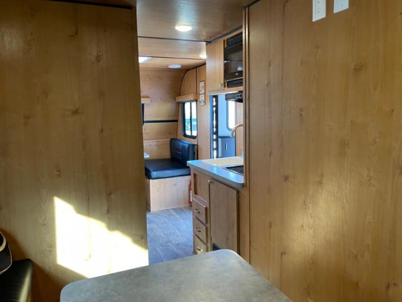 Whether you travel to festivals, RV parks, or local camp grounds, your trailer will be talked about! The exterior style of yesterday makes it noticeable! You will love this couples trailer yet you can offer sleeping space on the front dinette for one more. The rear offers a walk-around 60" x 74" queen bed with dual bedside closets, making this spacious and comfortable to get to the dry bath at night. The cook will have a microwave to easily make a meal and a two-burner cooktop, plus the 6 cu. ft. refrigerator to hold the cold items.