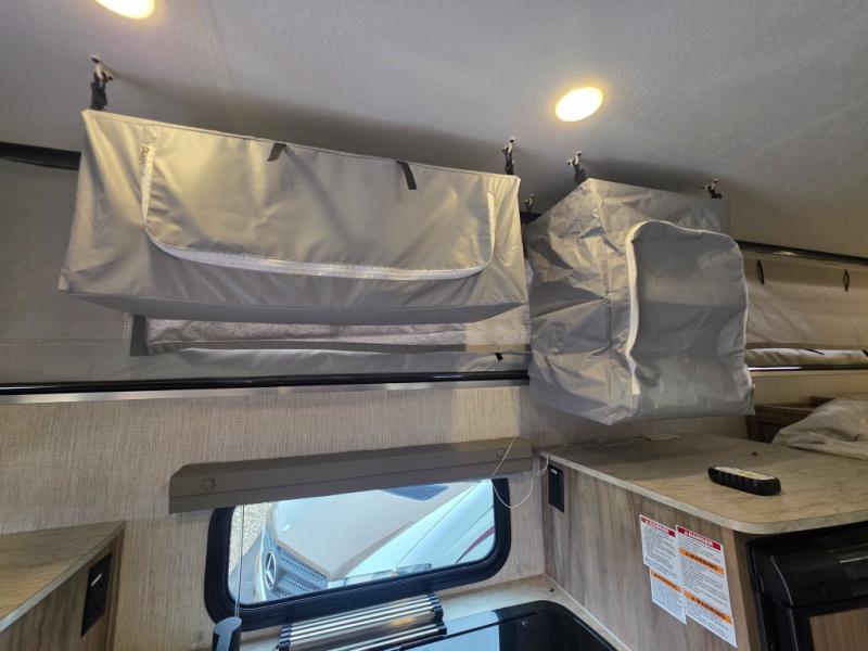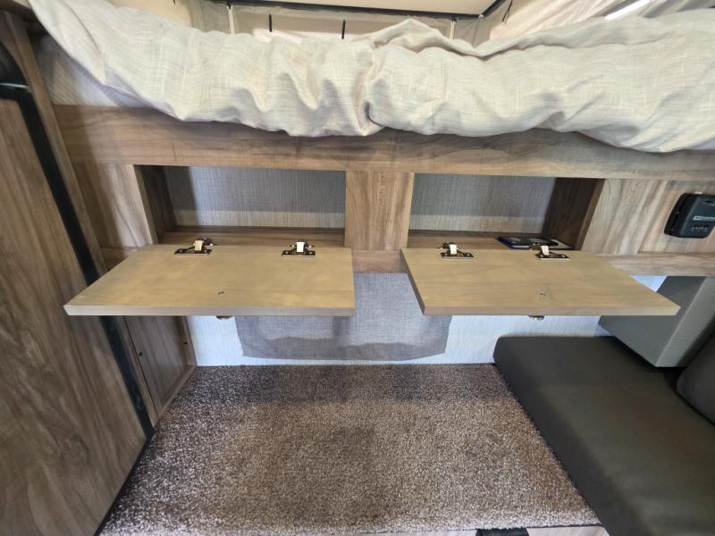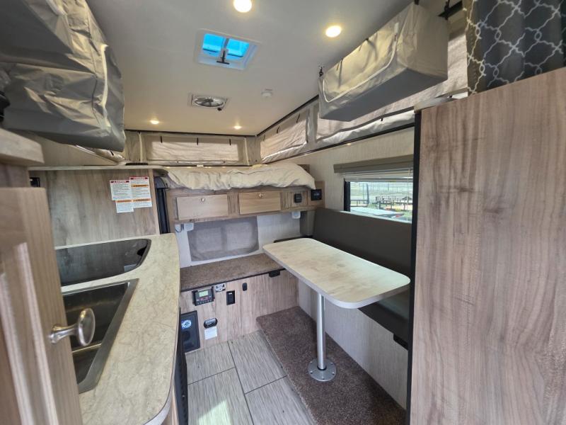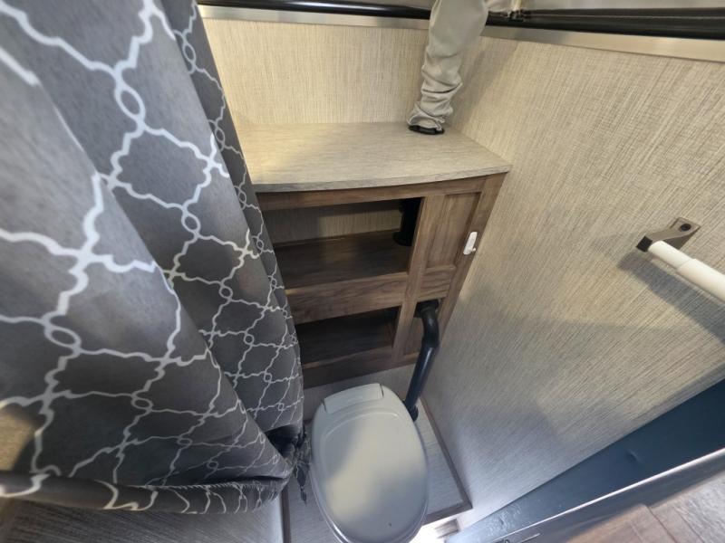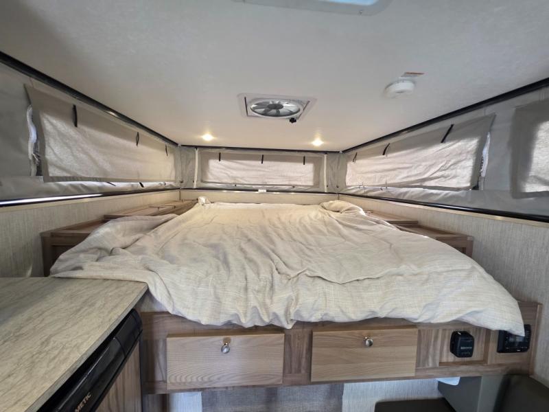 An electric roof lift with a remote will make setting up this soft side truck camper easy! Lay your head at night on the front queen bed with foot lockers and bedroom storage on either side of it to keep your items out of the way. Prepare your best meals with the two burner cooktop, store your canned goods in the pantry, and keep your beverages cold in the three way-refrigerator. The seating area comes with a table so you can enjoy your meals comfortably. There is also a wardrobe behind the private toilet for you to store your toiletries.
