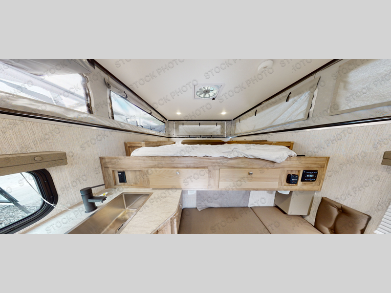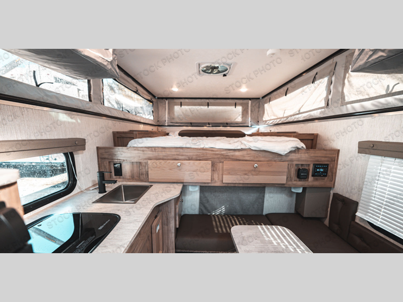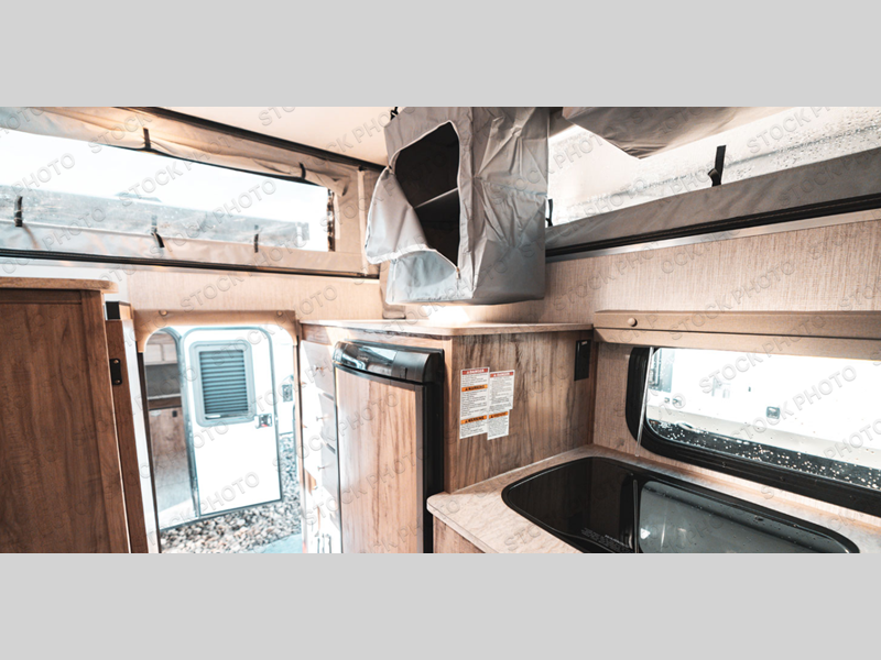 Make the most of all your adventures with this soft side truck camper! Start each morning feeling recharged after sleeping on the front queen bed with foot lockers and bedroom storage on either side of it, and freshen up in the wet bath with storage to keep your towel nearby. There is storage across from the bathroom for your canned goods, a three way refrigerator to keep your perishables fresh, and a two burner cooktop to prepare your best meals. Enjoy your meals at the seating area with a table then grab a board game from the storage area under the seating!