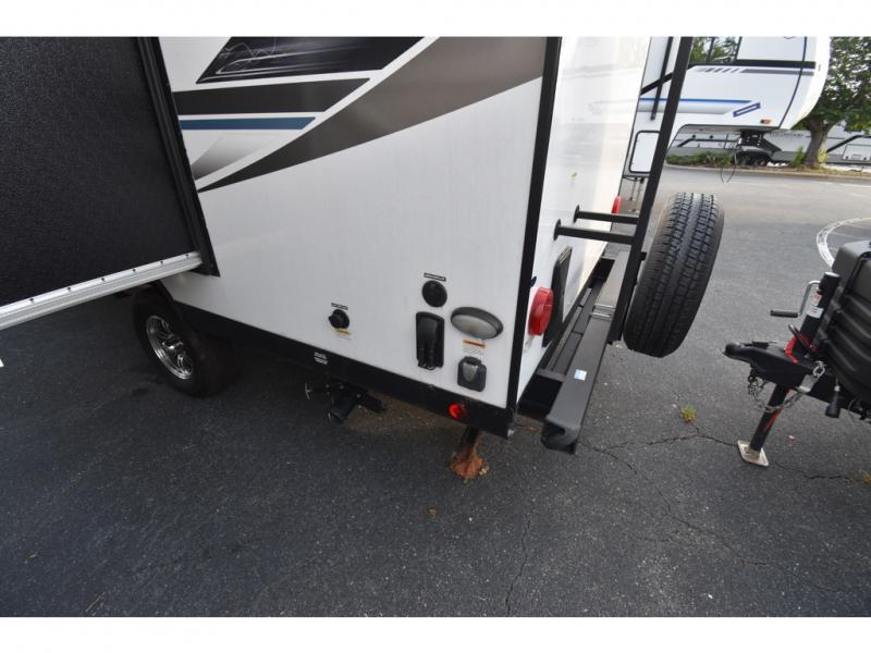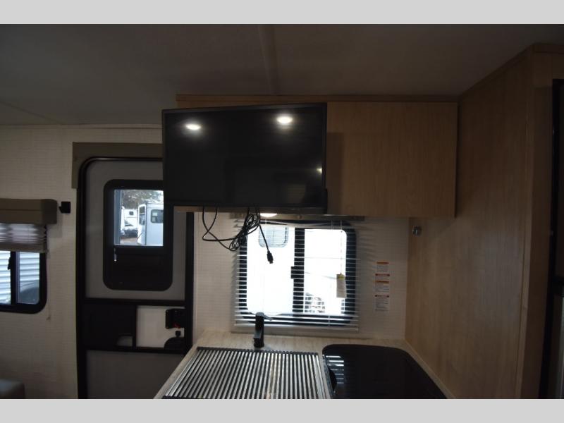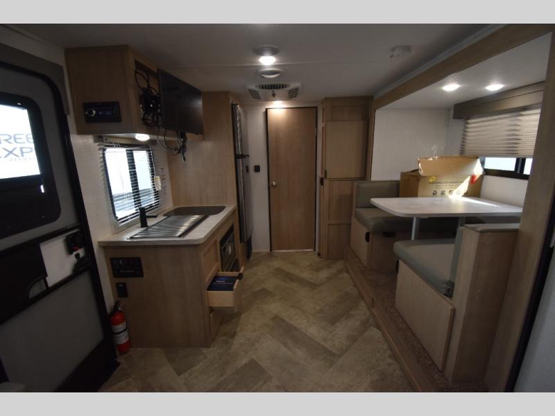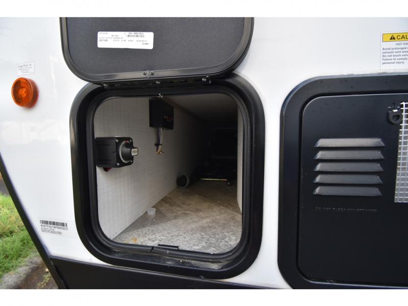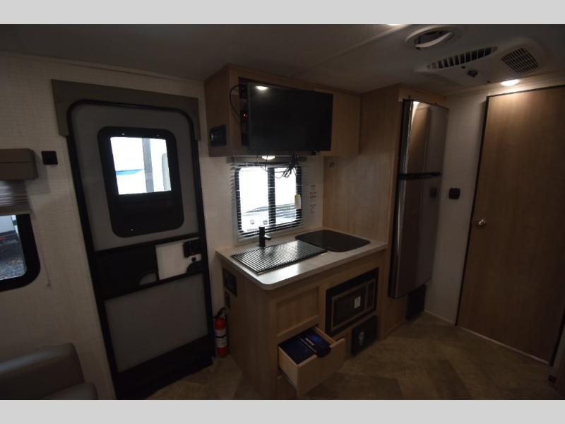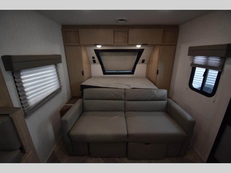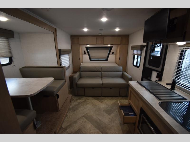 Head to your favorite spot with your favorite person in this travel trailer! The front Murphy bed offers versatility with a sofa to sit on during the day and a 60" x 80" queen bed to sleep on at night, plus there are wardrobes on either side for your clothes. Prepare your best home cooked meals with the two burner cooktop, 10 cu. ft. refrigerator, and even the microwave then enjoy them at the 38" x 70" booth dinette slide which can be transformed into an extra sleeping space. You even have an entertainment center for those days when mother nature rains on your parade. The full rear bathroom has a 32" x 32" radius shower to clean up in after a fun day at the beach and a linen closet to keep your towels close. The exterior has a 14' power awning with LED lights to highlight the good times and front outside storage to bring all of your camping necessities!