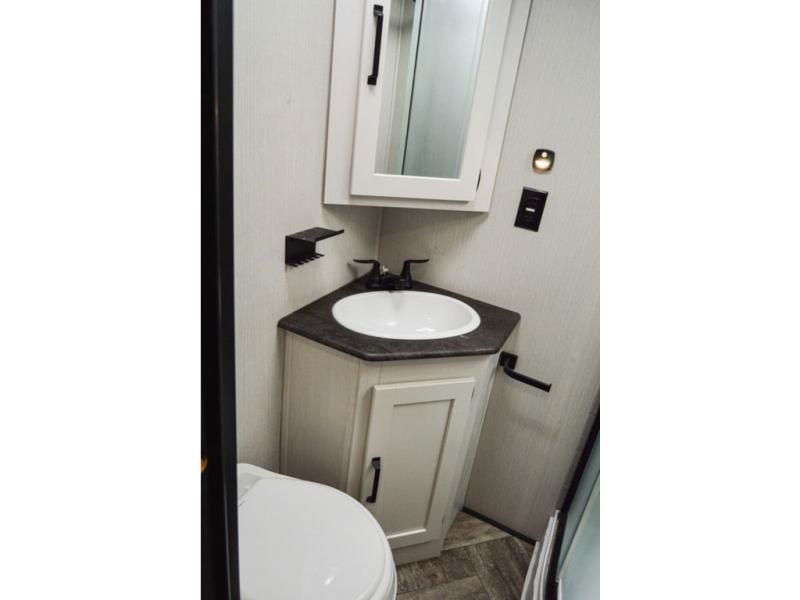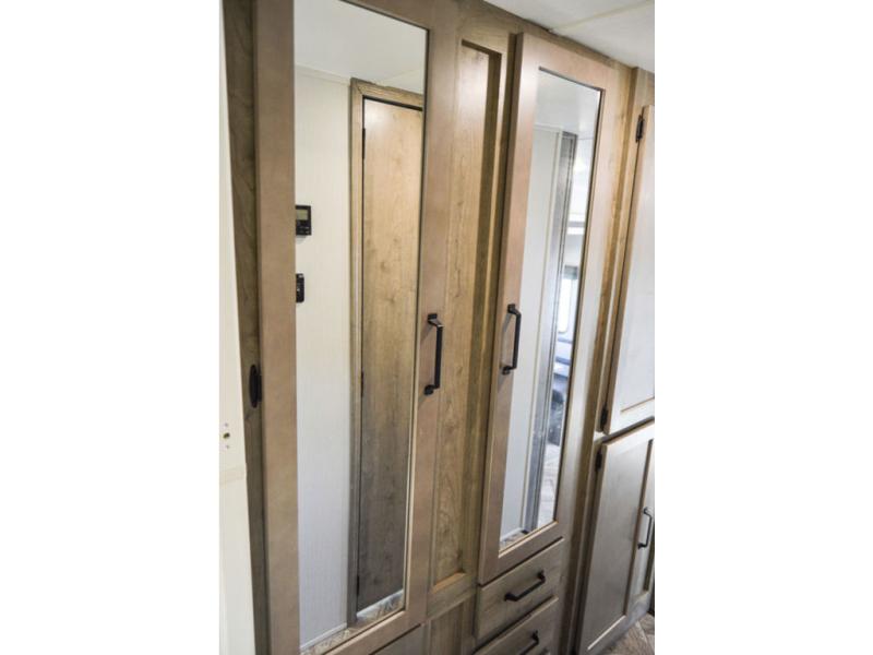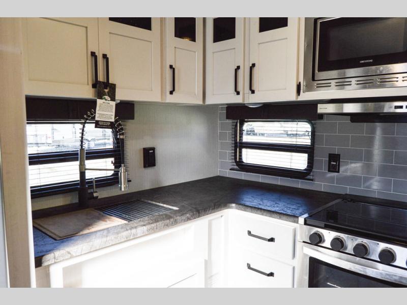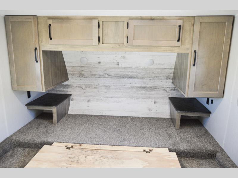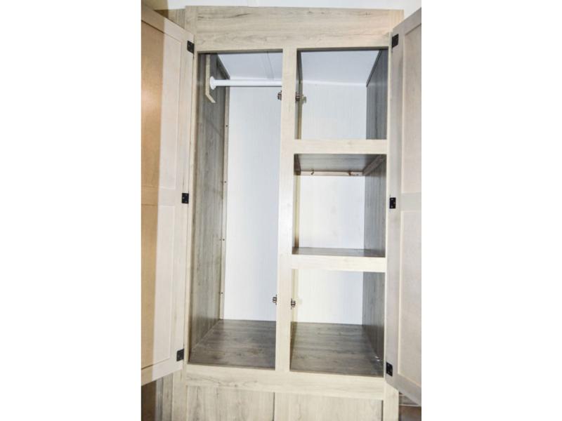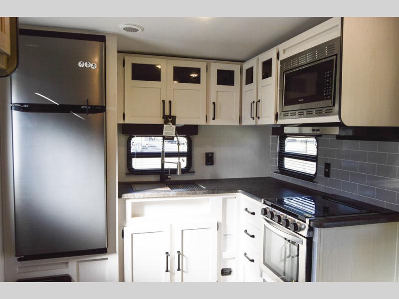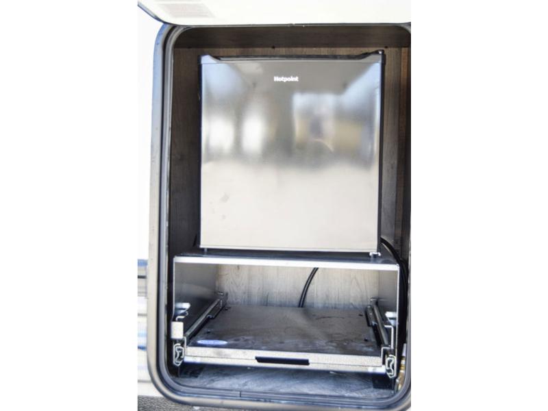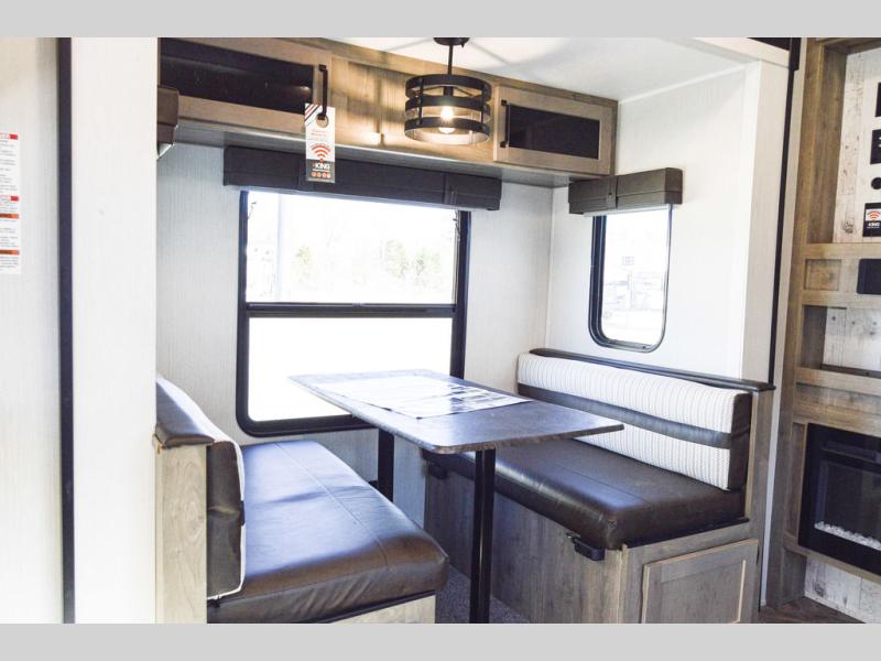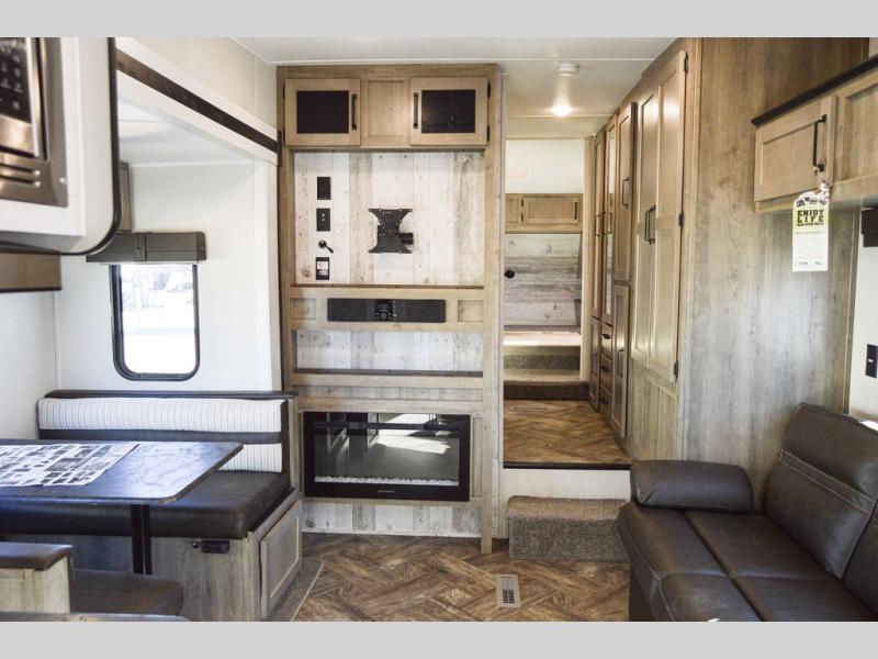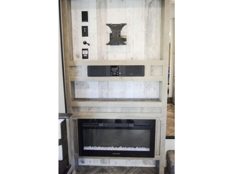 The chef will love cooking in this fifth wheel with the rear kitchen! The booth dinette slide is not only great for enjoying meals and playing card games, but also for transforming into an extra sleeping space if needed. Draw the privacy curtain to create a front private bedroom with a queen bed that has shirt closets on either side. There is plenty of storage throughout the inside between the pantry, the closet, the linen closet, and the wardrobe. Also, you may want to add the optional fireplace for a more cozy area!