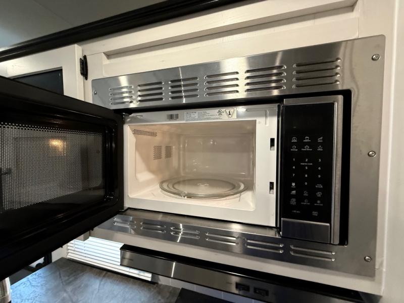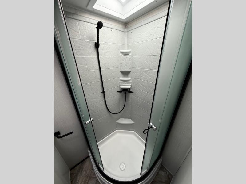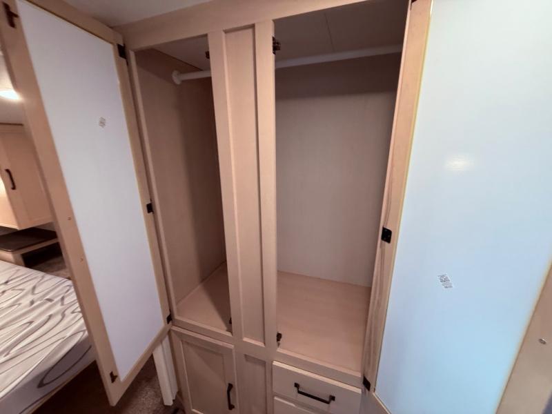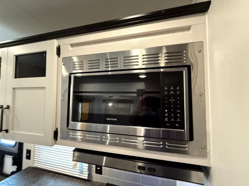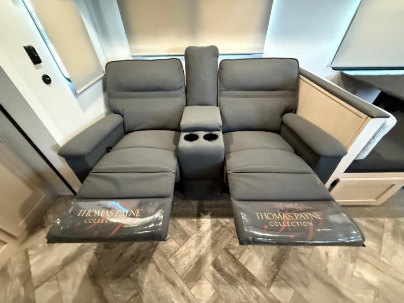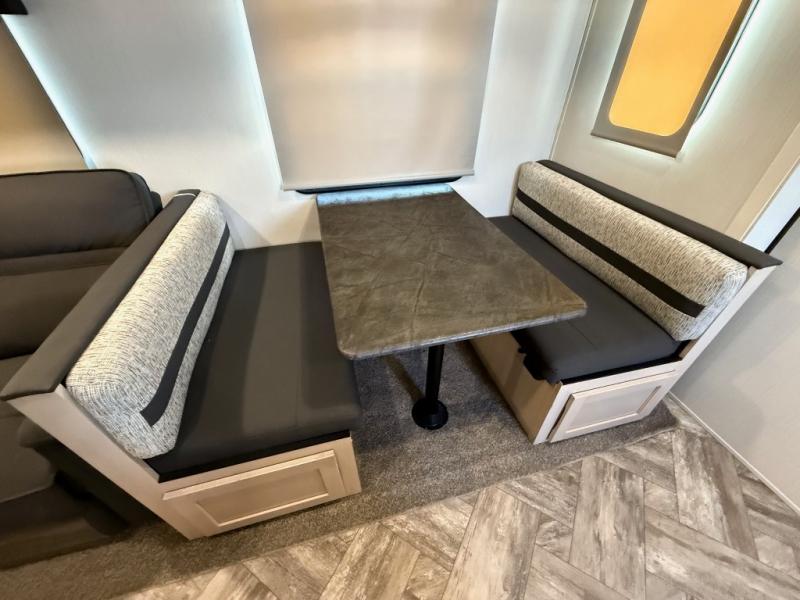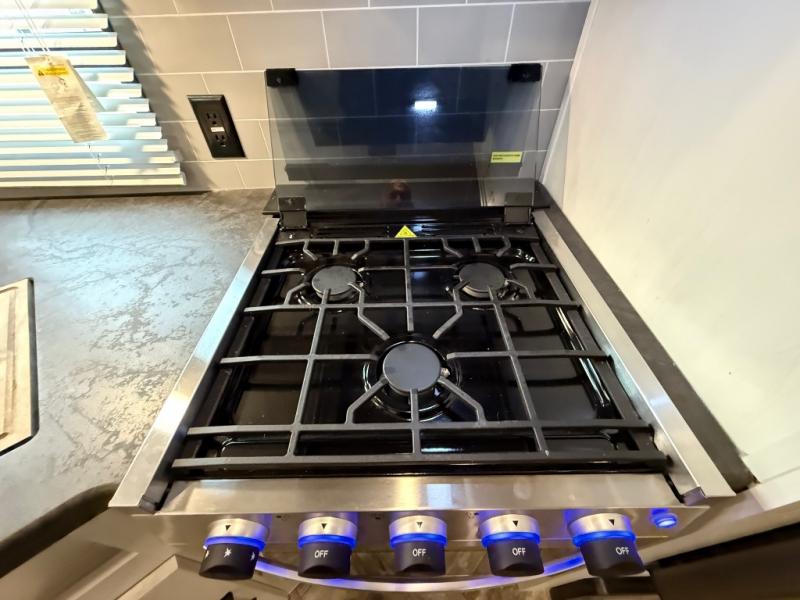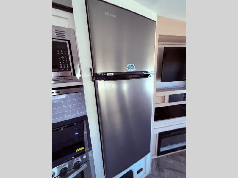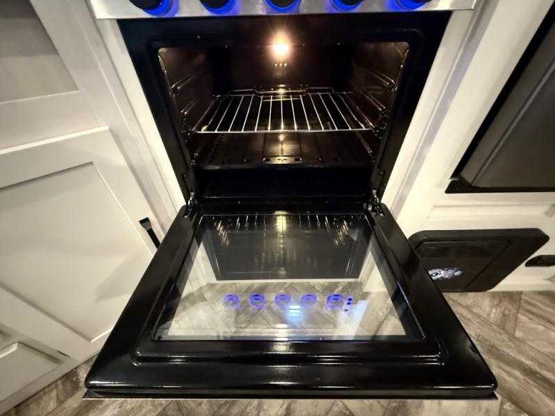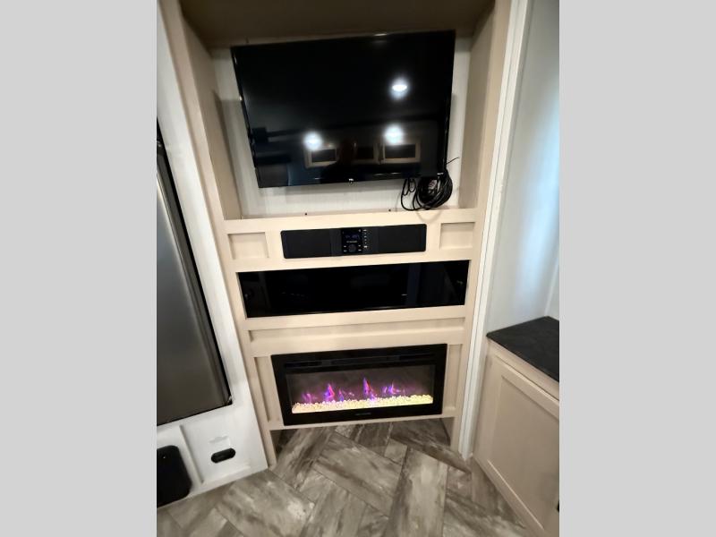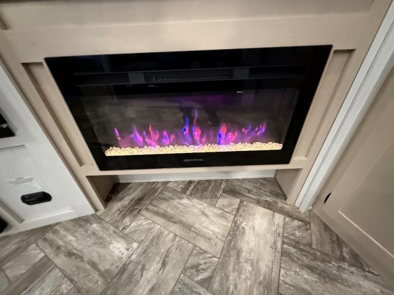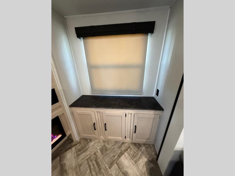 You will feel right at home in this fifth wheel! Grab a snack from the large kitchen pantry, turn on your favorite movie with the entertainment center next to it, and then head to the sofa for a relaxing movie night. You can play a few card games at the booth dinette while you wait for dinner to cook in the 21" stainless steel oven. You may even like to add the optional fireplace to enjoy cool fall evenings indoors. Clean up after a fun day at the beach with the 32" x 32" radius shower in the full bathroom, and then lay down on the queen bed in the front private bedroom with a privacy curtain to draw!