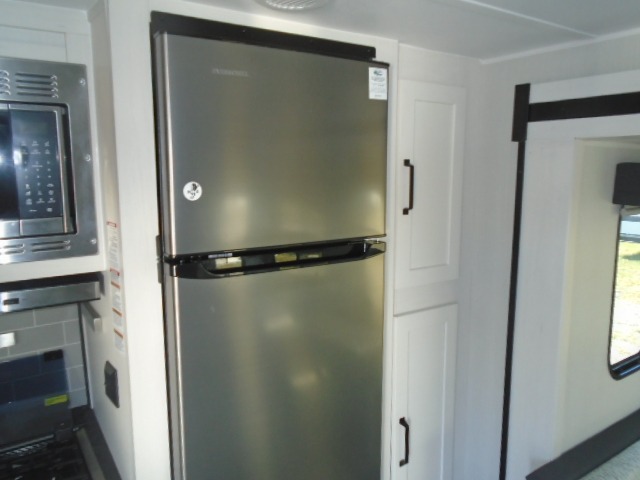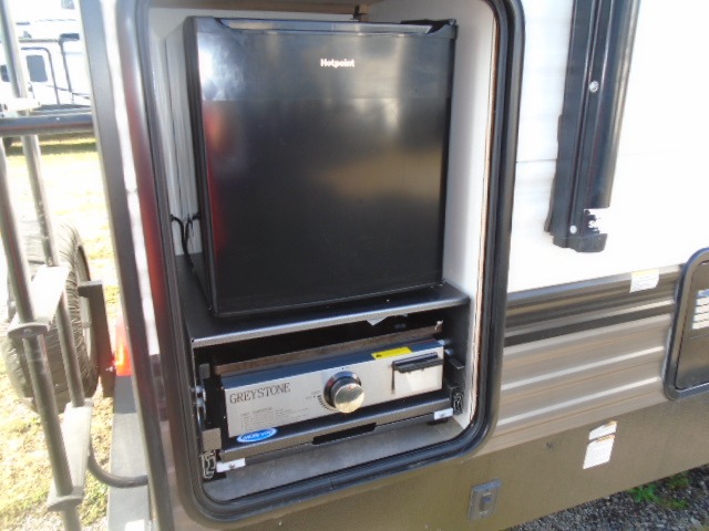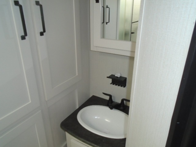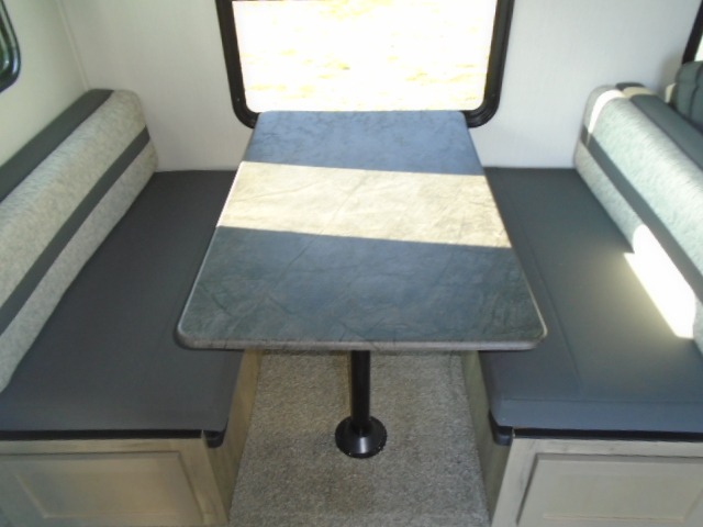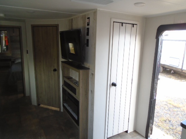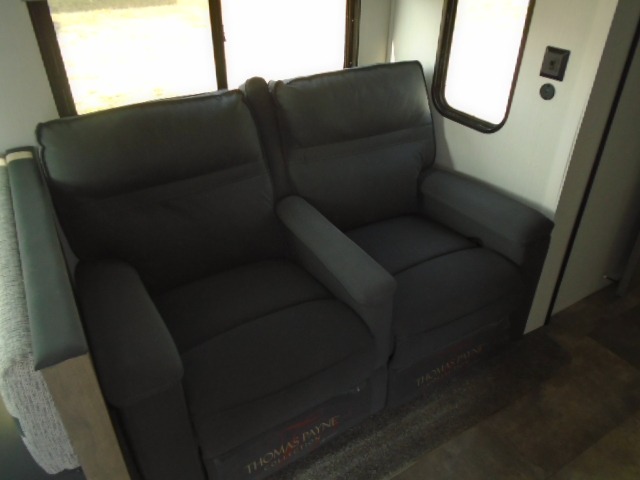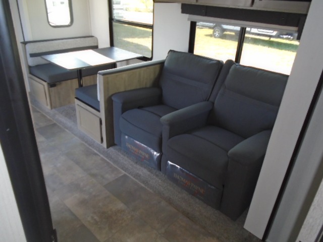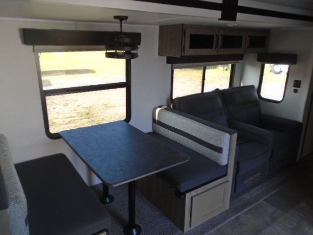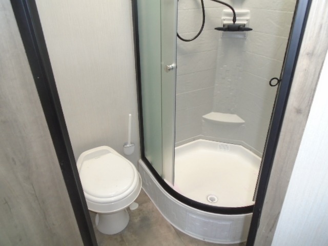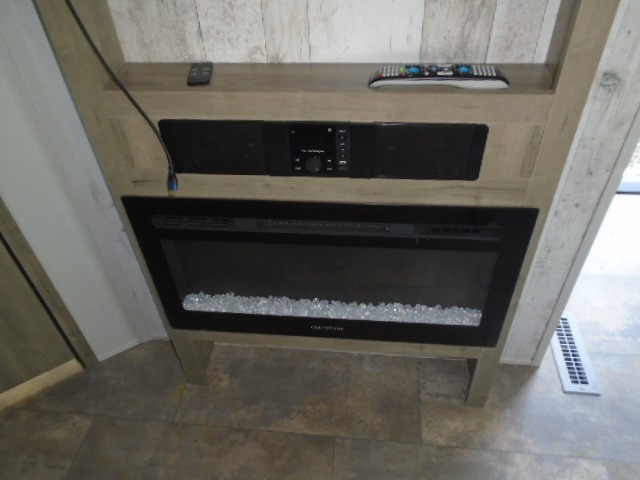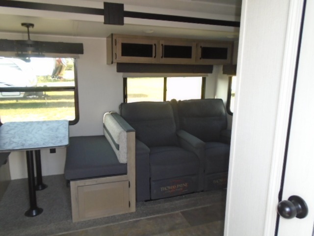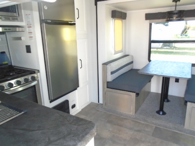 The chef will love cooking in the rear kitchen of this travel trailer! The booth dinette offers a comfortable place to dine, play, and even sleep. Take an afternoon nap on the sofa and watch your favorite movies at night with the entertainment center, and you may want to add the optional fireplace here to make it feel more like home. Start your mornings off feeling fresh by showering in the full bathroom with the 34" x 34" radius shower after getting a good night's rest on the queen bed in the front private bedroom!