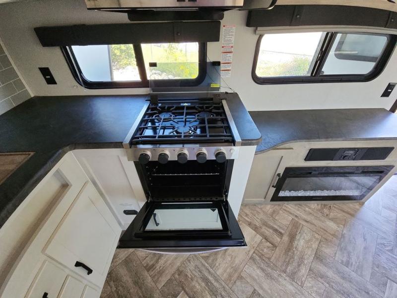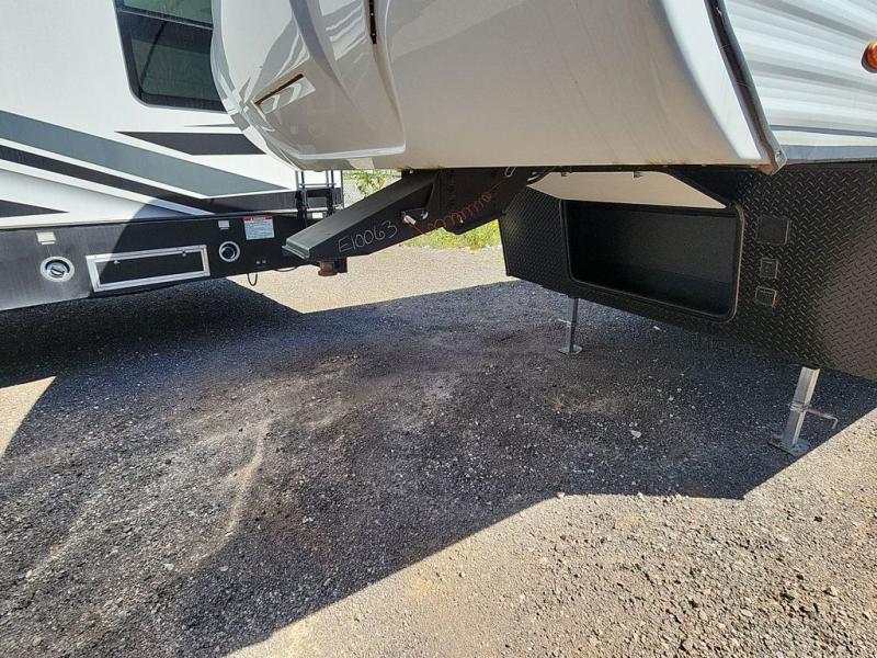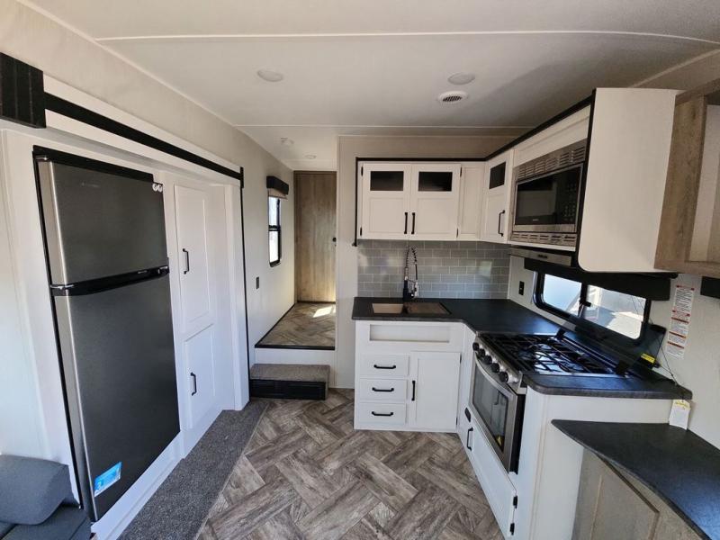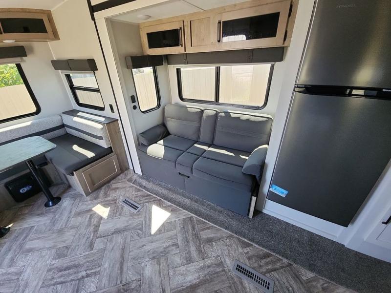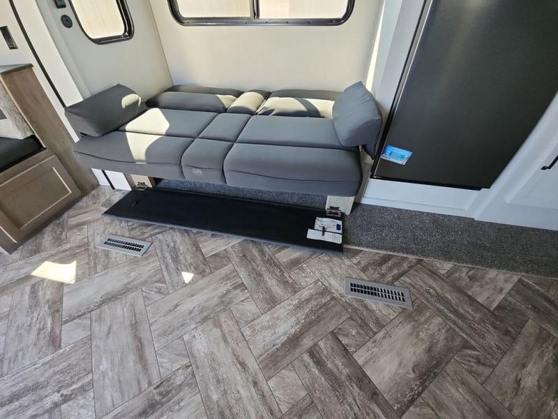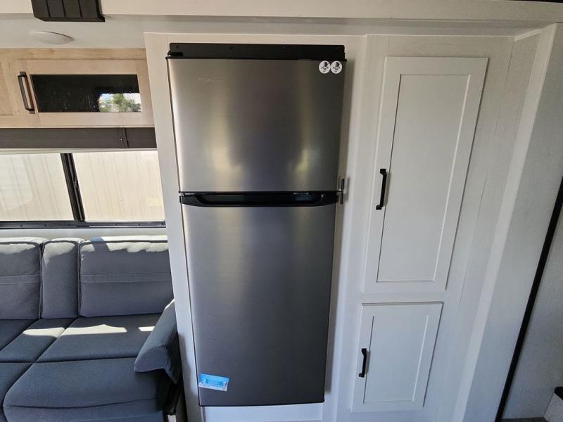 Start going on adventures with your favorite person in this fifth wheel! It features a front private bedroom with a queen bed that has shirt closets and nightstands on either side to set your glass of water. You can freshen up each morning in the full bathroom with the 32" x 40" shower with a seat and then head to the kitchen to fry up some eggs on the three burner cooktop or cook cinnamon rolls in the 21" stainless steel oven. The sofa is a comfortable place to take an afternoon nap and to watch your favorite movies at night. Dine, play, and even sleep at the rear U-shaped dinette!