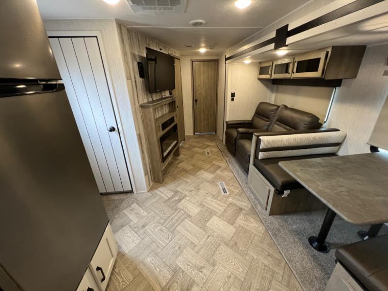 Walk into this travel trailer with one of the dual entry doors for a great camping trip! One entrance enters directly into the rear private bedroom which has a queen bed slide, a walk-in closet that is prepped for an optional washer and dryer, a wardrobe, and even an entrance into the dual entry bathroom. Grab a snack from the walk-in pantry then relax on the sofa while you watch a movie with the entertainment center or play a game at the booth dinette. The front kitchen has everything you will need to prepare your best home cooked meals including lots of countertop space, a three burner cooktop, and a residential refrigerator!