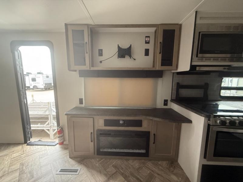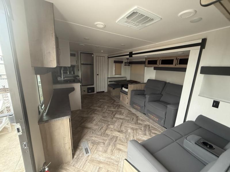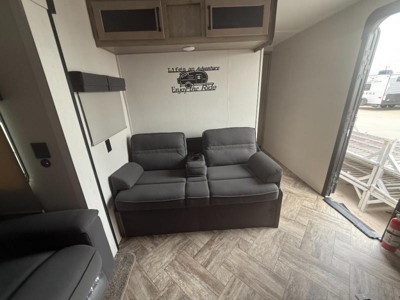 Pick your favorite camping spot and hitch this travel trailer up for a great weekend getaway! The rear kitchen has a three burner cooktop to prepare your best meals, an 11 cu. ft. stainless steel refrigerator to keep your perishables fresh, and a walk-in pantry for your canned goods and snacks for movie night. After a fun day at the beach, you can play a card game at the booth dinette, relax in either one of the two recliners and sofa, or rinse the sand out of your hair in the 32" x 40" shower with a seat in the full bathroom. There is also a front private bedroom with a queen bed to lay your head on at night, and dual shirt closets to keep your clothes tidy!