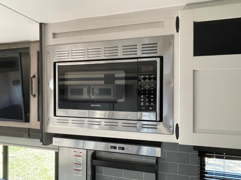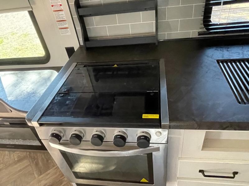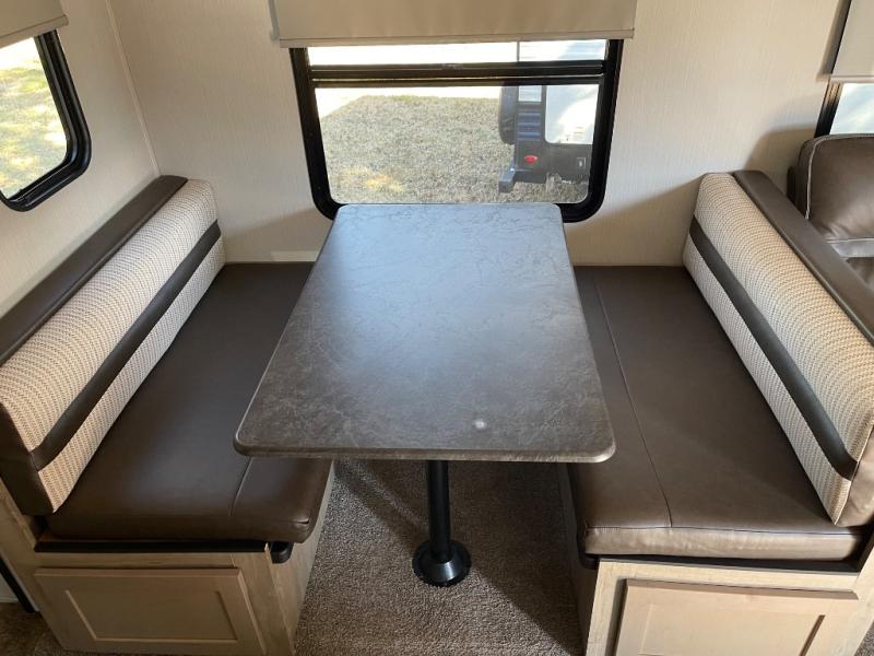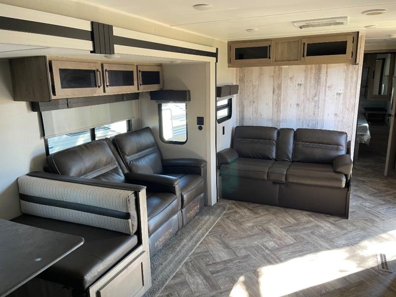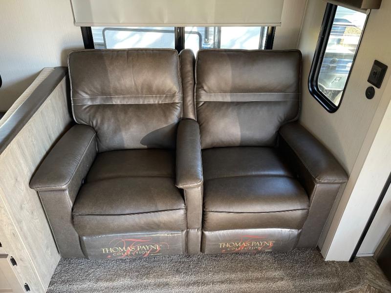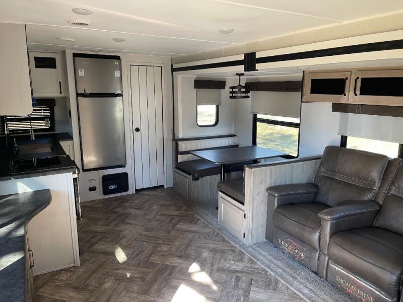 Pick your favorite camping spot and hitch this travel trailer up for a great weekend getaway! The rear kitchen has a three burner cooktop to prepare your best meals, an 11 cu. ft. stainless steel refrigerator to keep your perishables fresh, and a walk-in pantry for your canned goods and snacks for movie night. After a fun day at the beach, you can play a card game at the booth dinette, relax in either one of the two recliners and sofa, or rinse the sand out of your hair in the 32" x 40" shower with a seat in the full bathroom. There is also a front private bedroom with a queen bed to lay your head on at night, and dual shirt closets to keep your clothes tidy!