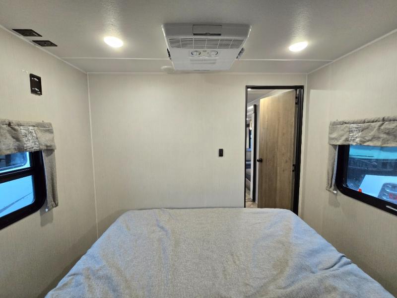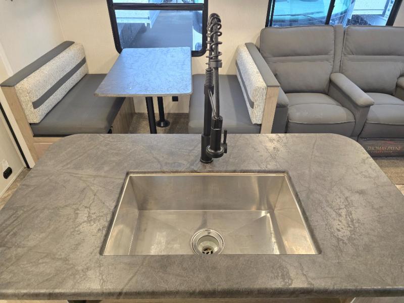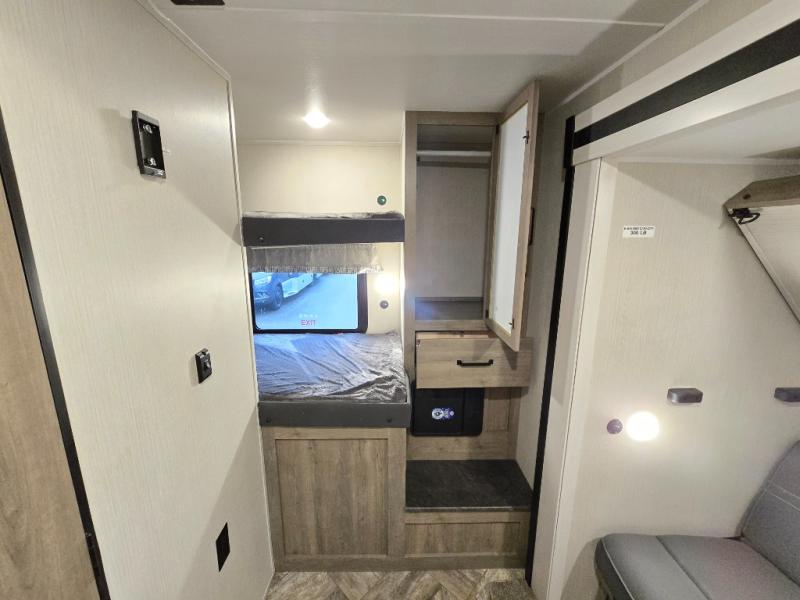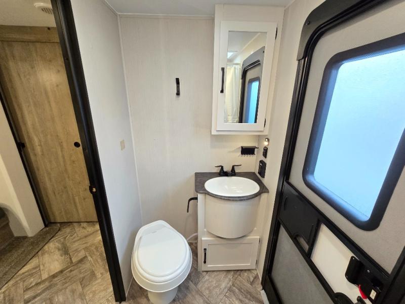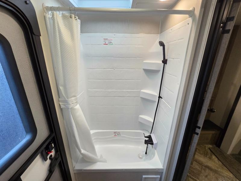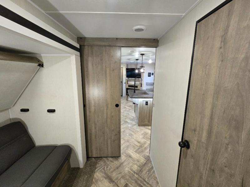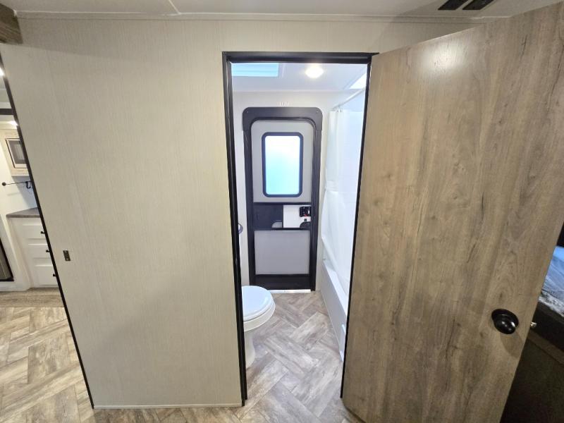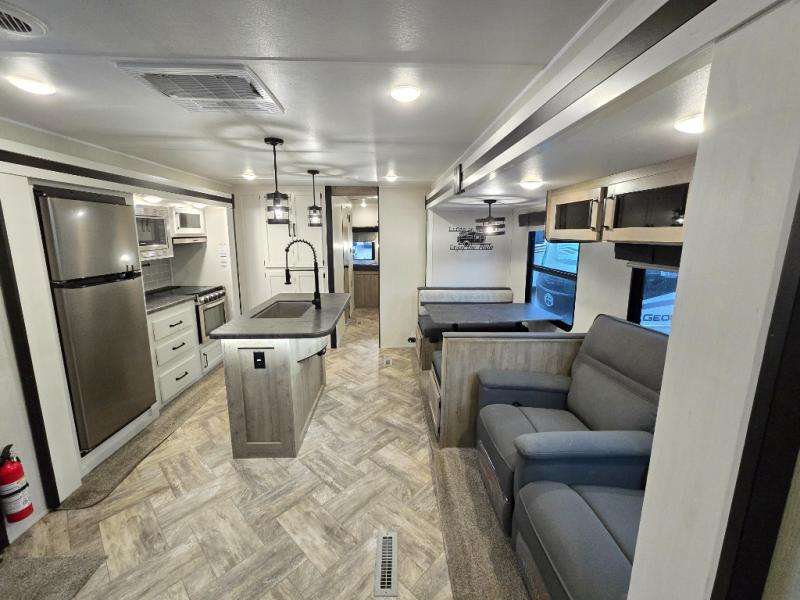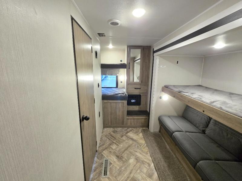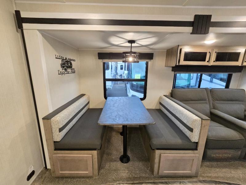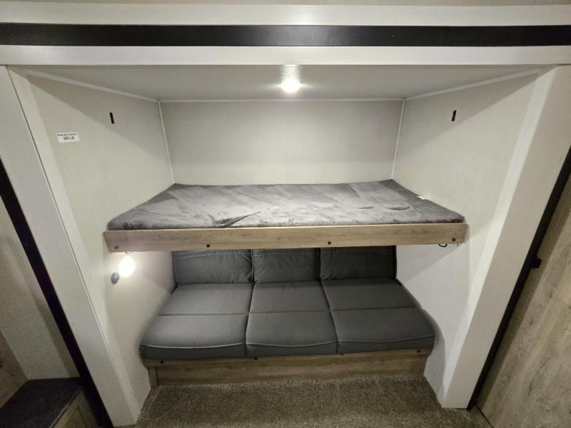 With two full bathrooms, it's a clean decision to take this travel trailer on your next family vacation! Start each morning feeling recharged after sleeping on the queen bed in the front private bedroom or in the rear private bunkhouse with an angled top bunk above a 32" x 69" double bunk bed and a 32" x 69" bunk above a 68" sofa slide. The bunkhouse also has a full bathroom with a 24" x 40" tub and one of the dual entry doors to the unit. You can relax on the sofa while enjoying the entertainment center and eat your meals prepared with the kitchen island at the booth dinette.
