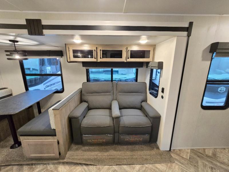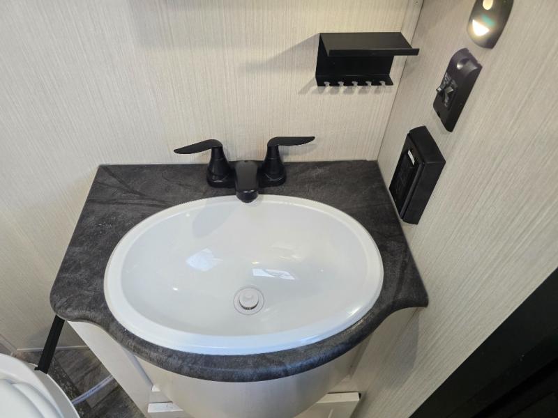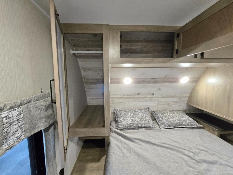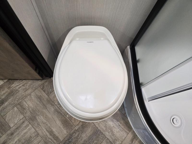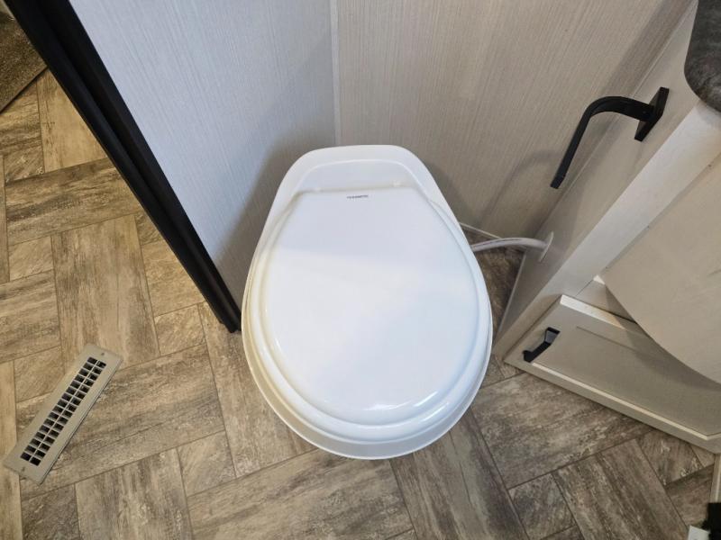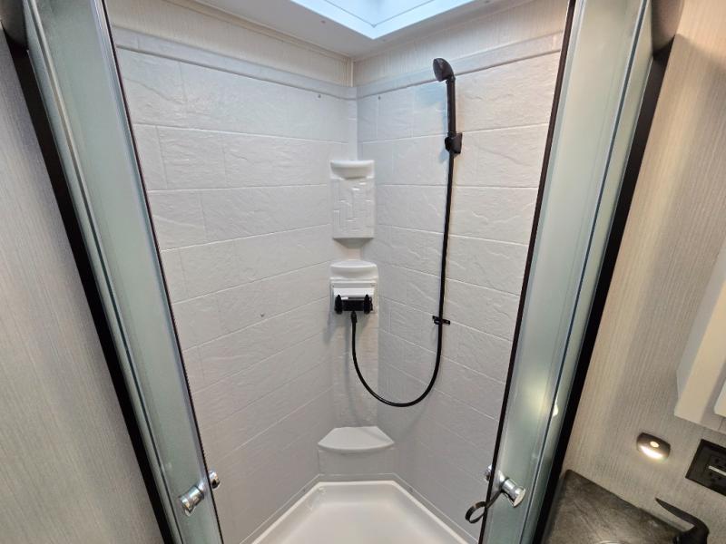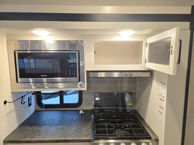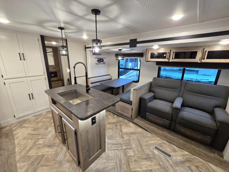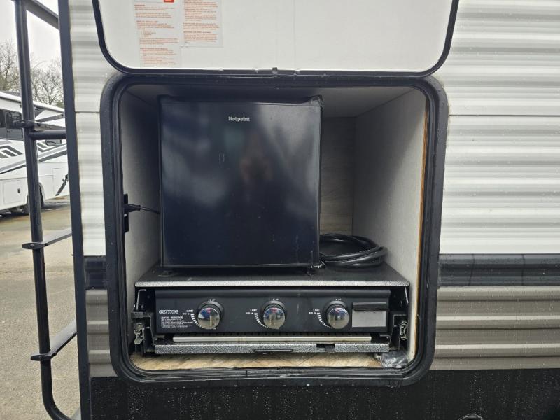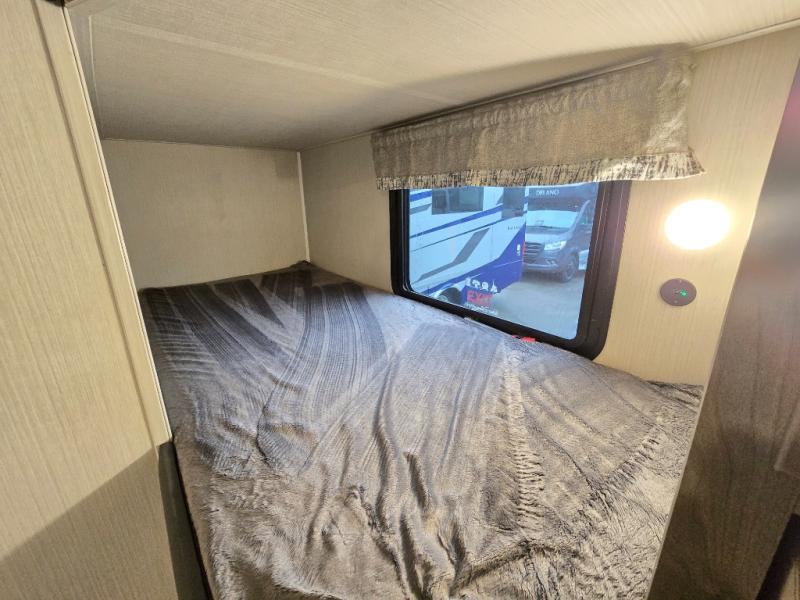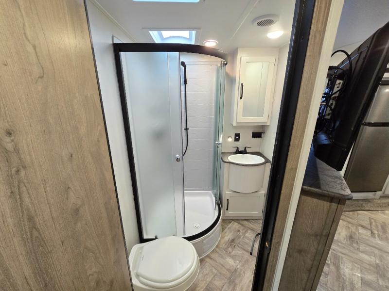 With two full bathrooms, it's a clean decision to take this travel trailer on your next family vacation! Start each morning feeling recharged after sleeping on the queen bed in the front private bedroom or in the rear private bunkhouse with an angled top bunk above a 32" x 69" double bunk bed and a 32" x 69" bunk above a 68" sofa slide. The bunkhouse also has a full bathroom with a 24" x 40" tub and one of the dual entry doors to the unit. You can relax on the sofa while enjoying the entertainment center and eat your meals prepared with the kitchen island at the booth dinette.
