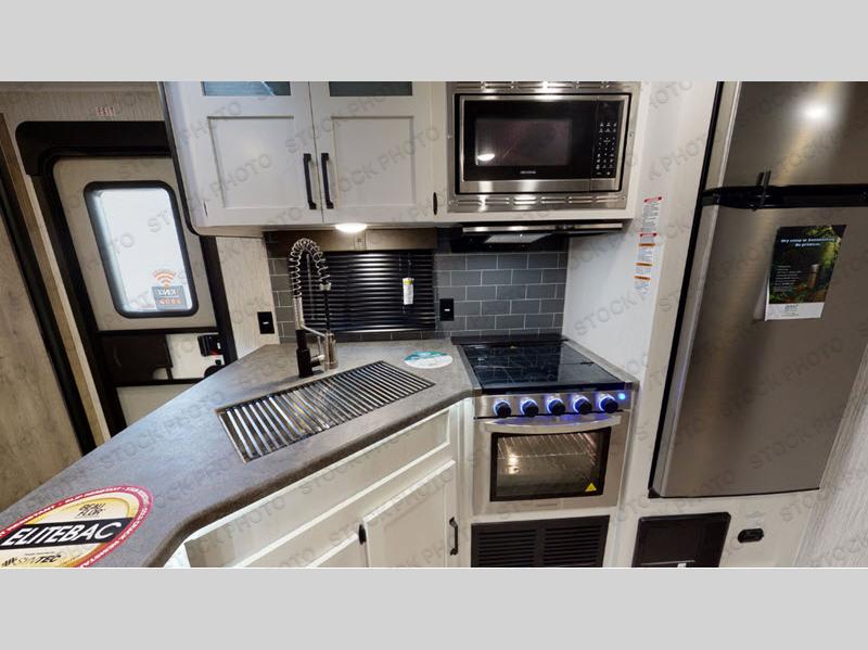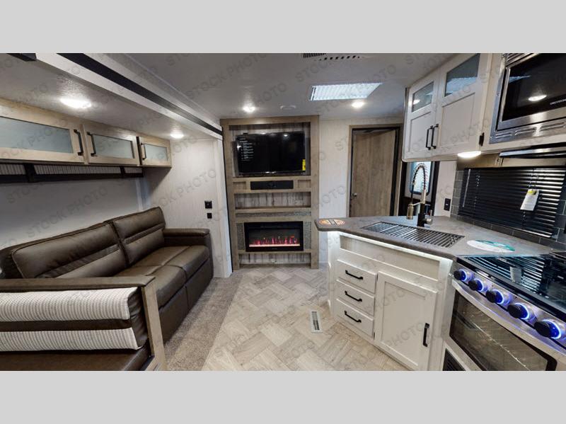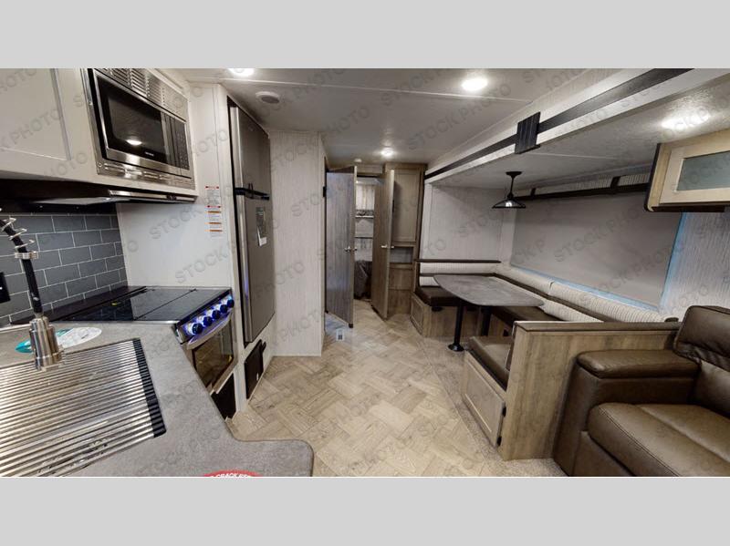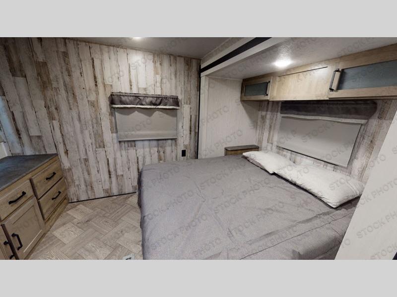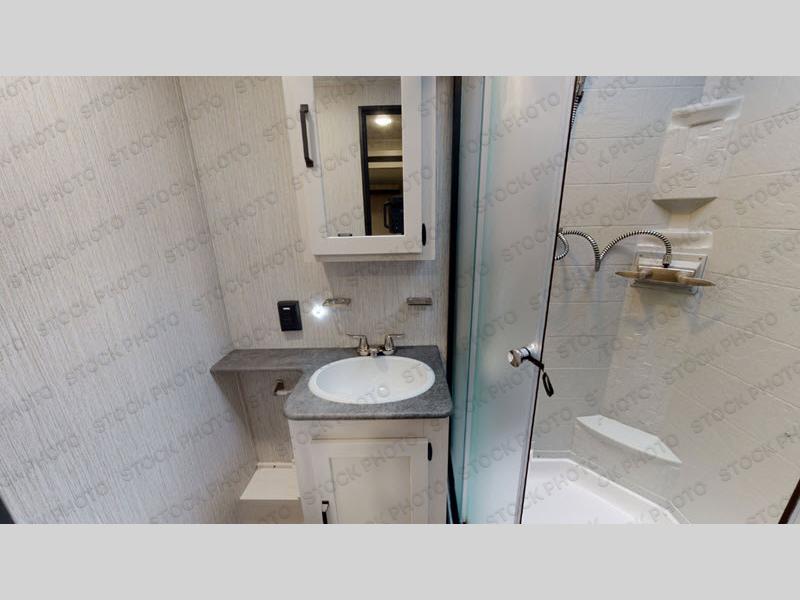 The whole family will love camping in this travel trailer! The kids will have their own privacy with the rear private bunkhouse which has a 32" x 69" bunk above a jiffy sofa slide and a 38" x 76" bunk above an entertainment center to keep them occupied on those rainy days. And you will have your own privacy with the front private bedroom that has a queen bed slide across from a dresser and a front closet with another closet next to it that is prepped to add an optional washer and dryer. Everyone can stay clean in the full bathroom with the 34" x 34" radius shower and their bellies full with a three burner cooktop.