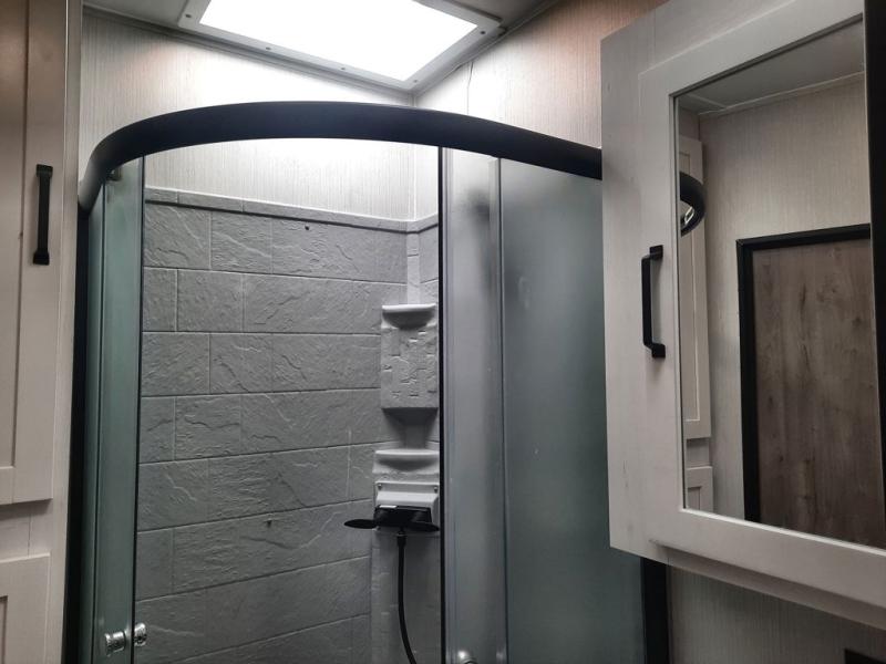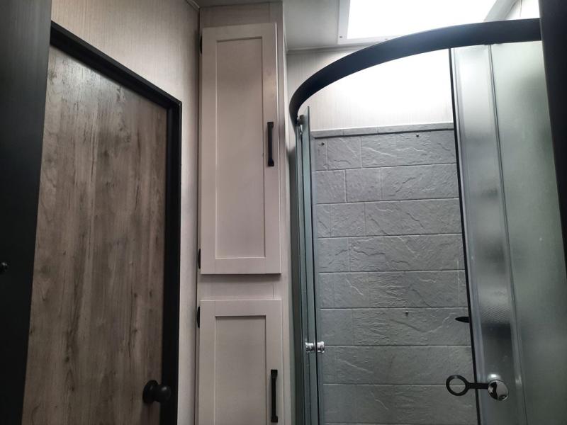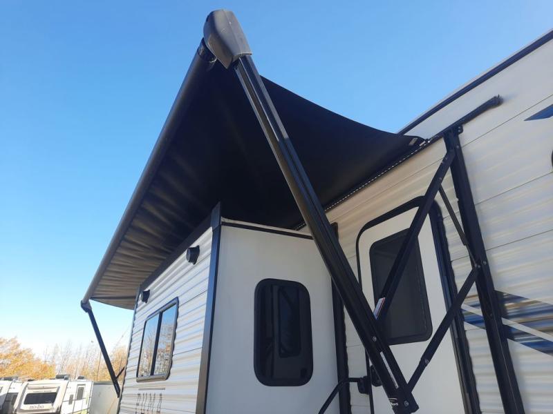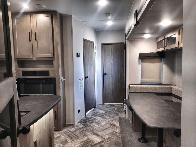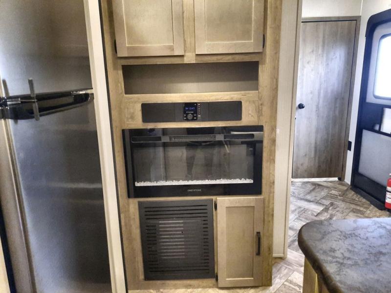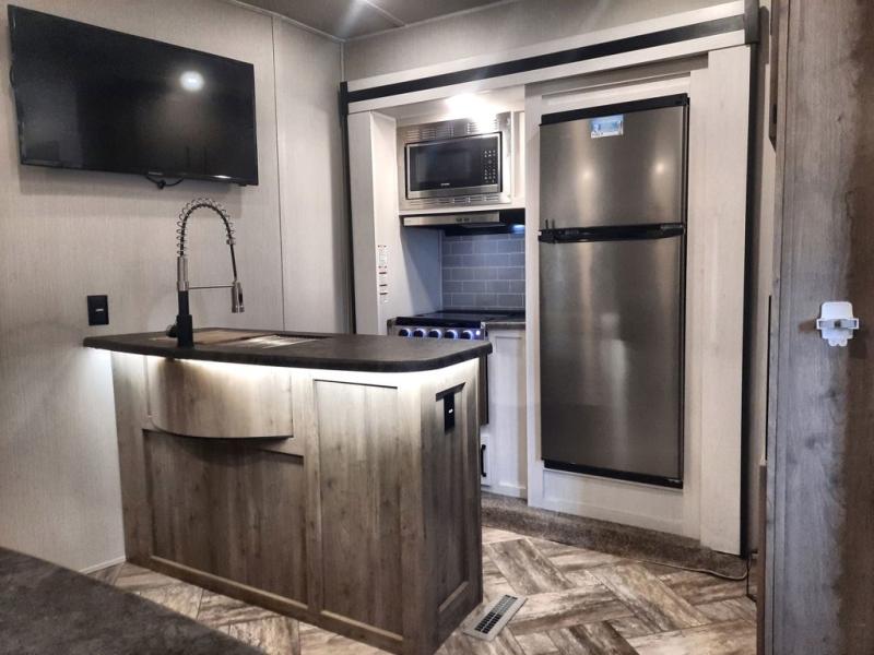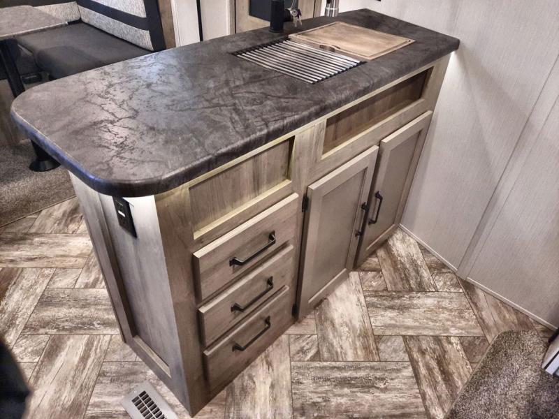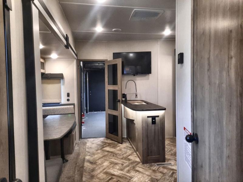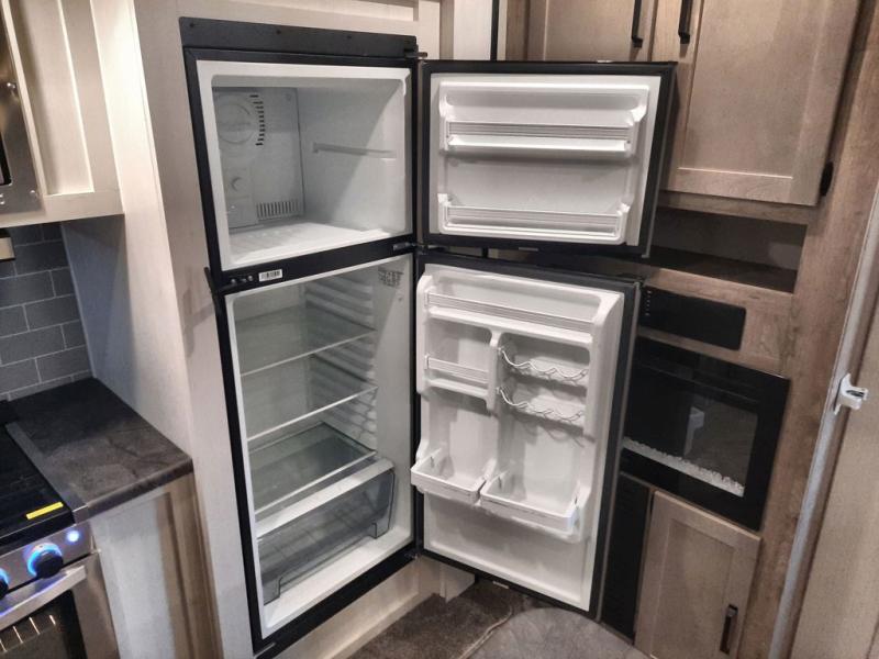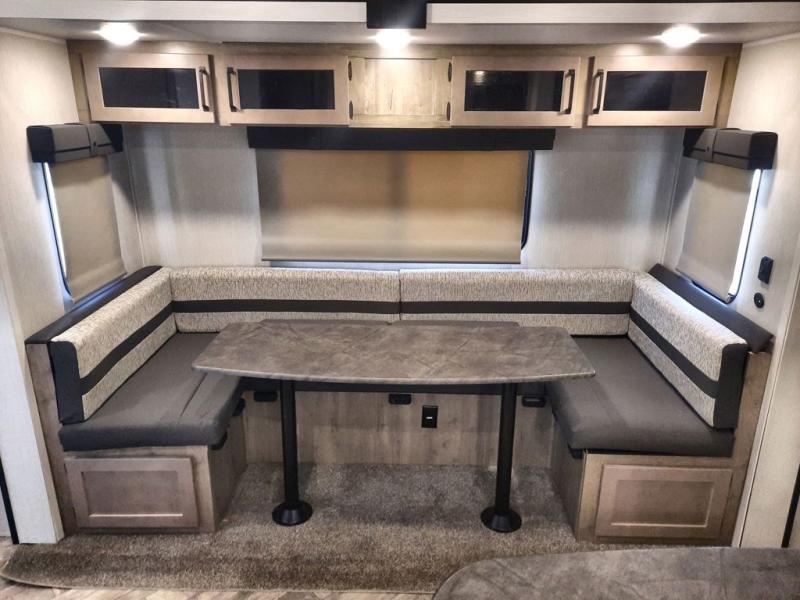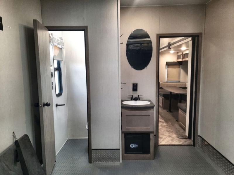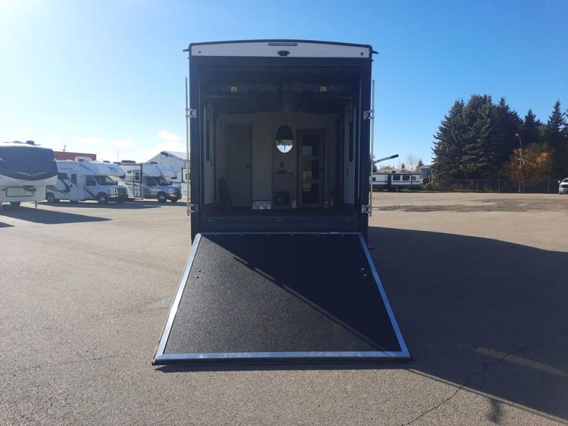 This toy hauler is big enough for your family and your favorite toys! The 7' 3" ramp door spring assist makes it easy to load them into the 12' garage area and once you have arrived you can set up the optional electric lift 60" x 74" queen bed. Prepare your best meals with the three burner cooktop and 11 cu. ft. stainless steel refrigerator, and you can enjoy them at the U-shaped dinette slide then play a card game and even transform it into an extra sleeping space. Freshen up in the full bathroom with a 32" x 32" shower after a fun day of riding the trails! And when you're ready for bed then head to the front private bedroom to enjoy a good night's rest on the queen bed with shirt closets and nightstands on either side!