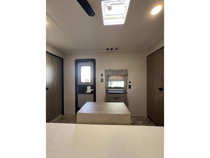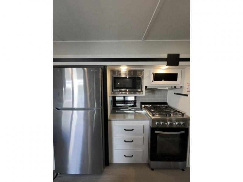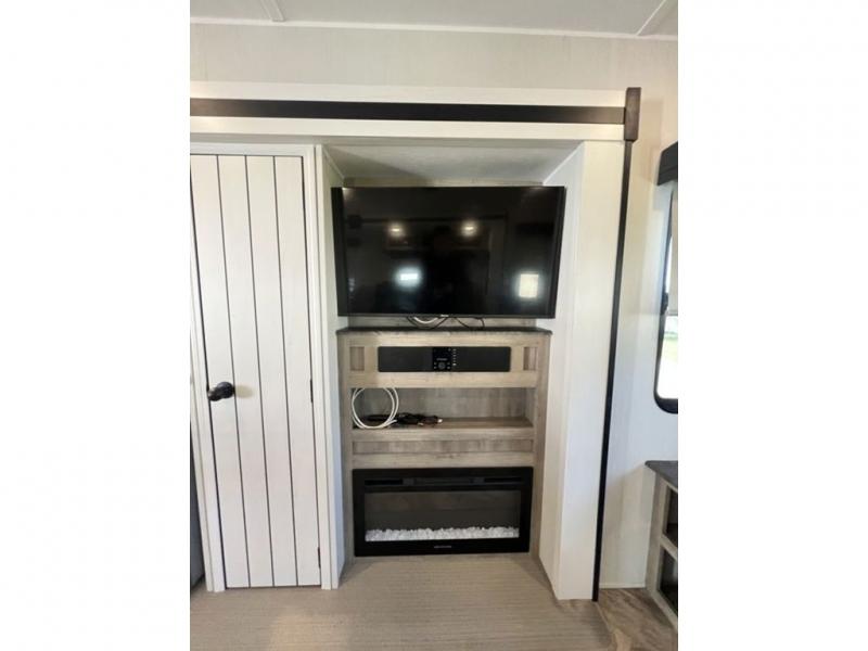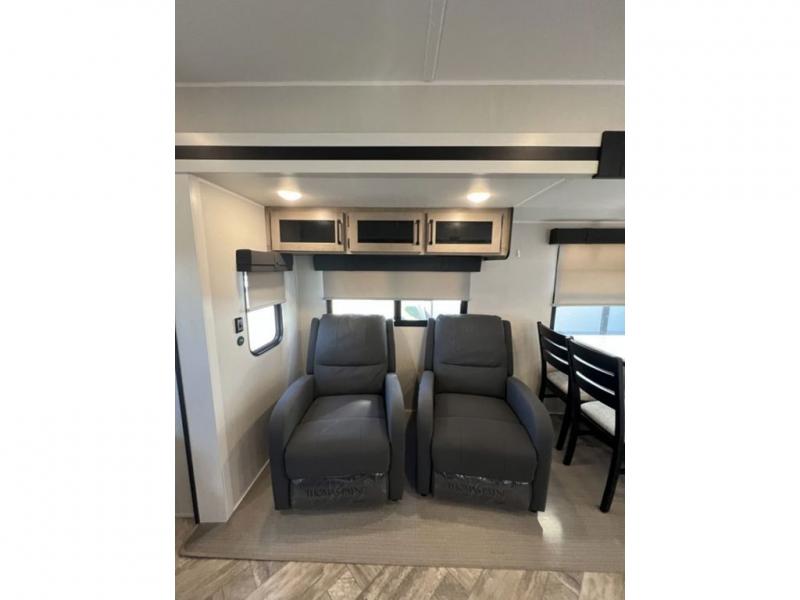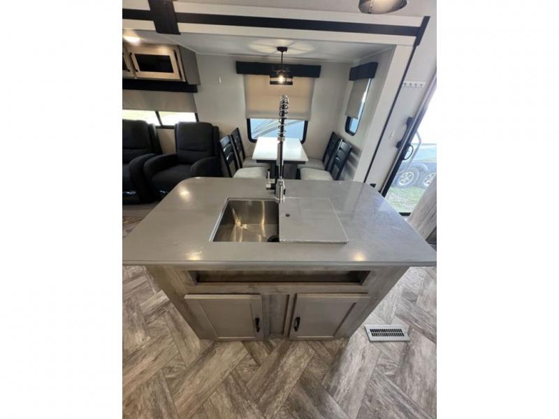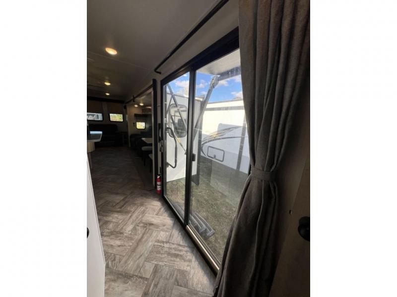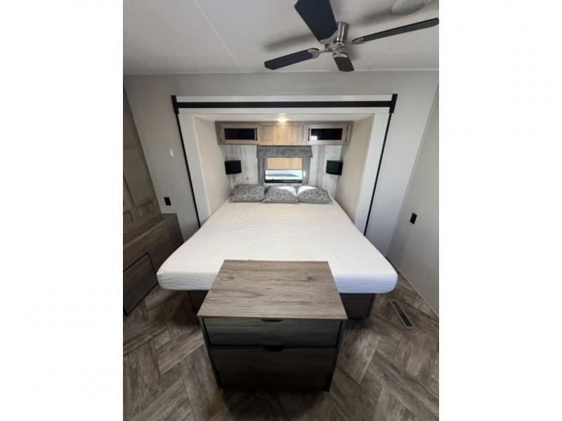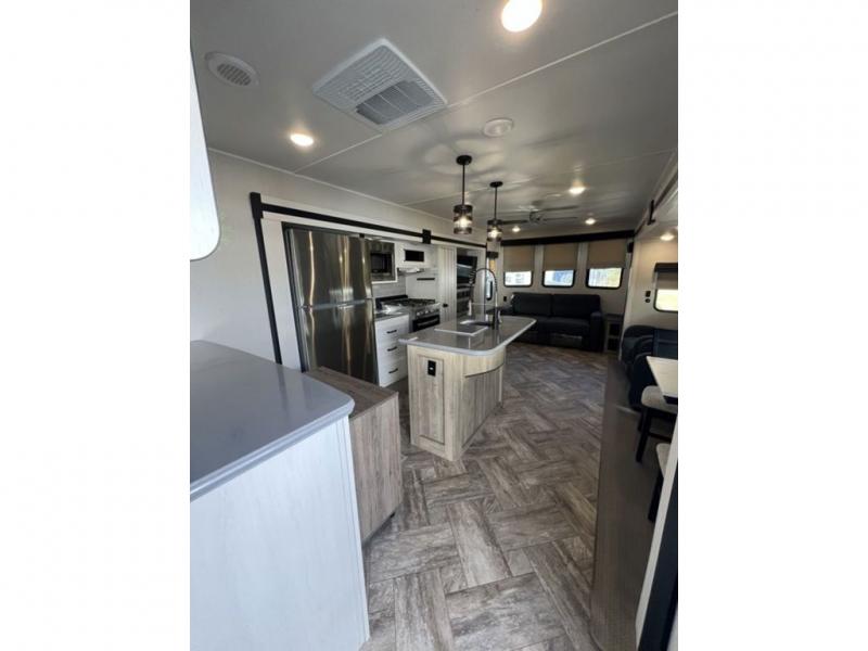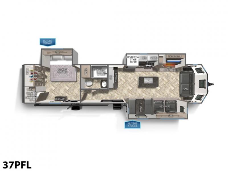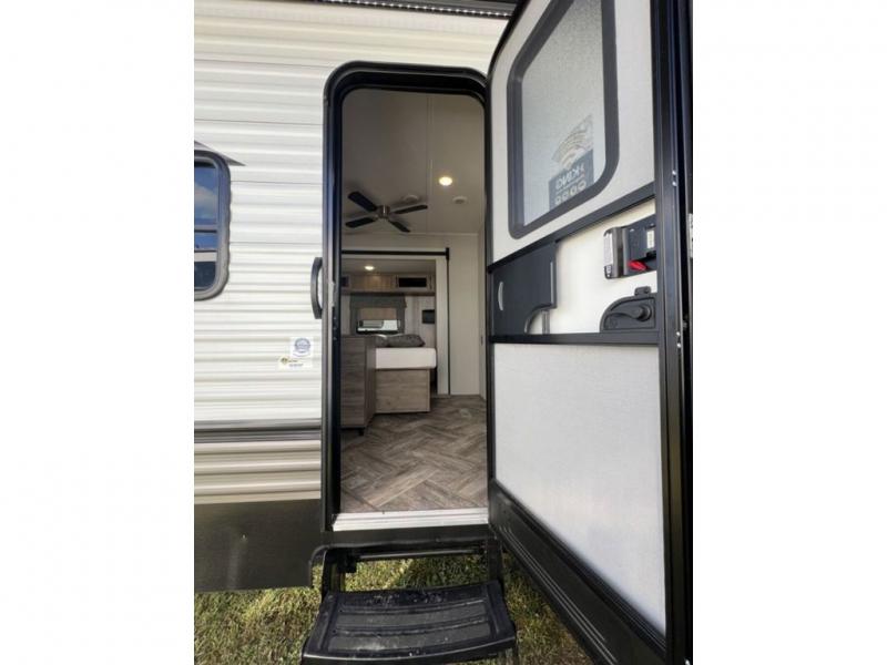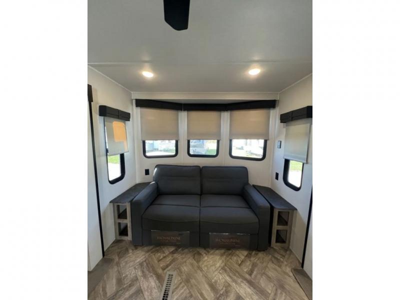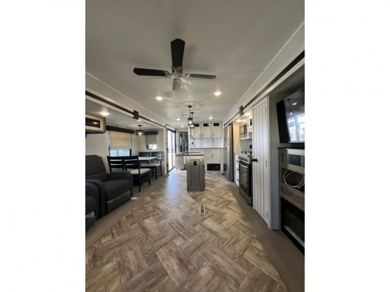 Get ready to enjoy your destination for a weekend or even longer in comfort with the front living and kitchen combined area. The sofa and booth dinette offer relaxing and dining space as well as sleeping space when needed. There are two recliners you are sure to love, and you might have decided to add the optional fireplace. There is a kitchen island to prepare and serve meals from, and wash the dishes. The kitchen offers full amenities including a residential style refrigerator and plenty of storage. You will surely enjoy the natural lighting from the patio door, and the second entry/exit is located in the rear private bedroom where you can sleep like a king, and you might like to wash your clothes if you added a washer/dryer option to the prepped space.