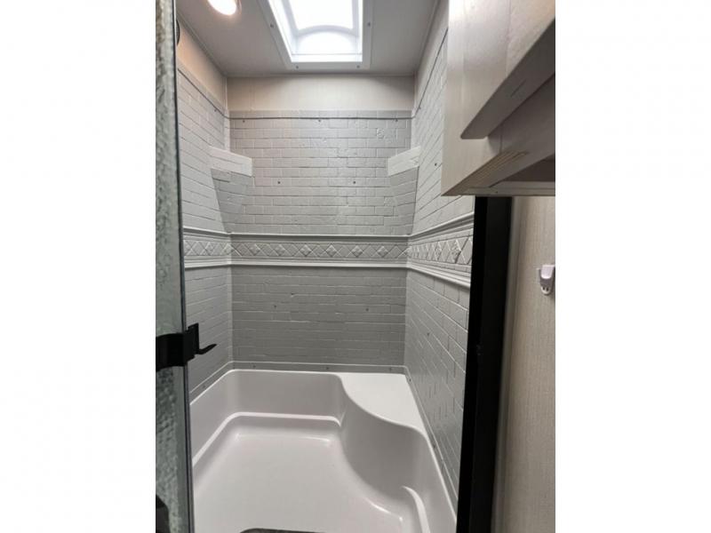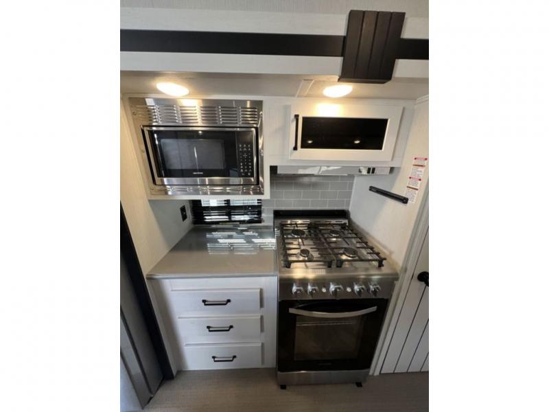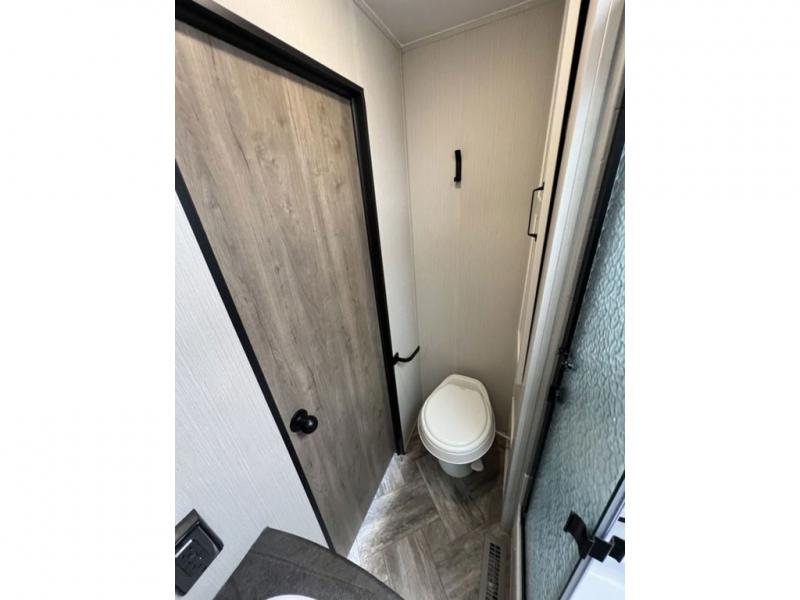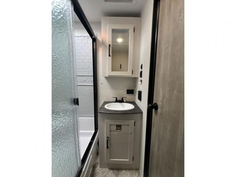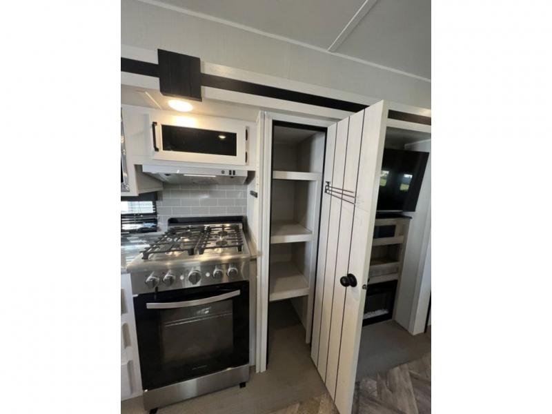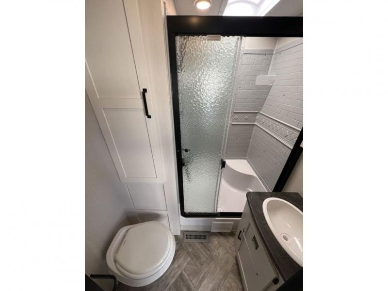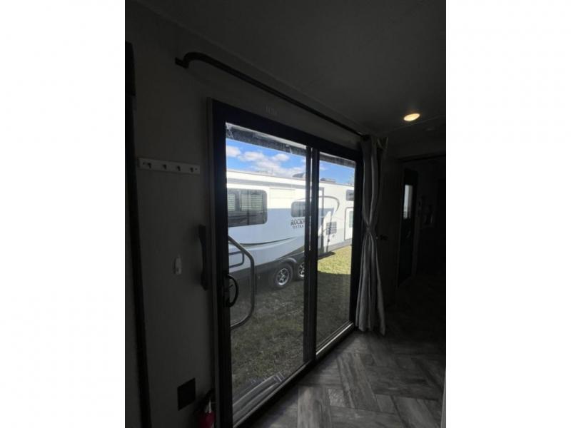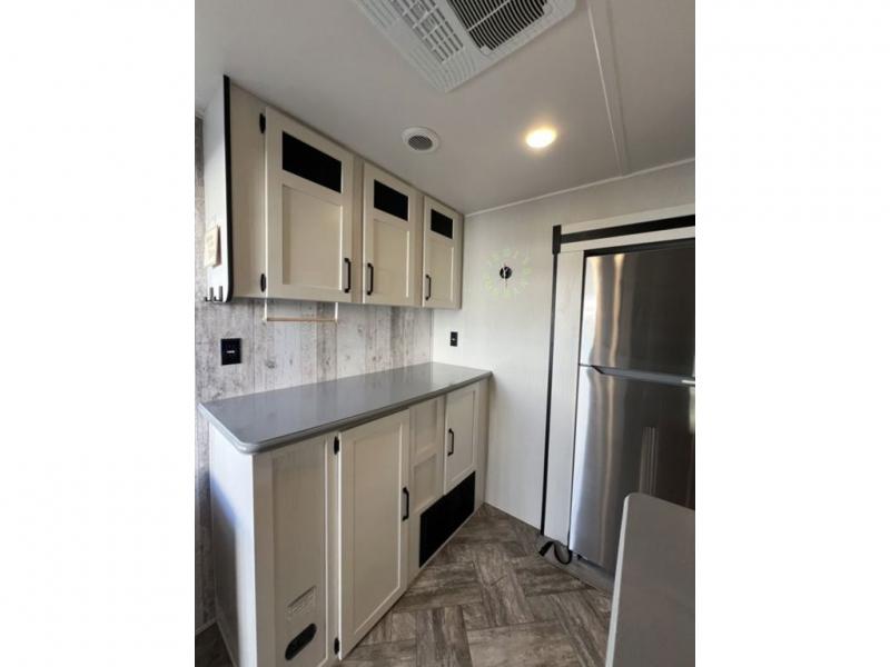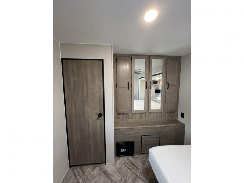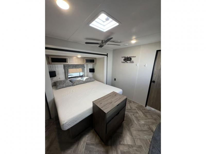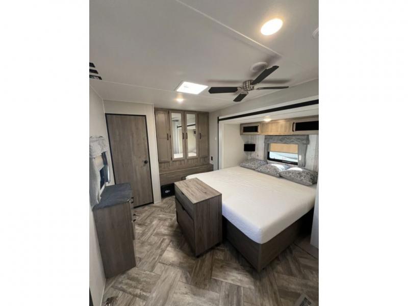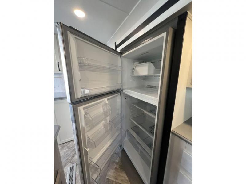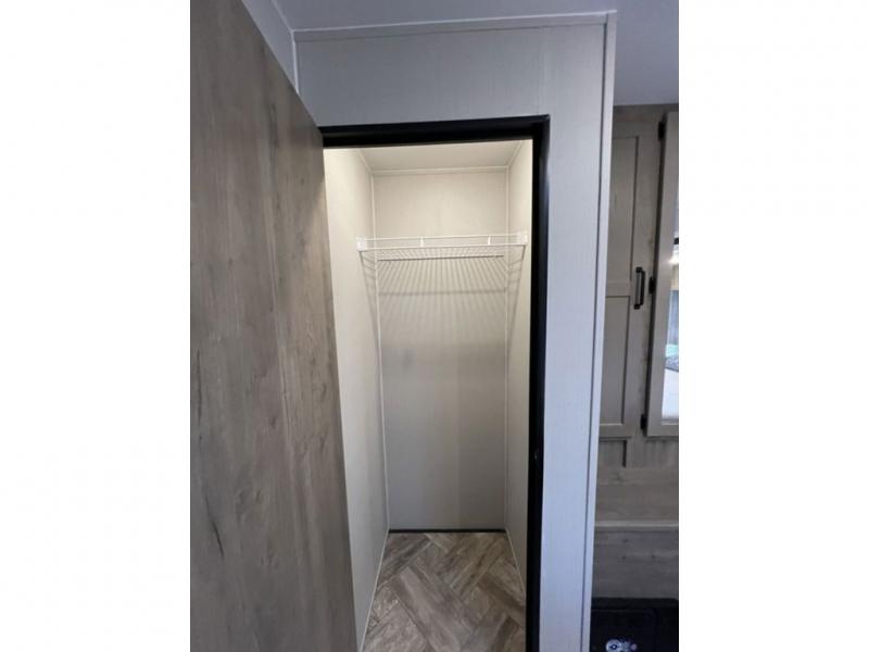 Get ready to enjoy your destination for a weekend or even longer in comfort with the front living and kitchen combined area. The sofa and booth dinette offer relaxing and dining space as well as sleeping space when needed. There are two recliners you are sure to love, and you might have decided to add the optional fireplace. There is a kitchen island to prepare and serve meals from, and wash the dishes. The kitchen offers full amenities including a residential style refrigerator and plenty of storage. You will surely enjoy the natural lighting from the patio door, and the second entry/exit is located in the rear private bedroom where you can sleep like a king, and you might like to wash your clothes if you added a washer/dryer option to the prepped space.