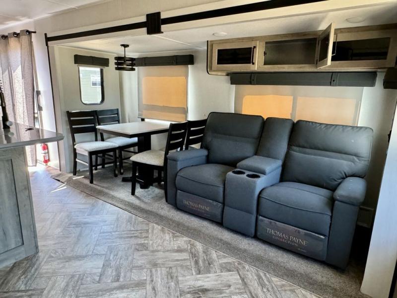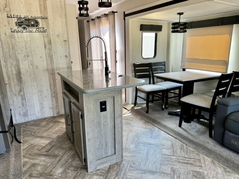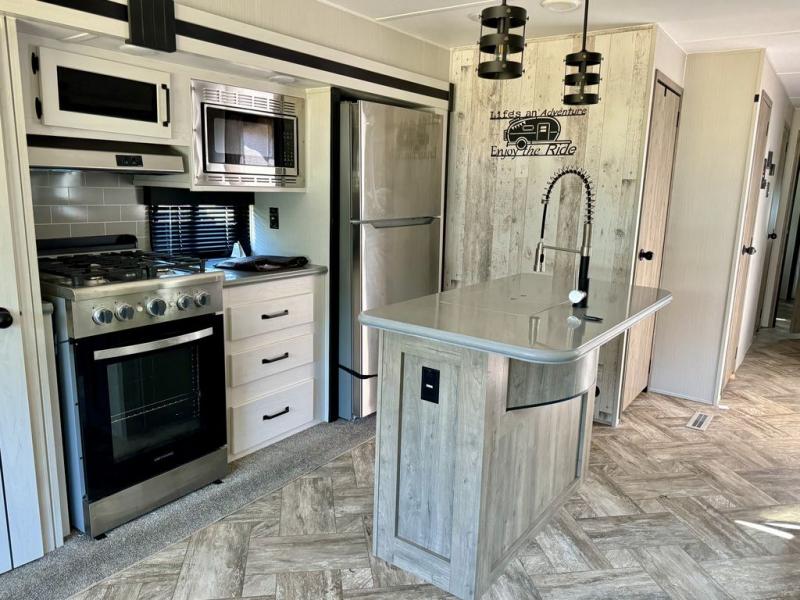 Everyone will want to join you when you head back out to the lake to stay in this trailer! With the middle bunkhouse that includes a bunk above a jiffy sofa and a closet, this can be your kids room or guests headquarters. You will have your own privacy when needed in the front bedroom which includes a queen bed slide and two closets. There is also a dresser and a space within a closet for a washer/dryer option. The full bathroom is conveniently located between the two rooms, and the rear of the destination trailer offers a combined living and kitchen area. The dual slides give you lots of floor space around the kitchen island to relax on the booth dinette or sofa, and the cook will have full kitchen amenities including a residential style refrigerator.