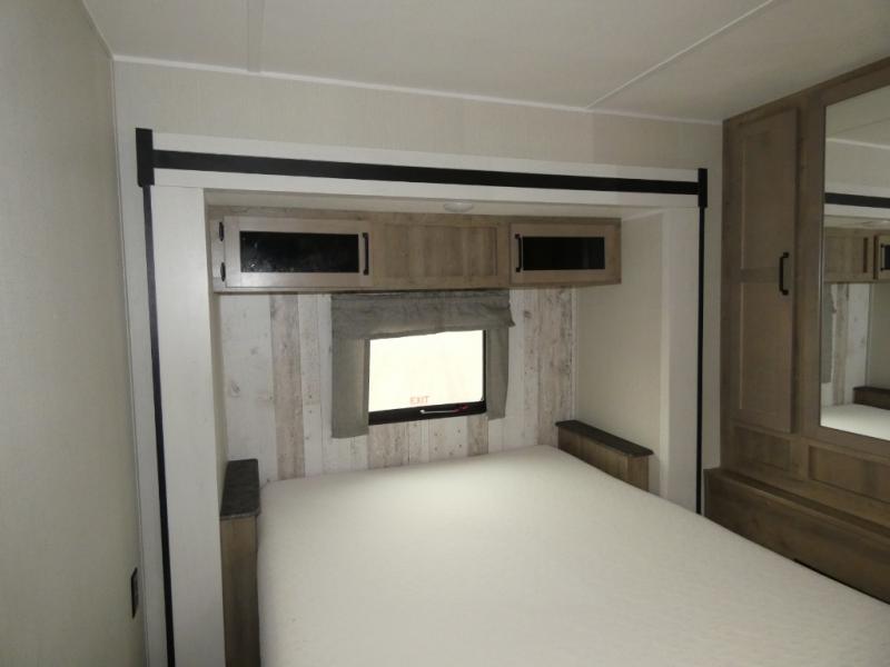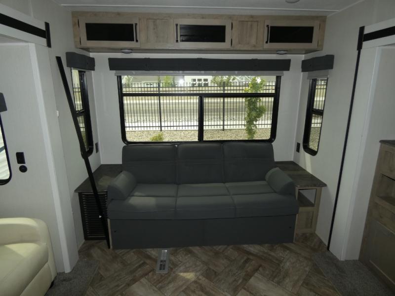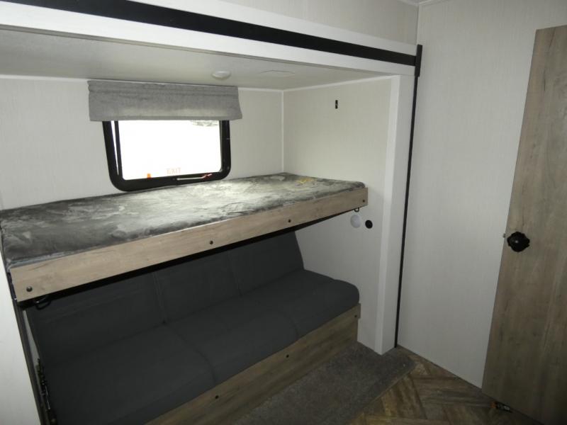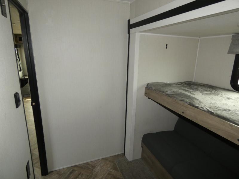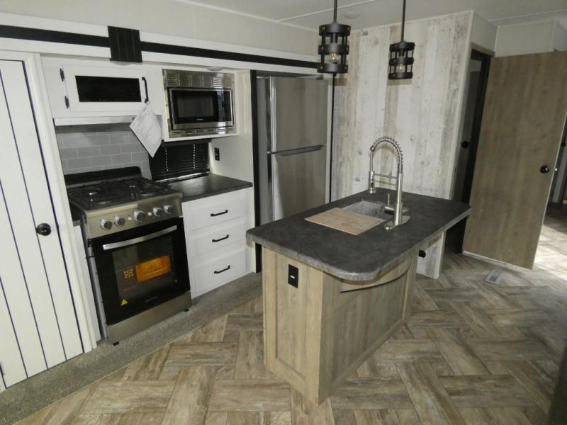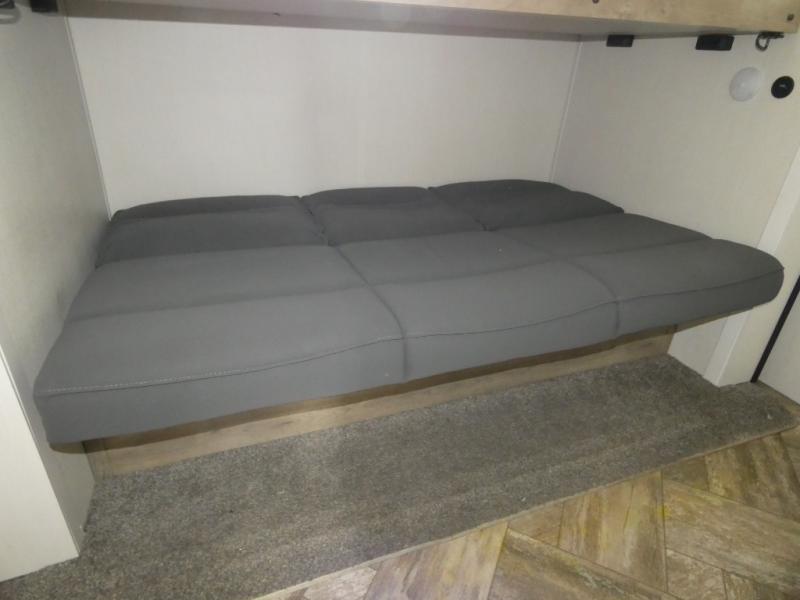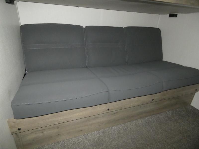 Everyone will want to join you when you head back out to the lake to stay in this trailer! With the middle bunkhouse that includes a bunk above a jiffy sofa and a closet, this can be your kids room or guests headquarters. You will have your own privacy when needed in the front bedroom which includes a queen bed slide and two closets. There is also a dresser and a space within a closet for a washer/dryer. The full bathroom is conveniently located between the two rooms, and the rear of the destination trailer offers a combined living and kitchen area. The dual slides give you lots of floor space around the kitchen island to relax on the booth dinette or sofa, and the cook will have full kitchen amenities including a residential style refrigerator.
