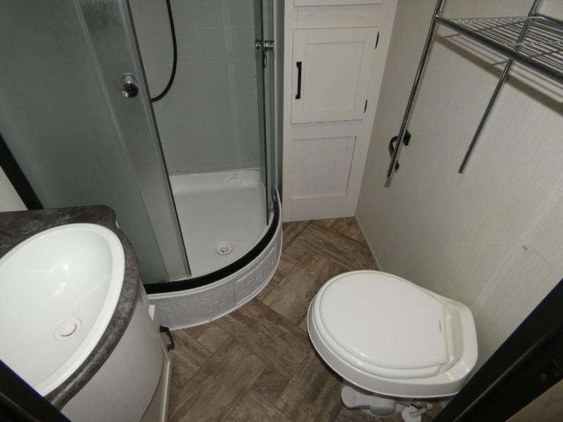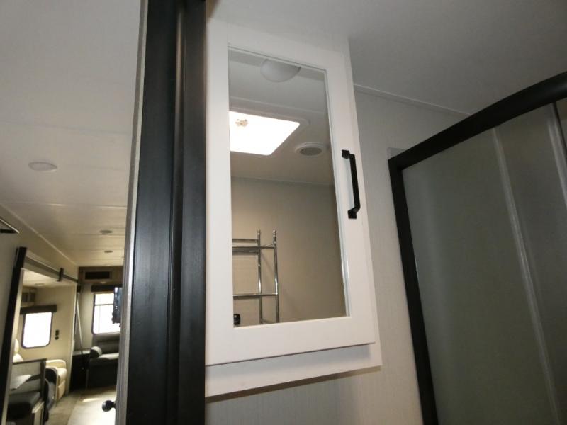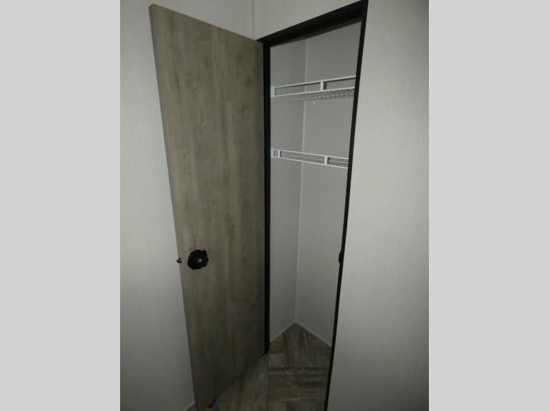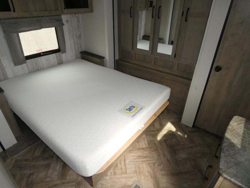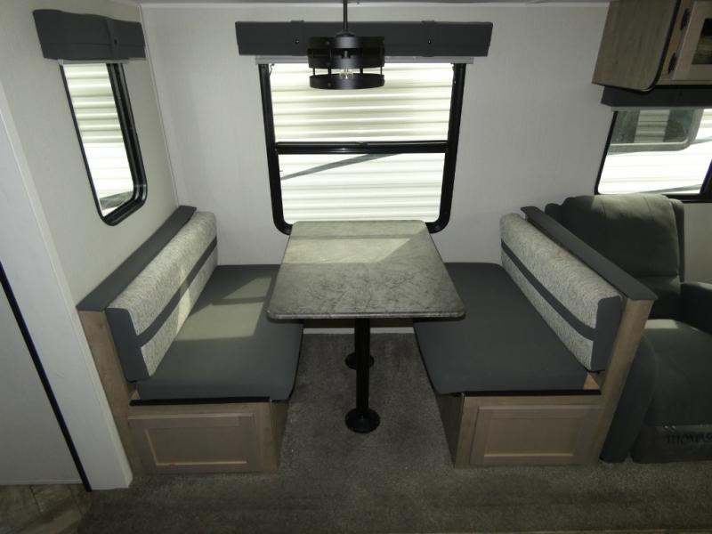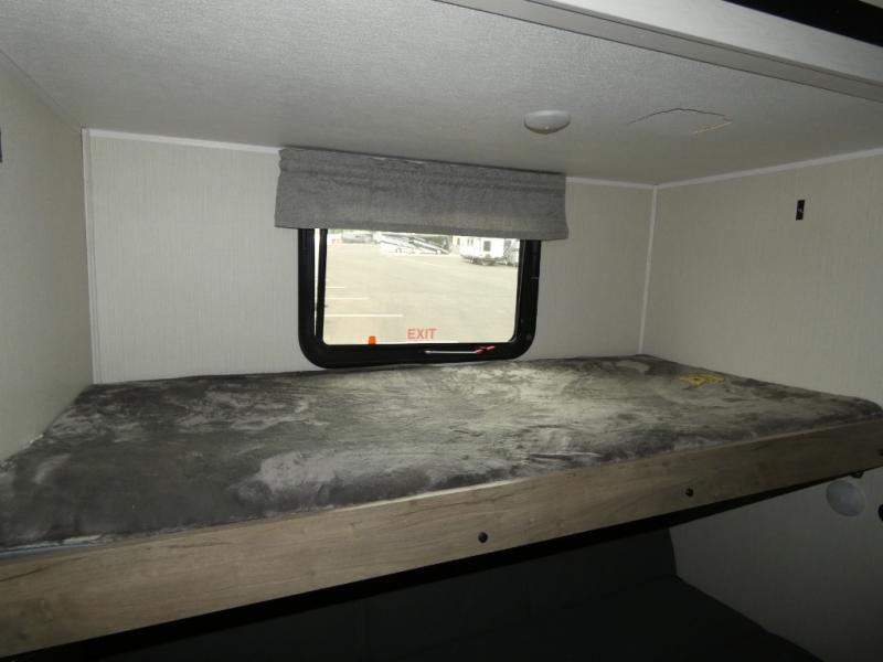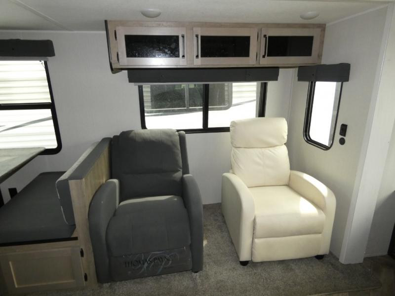 Everyone will want to join you when you head back out to the lake to stay in this trailer! With the middle bunkhouse that includes a bunk above a jiffy sofa and a closet, this can be your kids room or guests headquarters. You will have your own privacy when needed in the front bedroom which includes a queen bed slide and two closets. There is also a dresser and a space within a closet for a washer/dryer. The full bathroom is conveniently located between the two rooms, and the rear of the destination trailer offers a combined living and kitchen area. The dual slides give you lots of floor space around the kitchen island to relax on the booth dinette or sofa, and the cook will have full kitchen amenities including a residential style refrigerator.