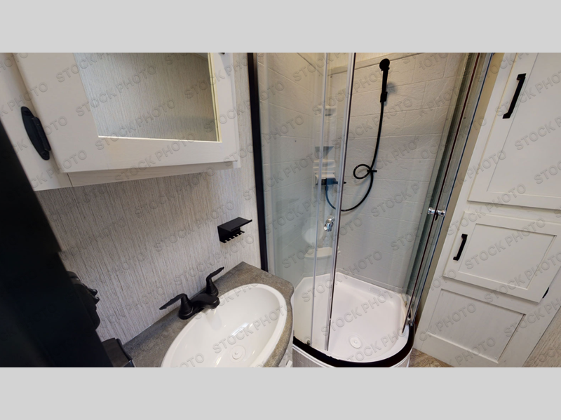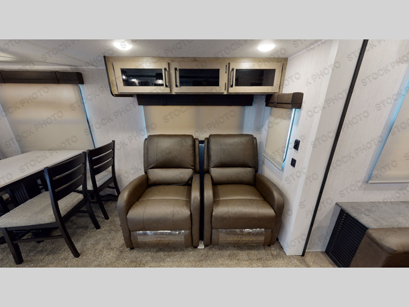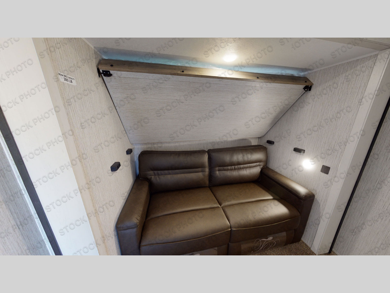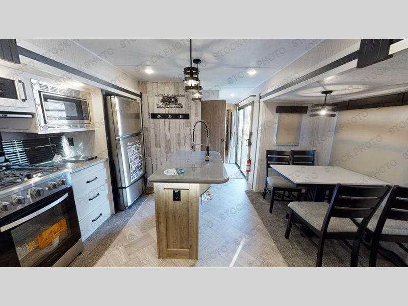 Everyone will want to join you when you head back out to the lake to stay in this trailer! With the middle bunkhouse that includes a bunk above a jiffy sofa and a closet, this can be your kids room or guests headquarters. You will have your own privacy when needed in the front bedroom which includes a queen bed slide and two closets. There is also a dresser and a space within a closet for a washer/dryer option. The full bathroom is conveniently located between the two rooms, and the rear of the destination trailer offers a combined living and kitchen area. The dual slides give you lots of floor space around the kitchen island to relax on the booth dinette or sofa, and the cook will have full kitchen amenities including a residential style refrigerator.