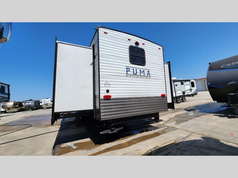 Each Puma Destination trailer by Palomino is designed to give you unforgettable getaways to the destination of your choice! The AlphaPly roofing membrane and powder coated frames are what make these models ultra durable, and the super lube axles will provide smooth towing from home to campground. The Value Shopper Package includes Beauflor linoleum, an AM/FM/Bluetooth stereo, a high-rise faucet with a sprayer, bedroom TV hook-up, and many many more conveniences. You'll find the designer window treatments in the living room and decorative kitchen backsplash will make your space feel more like home, plus there are USB charging ports for your electronics and plenty of storage space for all your belongings. And you can add the optional Marquis Edition Package that includes an outside shower, a solid surface countertop, two exterior speakers, and more features that will add to your comfort!