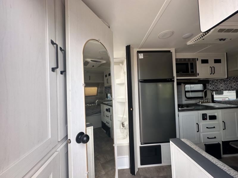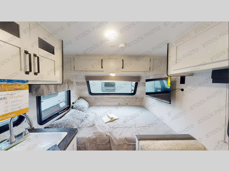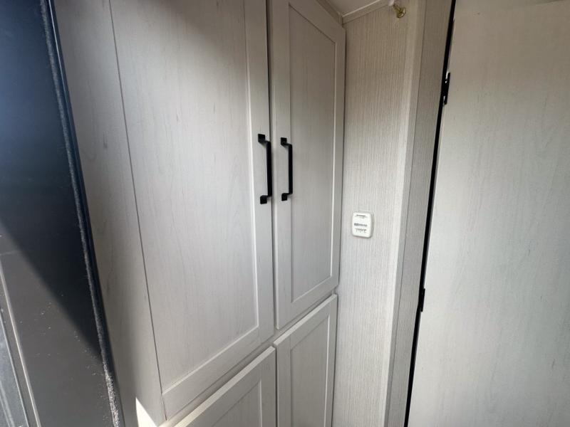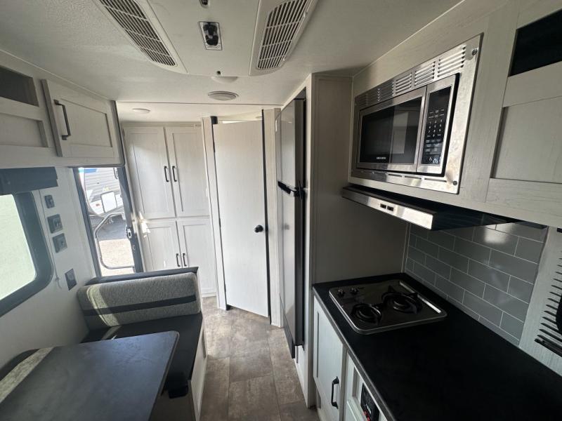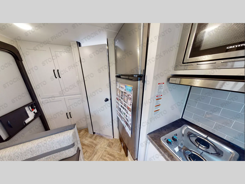 Easily hit the road with this trailer in tow! You can camp locally or far away, the choice is yours. There is an RV queen bed up front to sleep on and the dinette offers sleeping space for one more, the galley kitchen provides a two-burner cooktop and a residential refrigerator to make meals, plus the bathroom offers a tub and toilet so you can skip the public facilities. And the entry closet can be used for your daily clothes, coats or even extra space for dry goods and such.