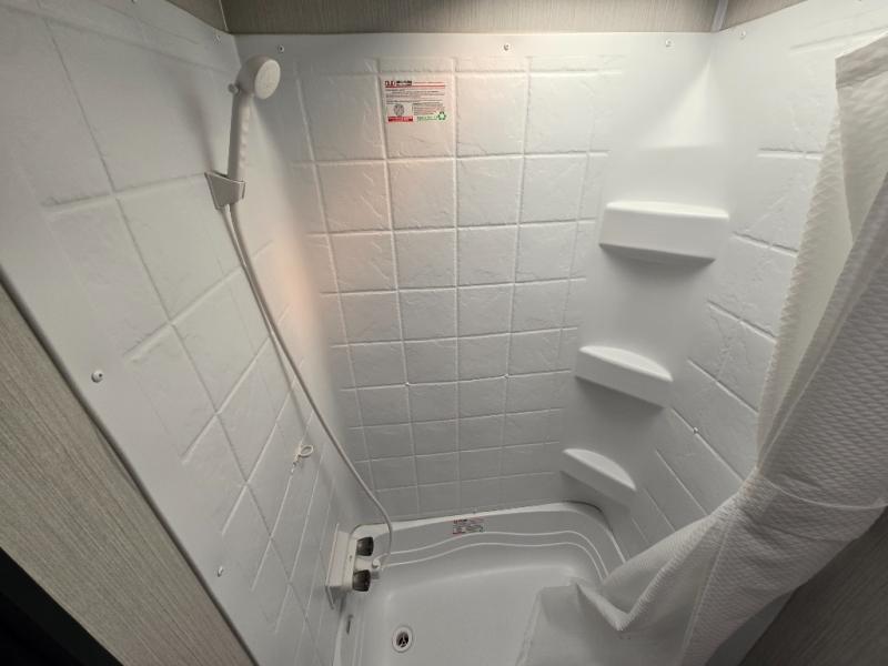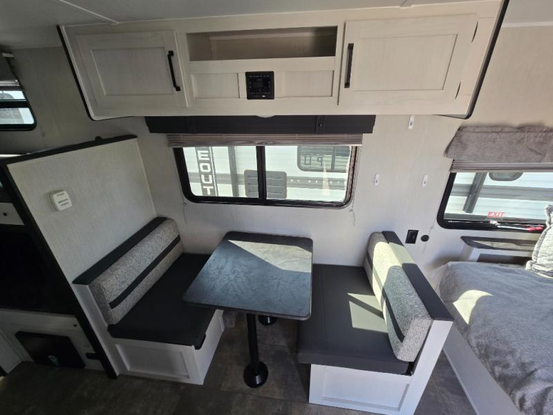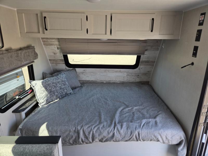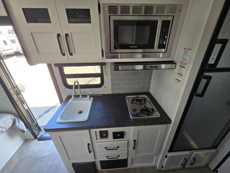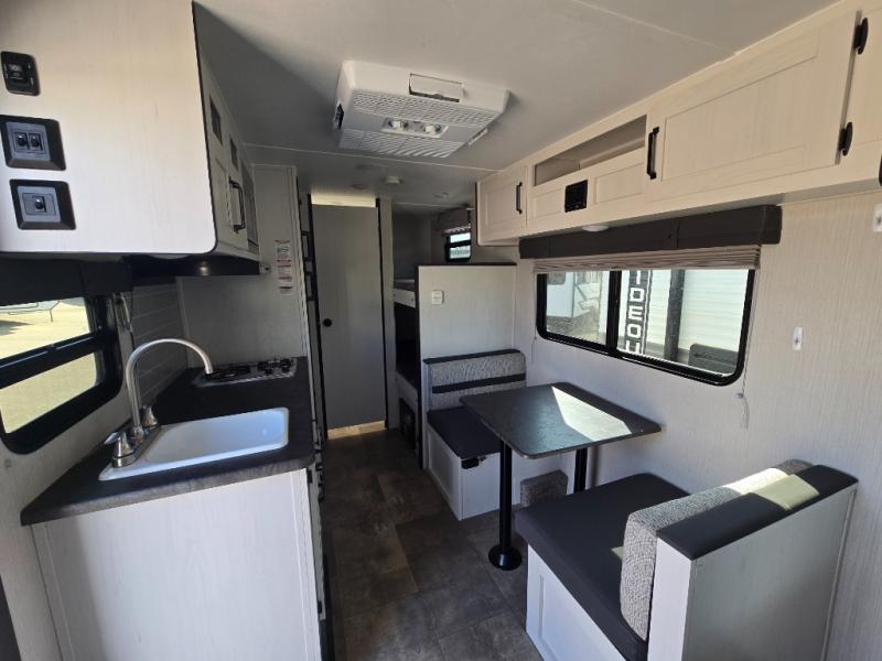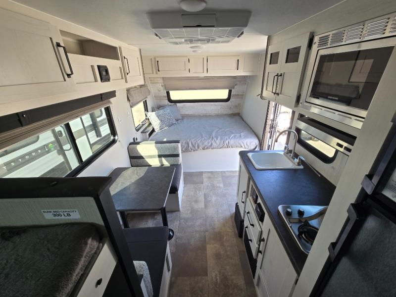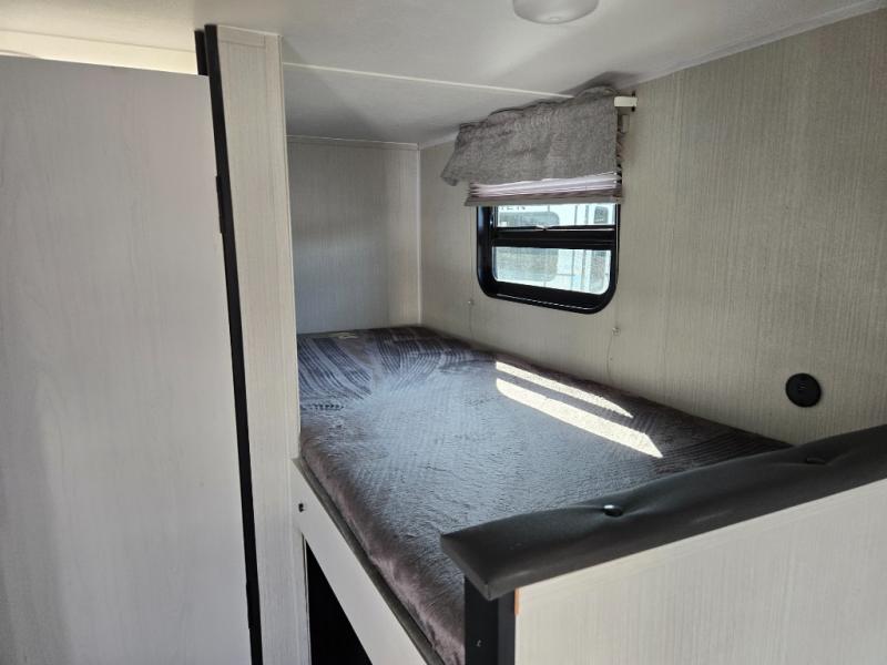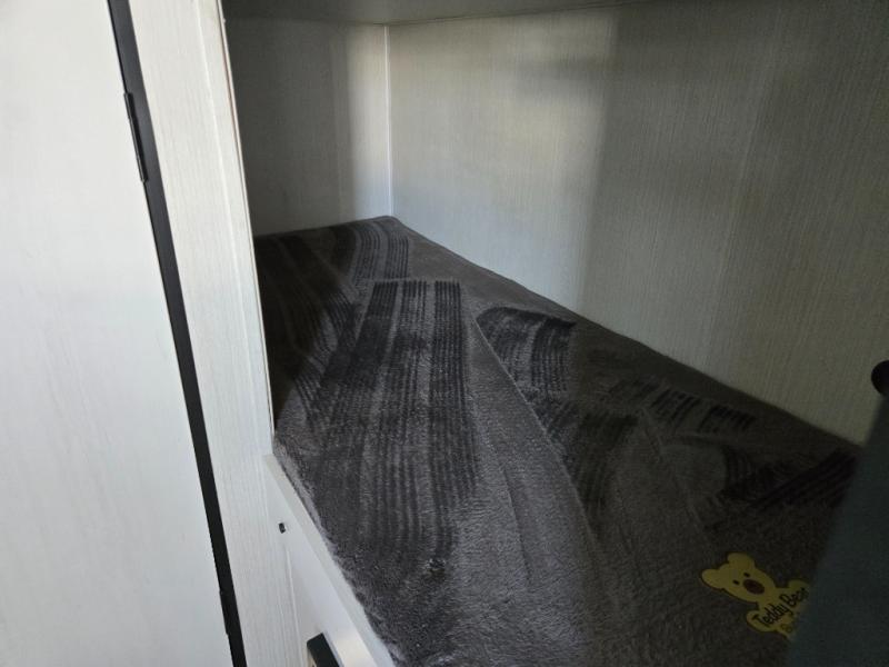 The family is ready, are you? After loading up your clothes, food and gear, you and your crew can camp with everything you need plus more inside this trailer. The kids will surely claim the bunks as their own, and you will have an RV queen bed up front. Two can dine at the booth dinette, or everyone can dine outside under the 12' electric awning after adding your camping chairs. The cook will have a two-burner cooktop and stainless steel microwave to whip up meals, and the residential refrigerator can hold the leftovers. And everyone will stay clean using the private toilet and tub/shower next to the bunks.