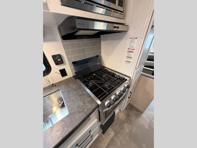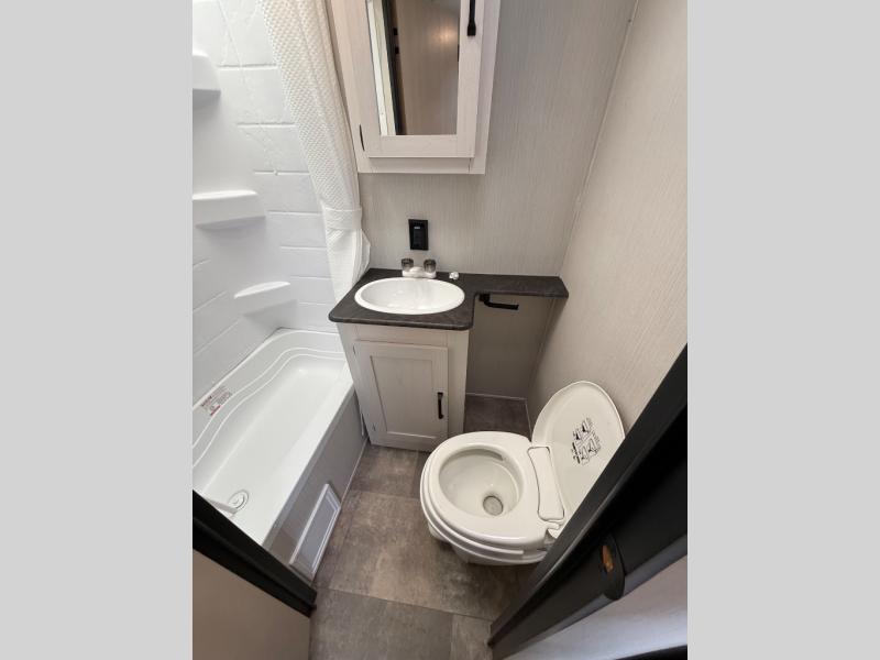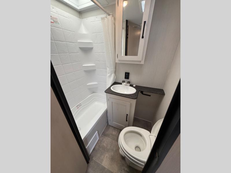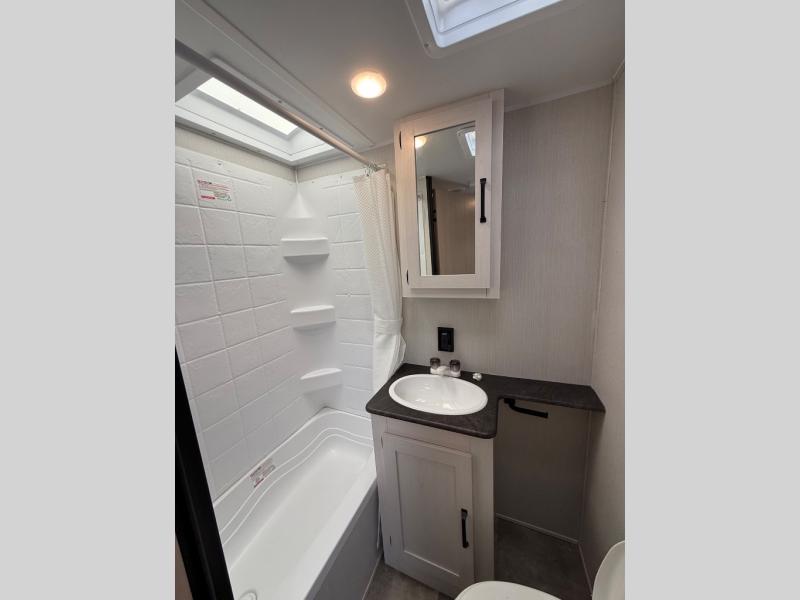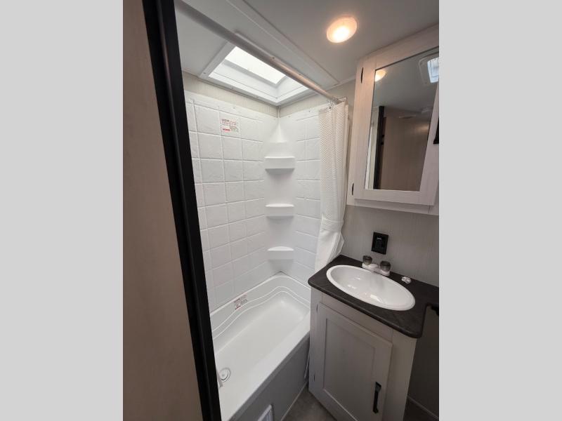 You can bring a couple guests with you to camp in this travel trailer! Lay your head at night on the front 60" x 74" queen bed with shirt closets on either side to hang your clothes. The sofa and booth dinette offer comfortable places to sleep once they are converted. You can even add an optional TV for more entertainment. Prepare your best meals with the three burner cooktop and store any leftovers in the 11 cu. ft. refrigerator to enjoy once again when you heat them up in the stainless steel microwave. There is even a full bathroom with a 38" tub for you to freshen up in each morning!