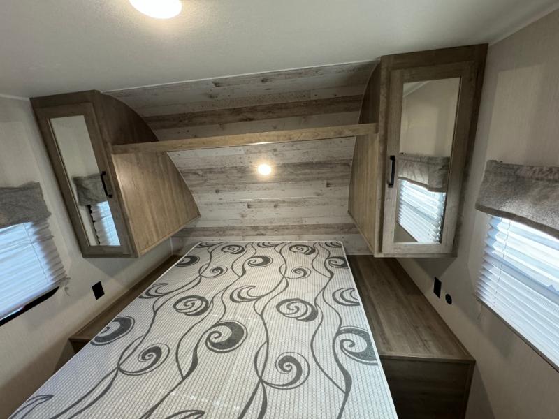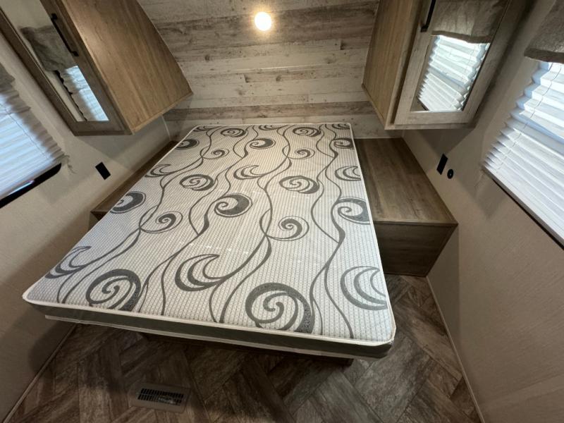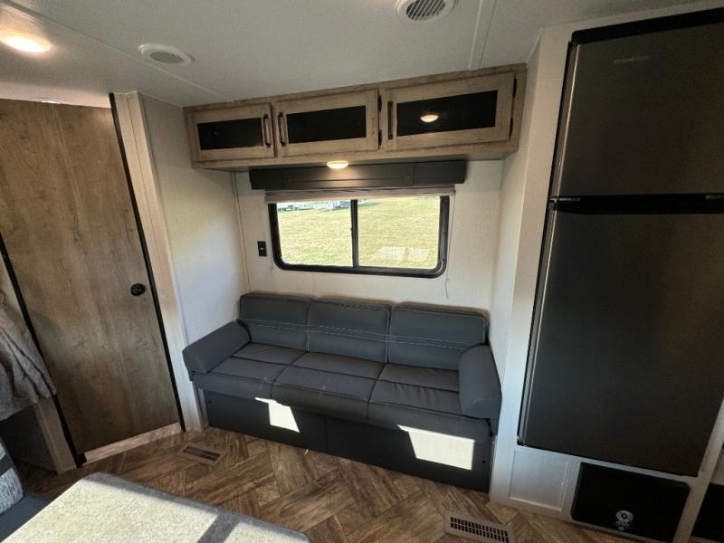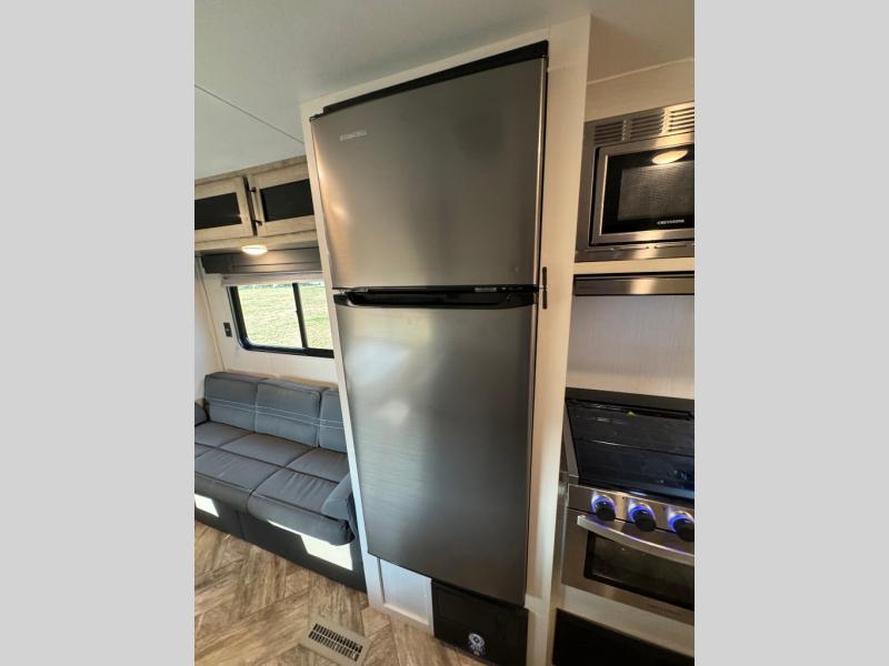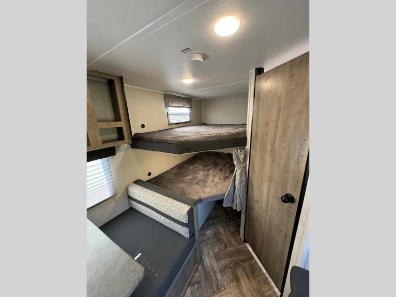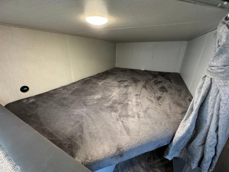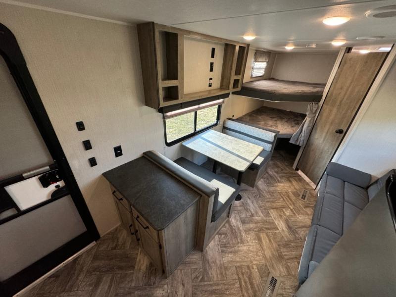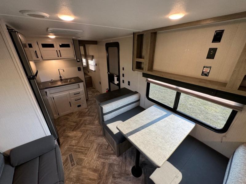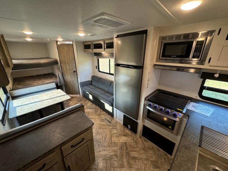 Everyone will have a comfortable place to sleep in this travel trailer! From the 60" x 74" RV queen bed in the front private bedroom to the 48" x 76" double bunk beds with storage underneath, plus you could even transform the booth dinette and sofa into additional sleeping spaces if needed. The rear corner bathroom has a 32" x 40" shower with a seat to freshen up in each morning. In the kitchen, there is not only a three burner cooktop and a 11 cu. ft. refrigerator, but also a cabinet with for your storage needs. You could even add the optional outside kitchen with a refrigerator, a sink, and a griddle to cook pancakes on while watching the beautiful sunrise!