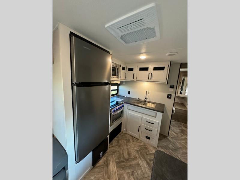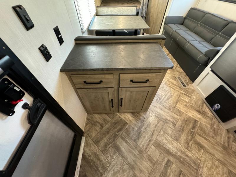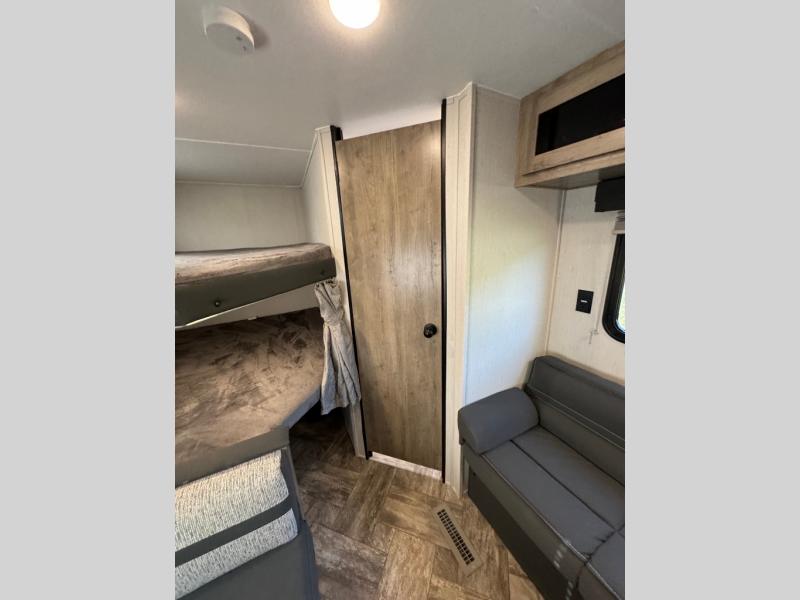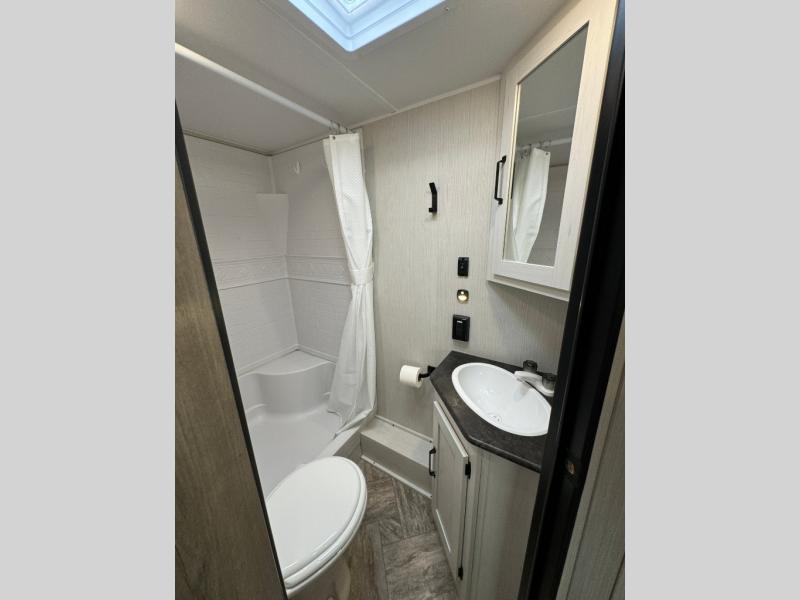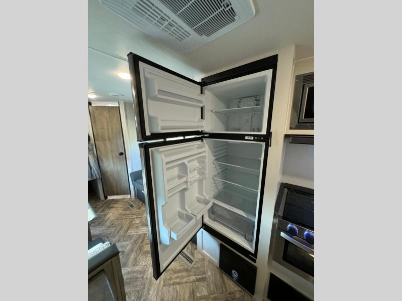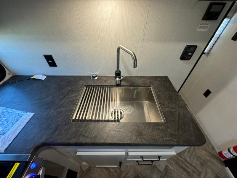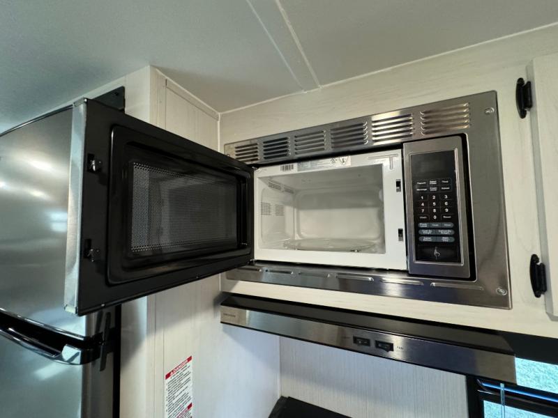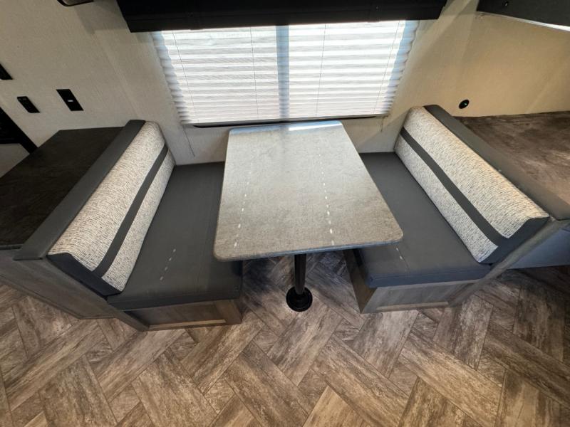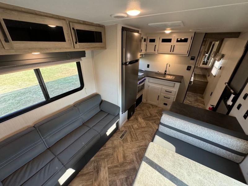 Everyone will have a comfortable place to sleep in this travel trailer! From the 60" x 74" RV queen bed in the front private bedroom to the 48" x 76" double bunk beds with storage underneath, plus you could even transform the booth dinette and sofa into additional sleeping spaces if needed. The rear corner bathroom has a 32" x 40" shower with a seat to freshen up in each morning. In the kitchen, there is not only a three burner cooktop and a 11 cu. ft. refrigerator, but also a cabinet with for your storage needs. You could even add the optional outside kitchen with a refrigerator, a sink, and a griddle to cook pancakes on while watching the beautiful sunrise!