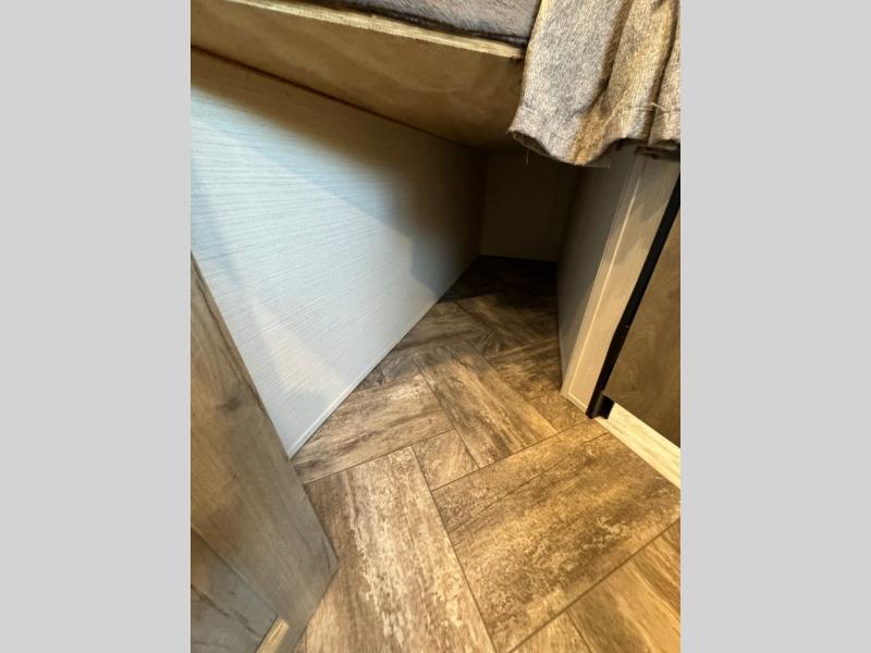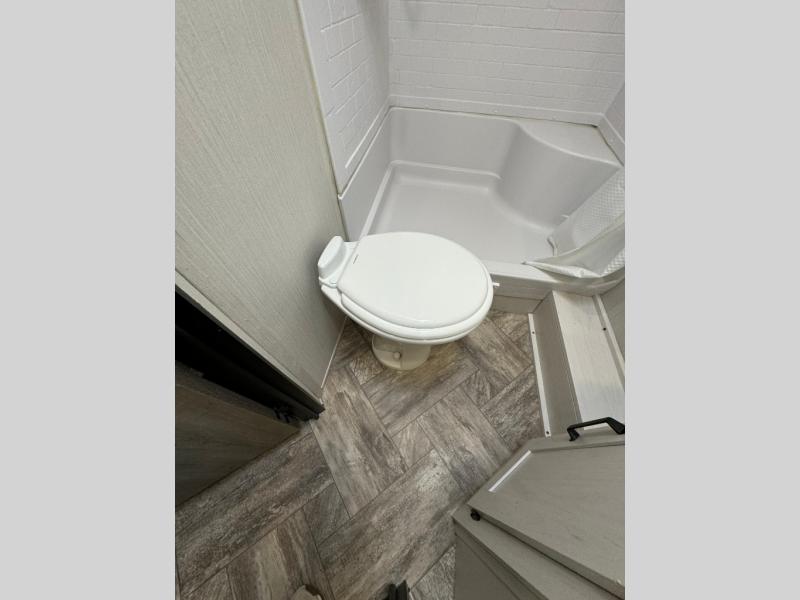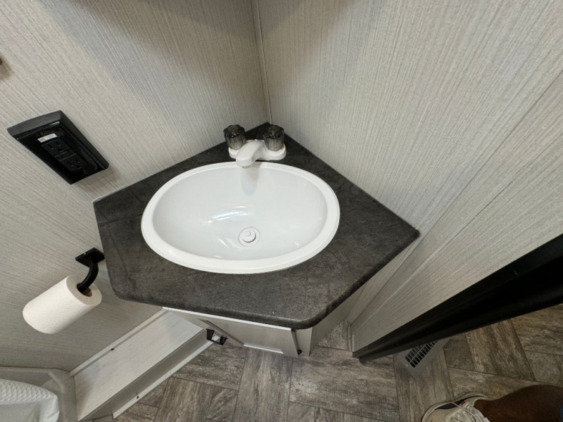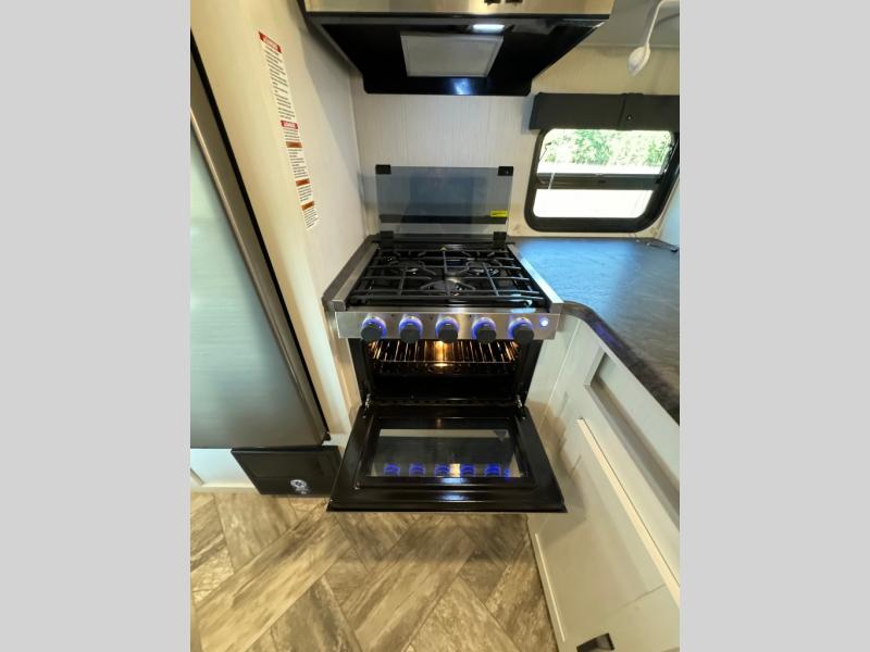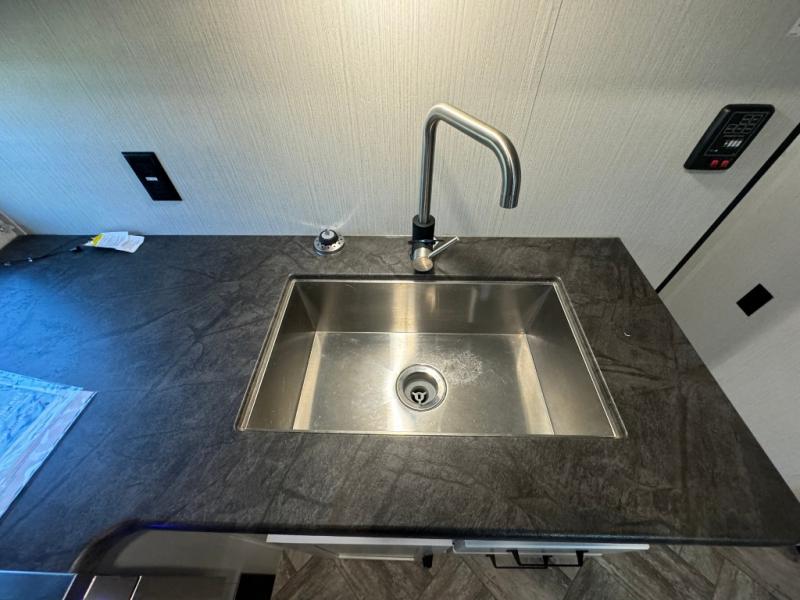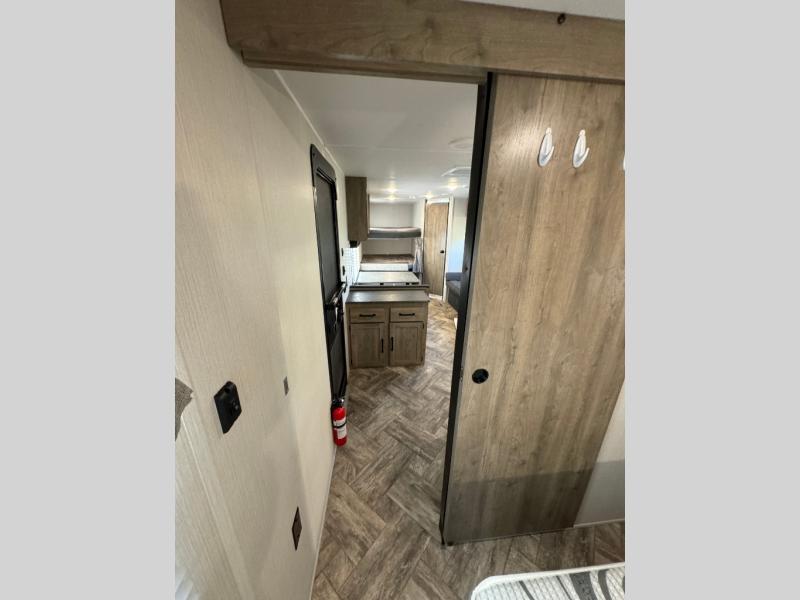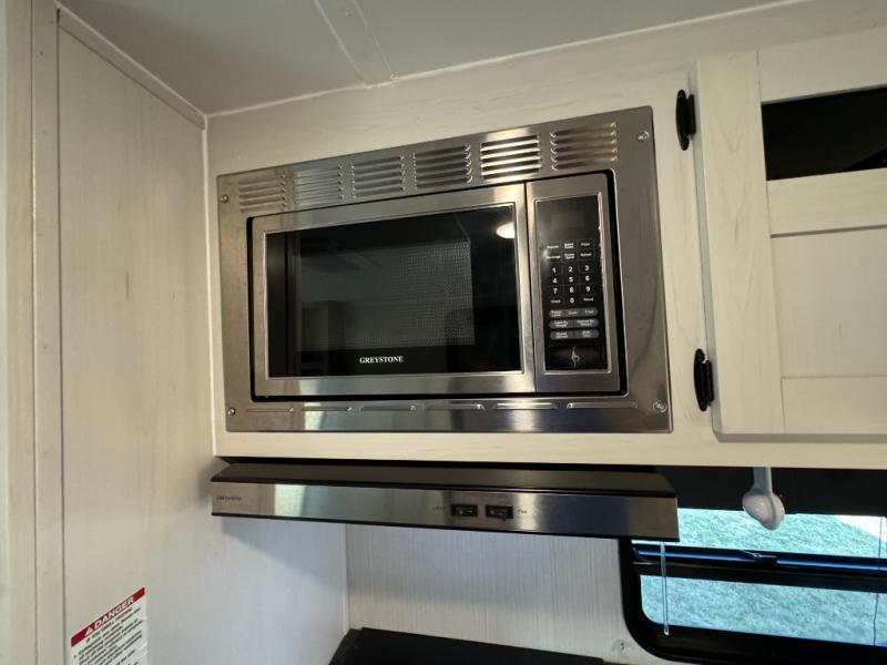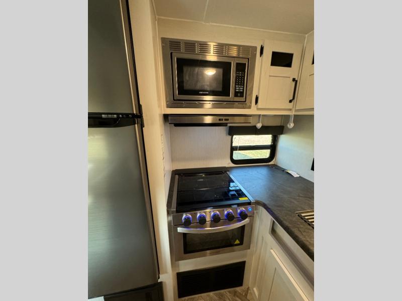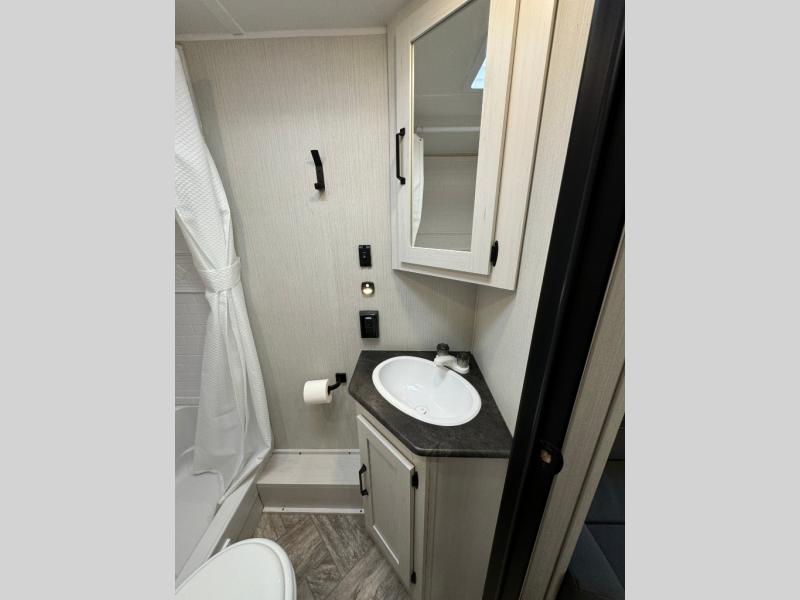 Everyone will have a comfortable place to sleep in this travel trailer! From the 60" x 74" RV queen bed in the front private bedroom to the 48" x 76" double bunk beds with storage underneath, plus you could even transform the booth dinette and sofa into additional sleeping spaces if needed. The rear corner bathroom has a 32" x 40" shower with a seat to freshen up in each morning. In the kitchen, there is not only a three burner cooktop and a 11 cu. ft. refrigerator, but also a cabinet with for your storage needs. You could even add the optional outside kitchen with a refrigerator, a sink, and a griddle to cook pancakes on while watching the beautiful sunrise!