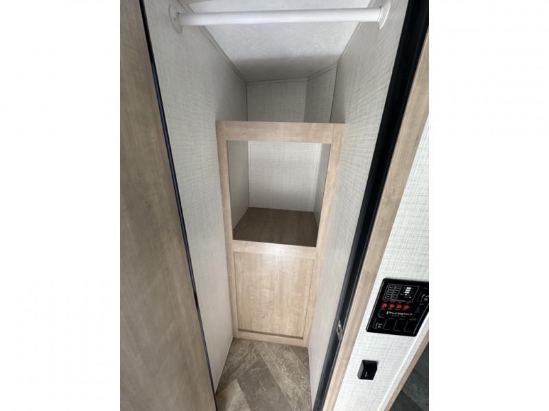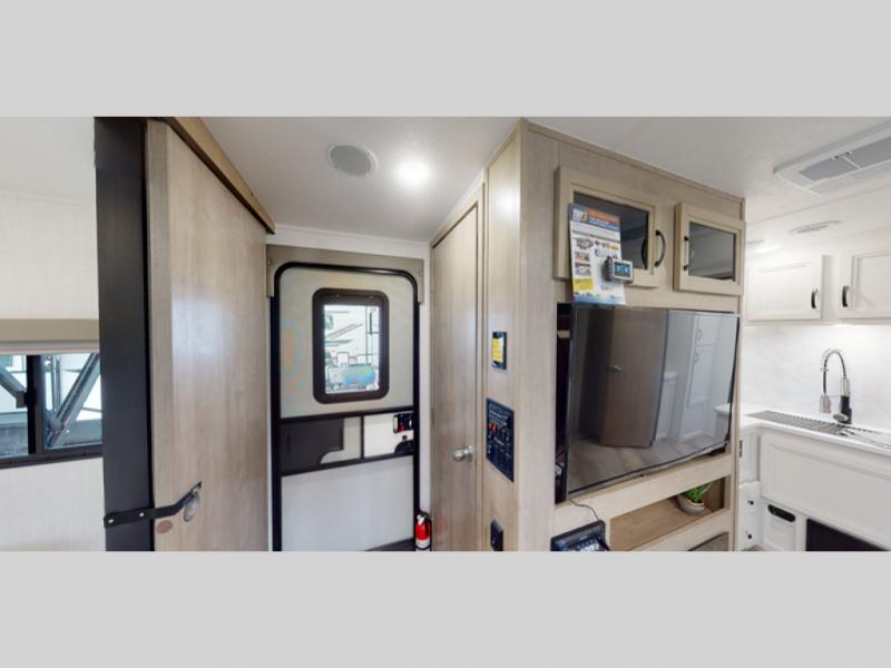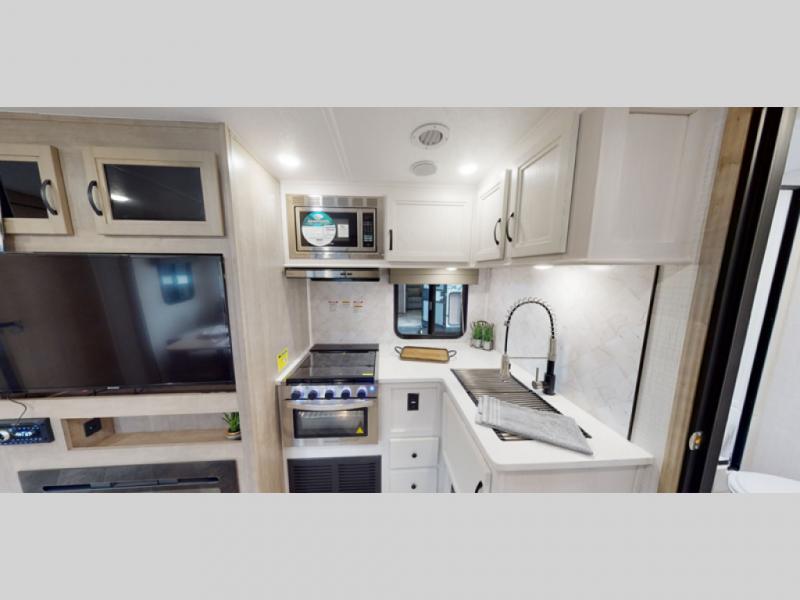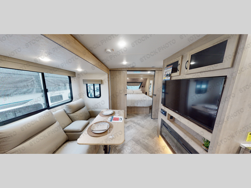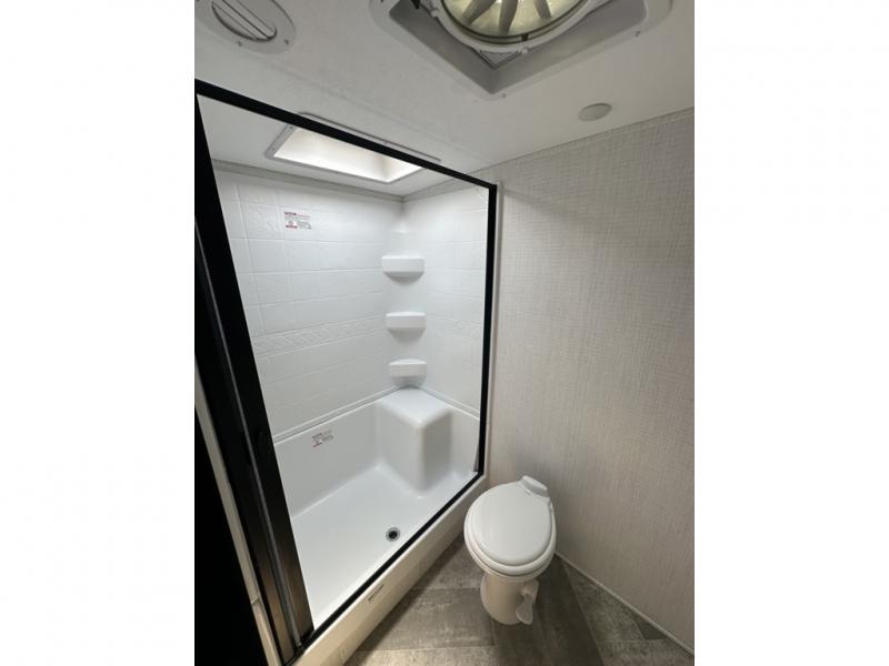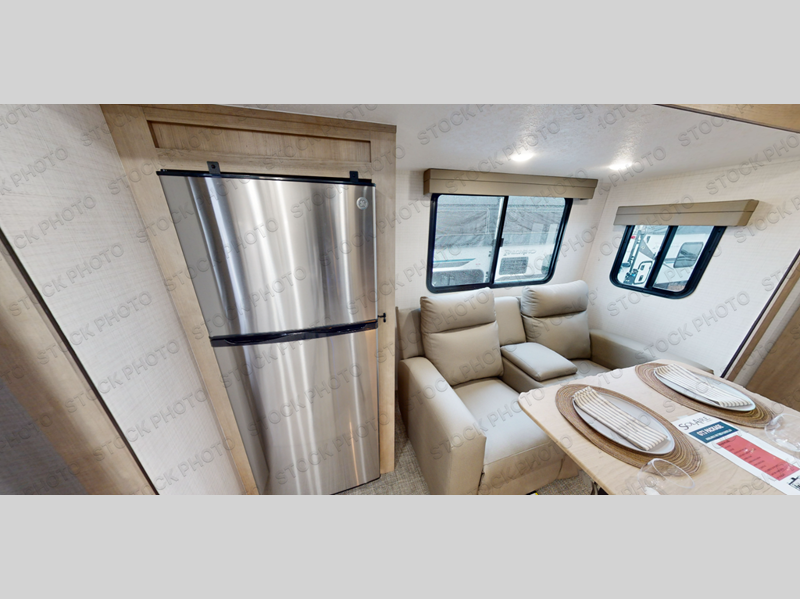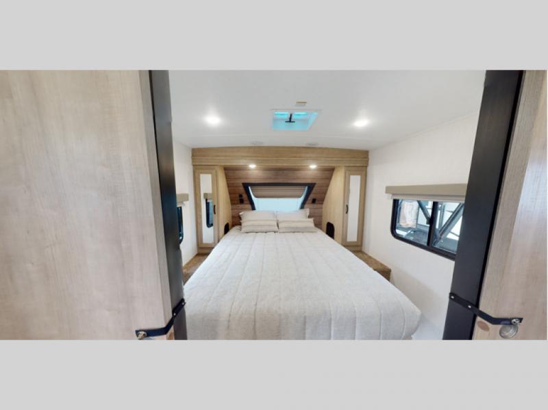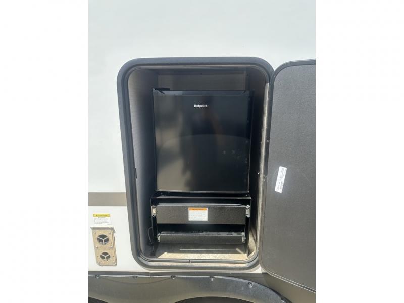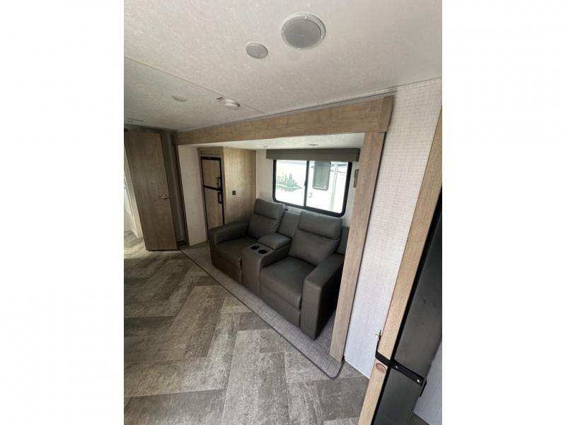 This couple's trailer includes an exterior pull-out stove with an exterior refrigerator the chef if sure to love. And the full kitchen amenities inside include a glass top flush mount range, a microwave, an 11 cu. ft. refrigerator and a pantry. You can relax inside on the theater seats that are within a large slide out while watching the entertainment center, and the entry closet is super handy. The full rear bathroom gives you the space you need as well as a shower with a seat. And the front bedroom provides a queen bed, dual wardrobes and privacy.