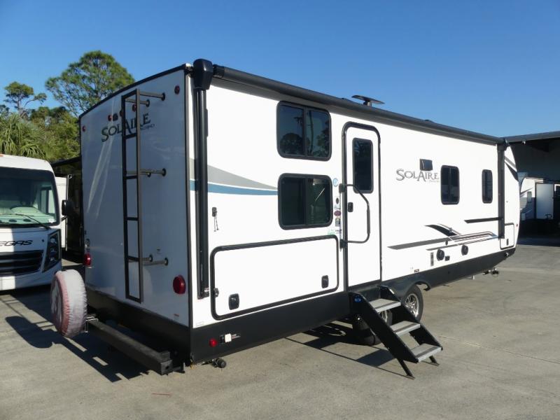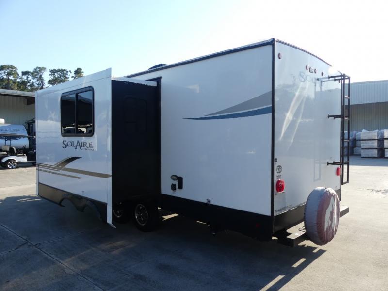 Each SolAire travel trailer or hybrid expandable features a 2/3 front fiberglass cap, a white hi-gloss exterior, and Dexter Tor-Flex torsion axles for smooth towing. You will love having a power tongue jack for easy set up, plus slam latch baggage doors with magnets to make unloading easier than ever. There is also a tire pressure monitoring system, a power awning with LED lights, and aluminum wheels included on the exterior. Head inside to find solid surface countertops, roller shades, a Furrion HDMI DVD/Bluetooth/HDMI stereo, and USB ports to keep your electronics charged.