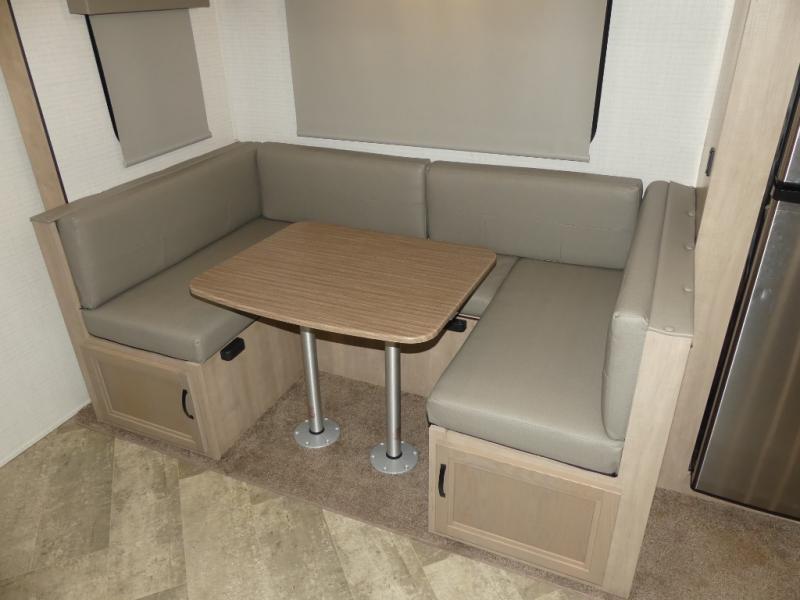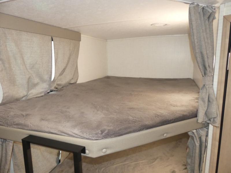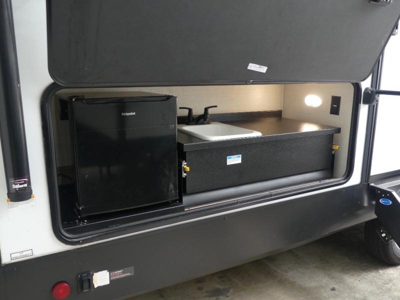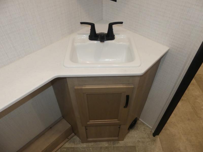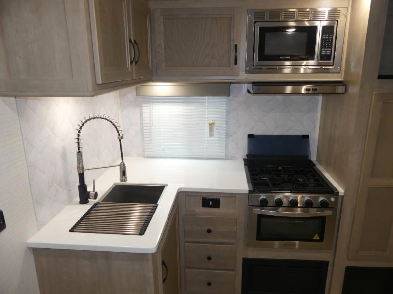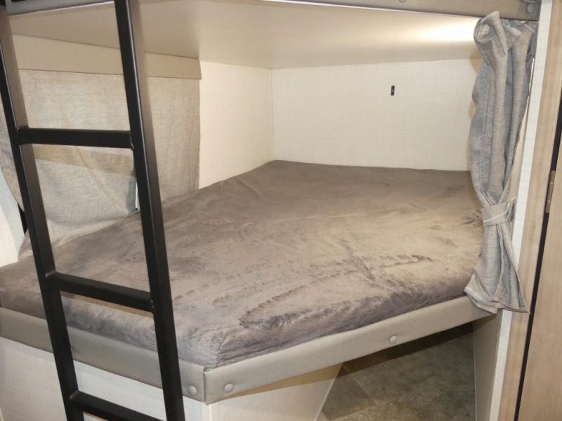Your friends and family will love camping with you in this trailer that offers sleeping space for eight with the queen bed, the double-size bunks and the U-shaped dinette once it is easily set up for sleeping space. The cook will love the choice of making meals using the outside kitchen or the full amenities inside which include a glass top flush mount range, a microwave, an 11 cu. ft. refrigerator and a large pantry. The L-shaped counter is convenient because the cook will not need to move when someone is walking to the front bedroom to sleep on the queen bed or to store some clothes in the dual wardrobes.