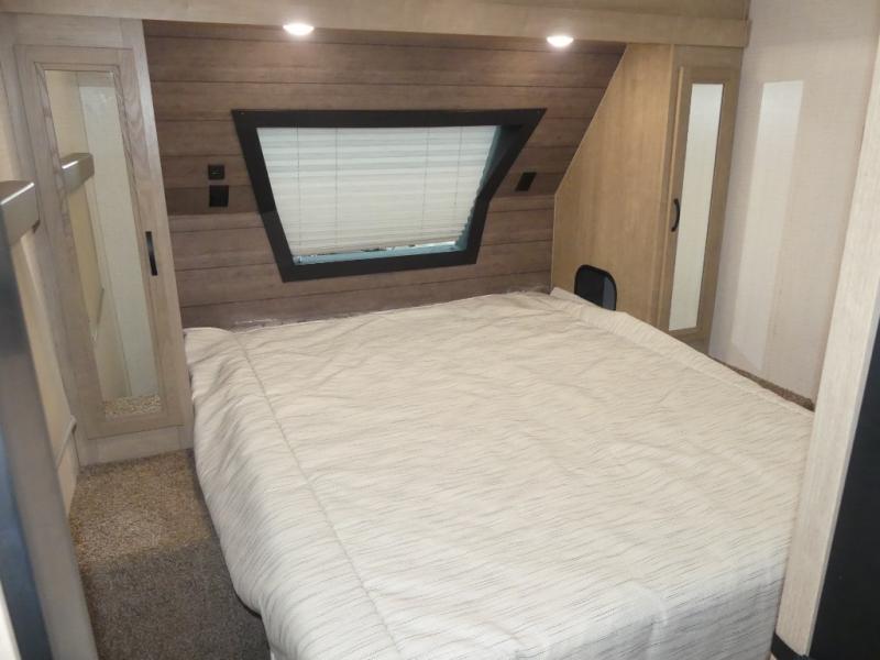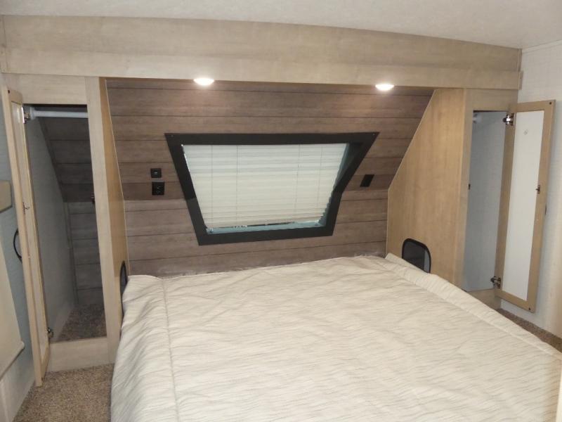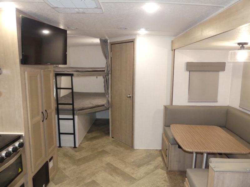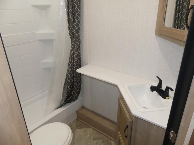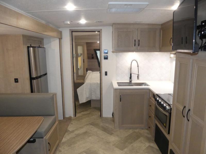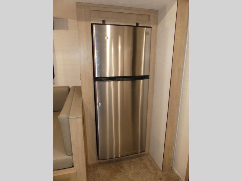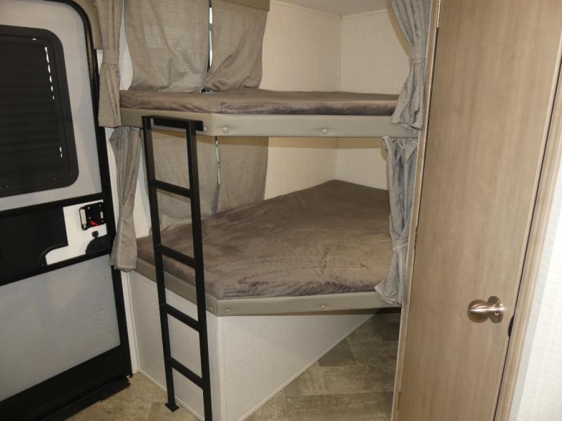 Your friends and family will love camping with you in this trailer that offers sleeping space for eight with the queen bed, the double-size bunks and the U-shaped dinette once it is easily set up for sleeping space. The cook will love the choice of making meals using the outside kitchen or the full amenities inside which include a glass top flush mount range, a microwave, an 11 cu. ft. refrigerator and a large pantry. The L-shaped counter is convenient because the cook will not need to move when someone is walking to the front bedroom to sleep on the queen bed or to store some clothes in the dual wardrobes.