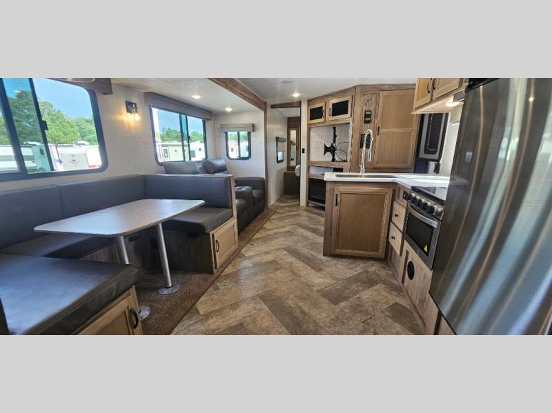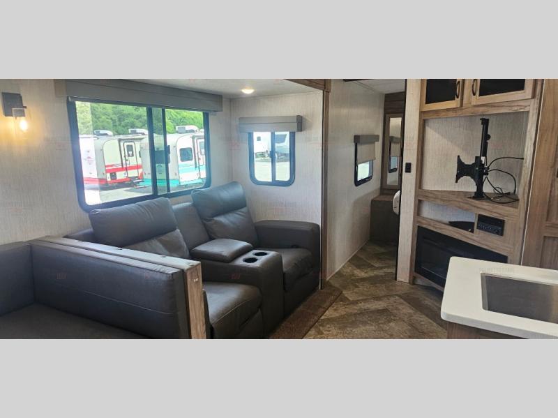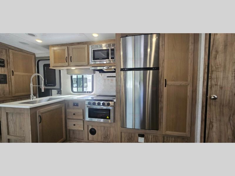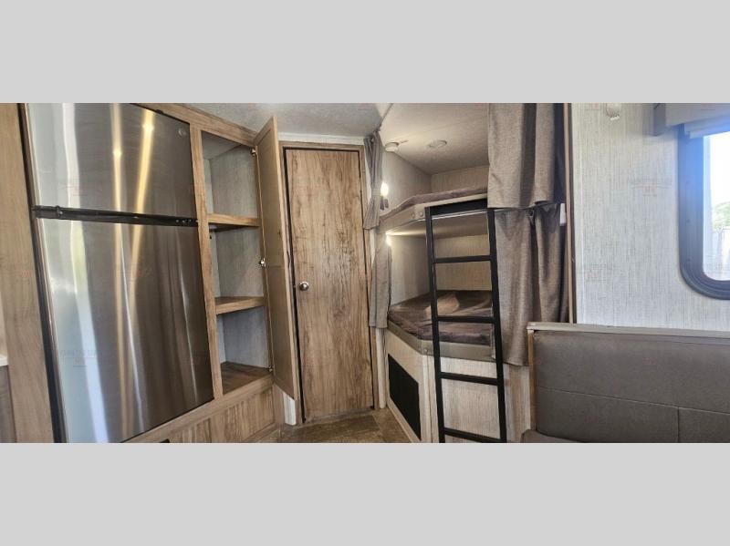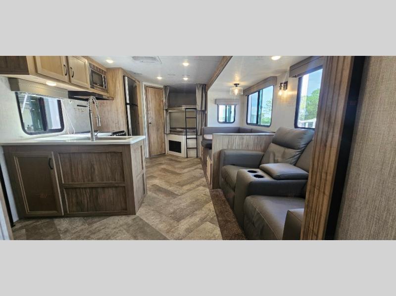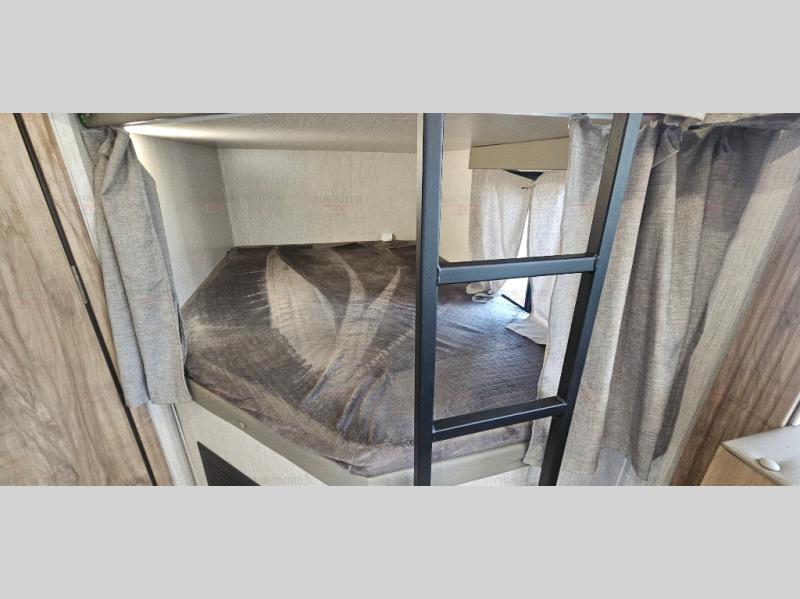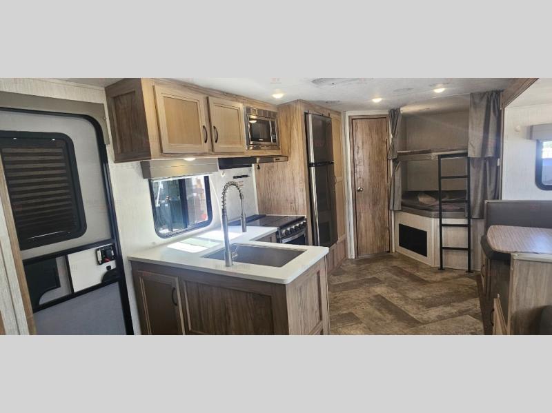 Get ready for fun at the campgrounds hiking, fishing, or relaxing when you have this trailer only a few steps away! The convenient dual entry allows a smooth flow of traffic when everyone joins you, and the second entry/exit is located in the full bathroom which is handy when you are playing outside or relaxing under the 19' power awning. The U-shaped dinette and sofa sleeper are within a slide out providing more floor space and a place to dine, relax and sleep. The double-size bunks are in the rear and the private bedroom is up front. You will find a queen bed, dual wardrobes, a walk-in closet and a space saving sliding door. The galley kitchen is just as impressive, and the cook will love the 11 cu. ft. refrigerator's storage.