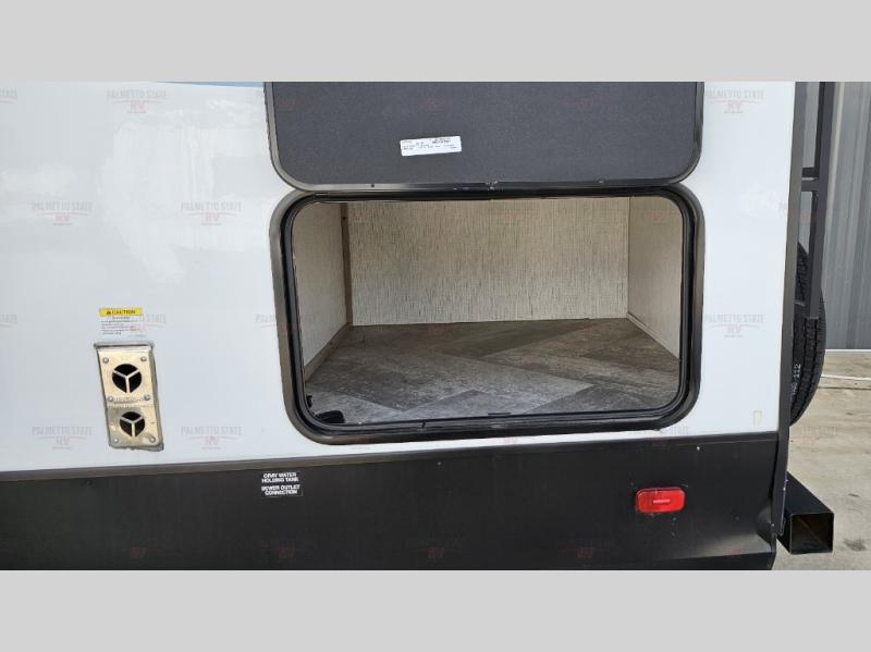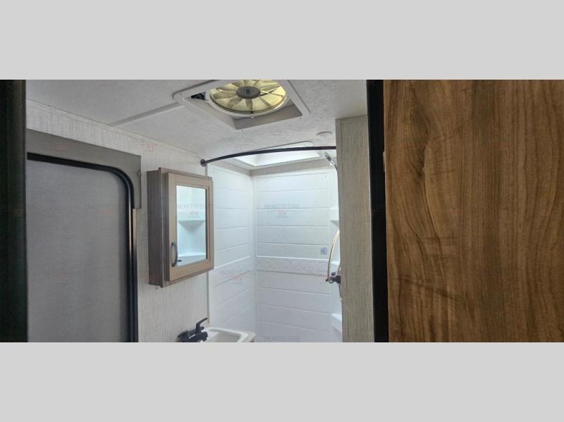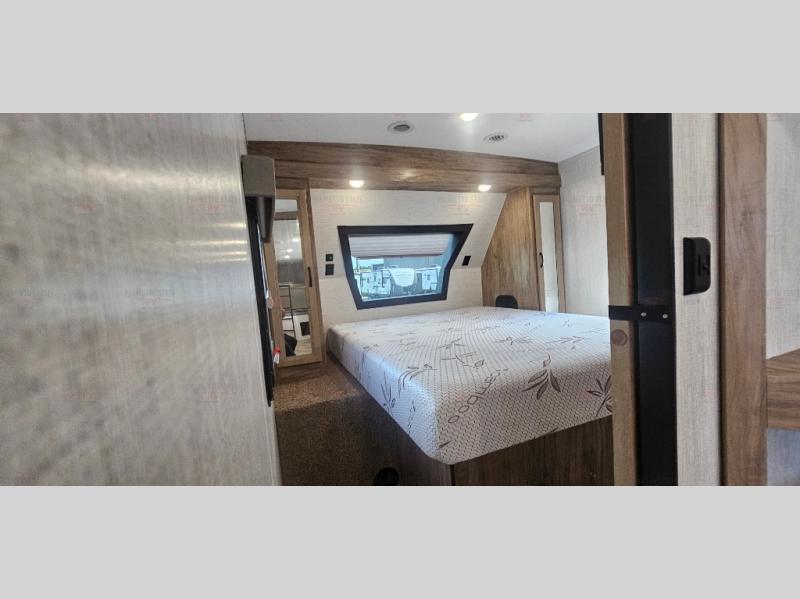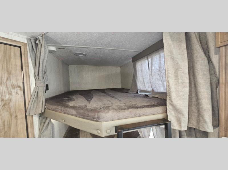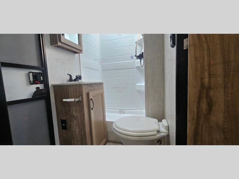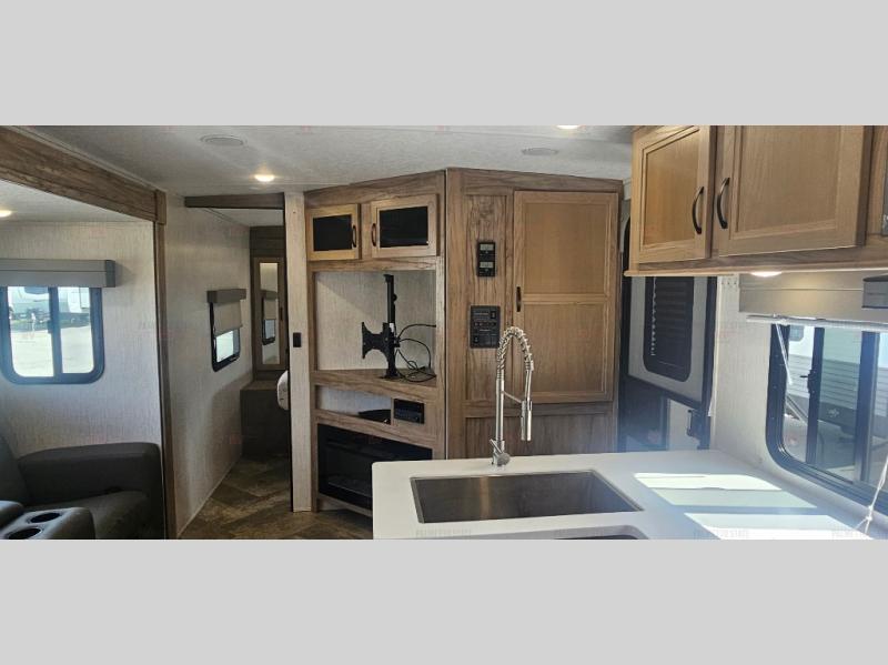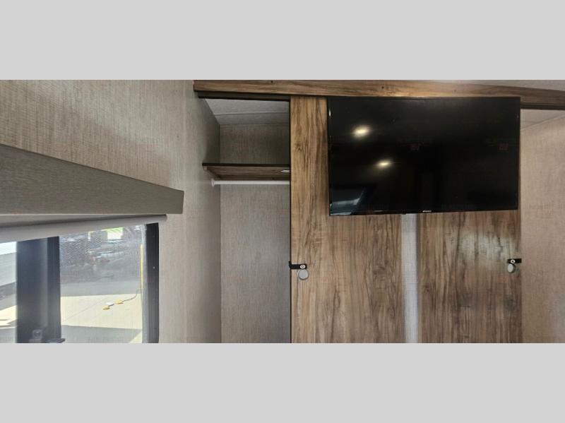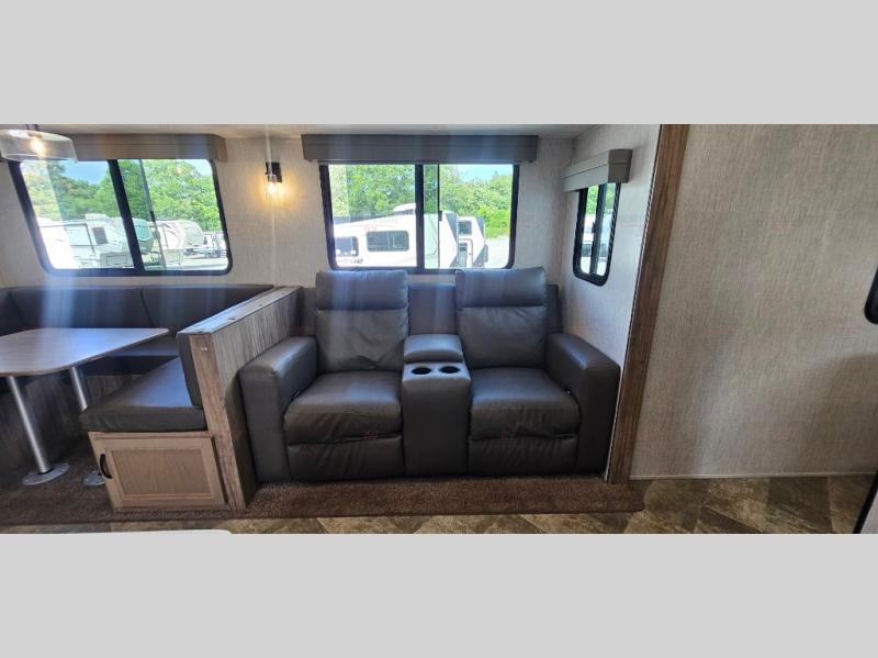 Get ready for fun at the campgrounds hiking, fishing, or relaxing when you have this trailer only a few steps away! The convenient dual entry allows a smooth flow of traffic when everyone joins you, and the second entry/exit is located in the full bathroom which is handy when you are playing outside or relaxing under the 19' power awning. The U-shaped dinette and sofa sleeper are within a slide out providing more floor space and a place to dine, relax and sleep. The double-size bunks are in the rear and the private bedroom is up front. You will find a queen bed, dual wardrobes, a walk-in closet and a space saving sliding door. The galley kitchen is just as impressive, and the cook will love the 11 cu. ft. refrigerator's storage.