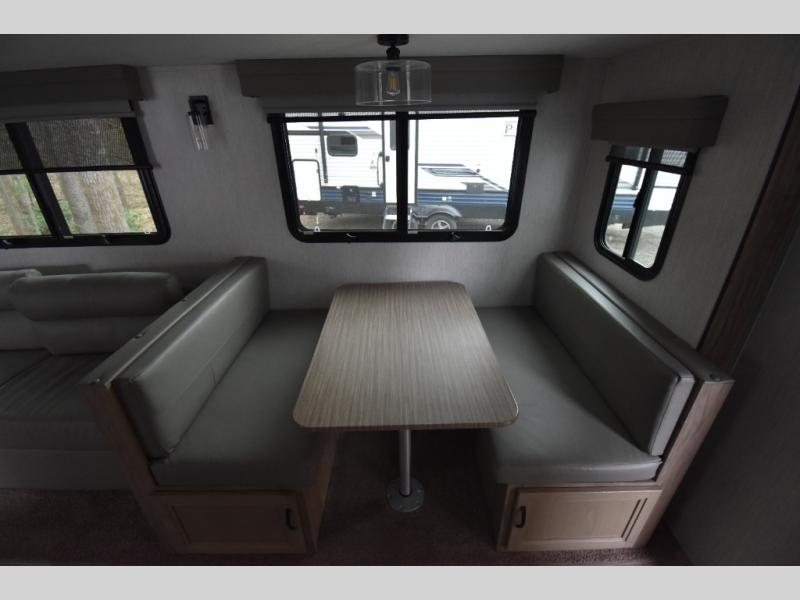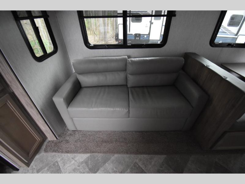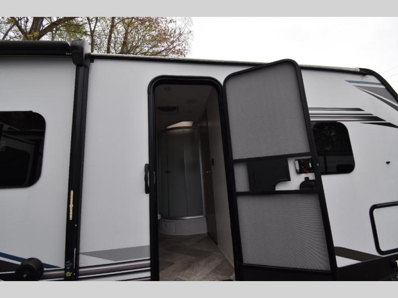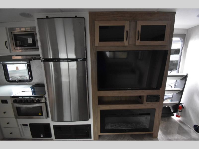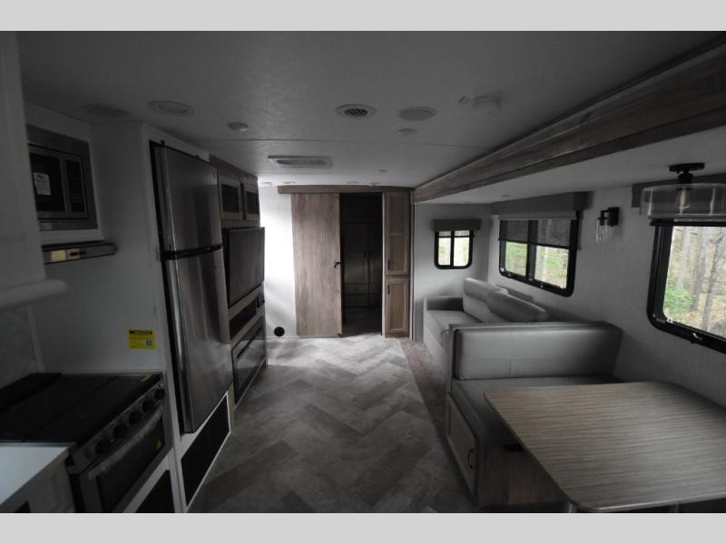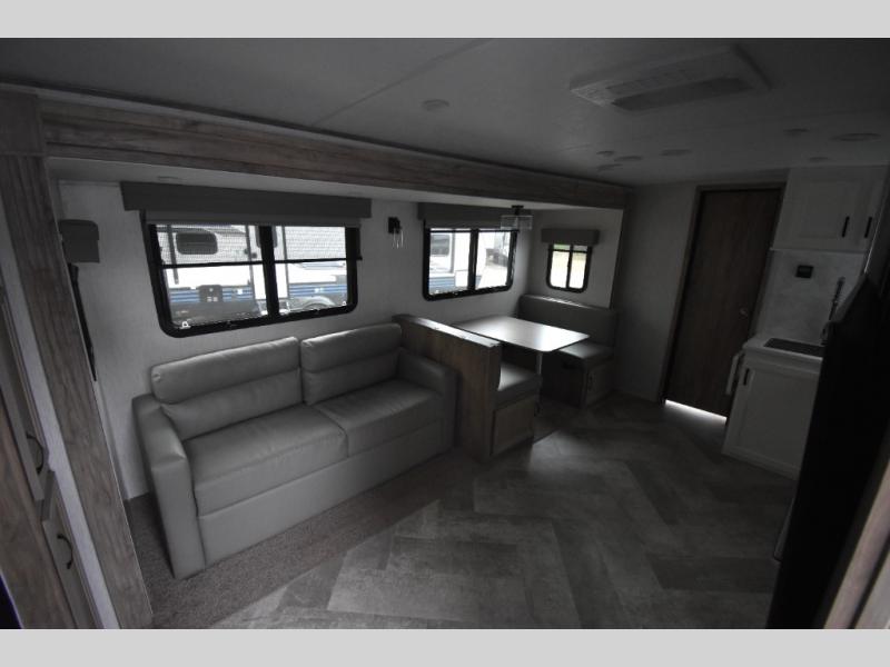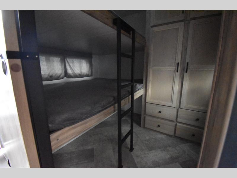 Whether you are looking for a private bunkhouse, a private bedroom, or dual entry in your next RV, this one might just be the perfect fit with all those features! The bunkhouse includes 54" x 74" bunk beds, a wardrobe and a sliding door for privacy, while the front bedroom offers a queen bed with dual wardrobes. The walk-through bathroom is super convenient, plus includes the second entry/exit door to the trailer so you can quickly get inside and back outside to the fun. The galley kitchen offers amenities such as a microwave, a glass top flush mount range, an 11 cu. ft. refrigerator, and an L-shaped counter for preparing and serving meals. You will also find more storage, an entertainment center and a slide out sofa sleeper and booth dinette that offer more sleeping space when needed.