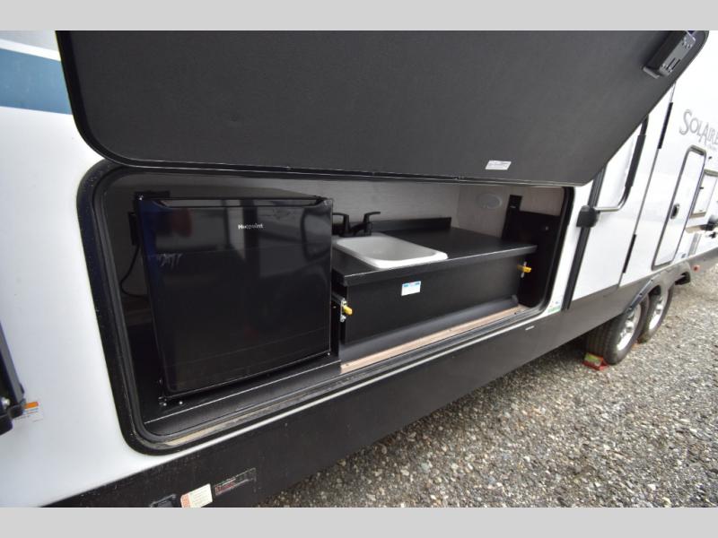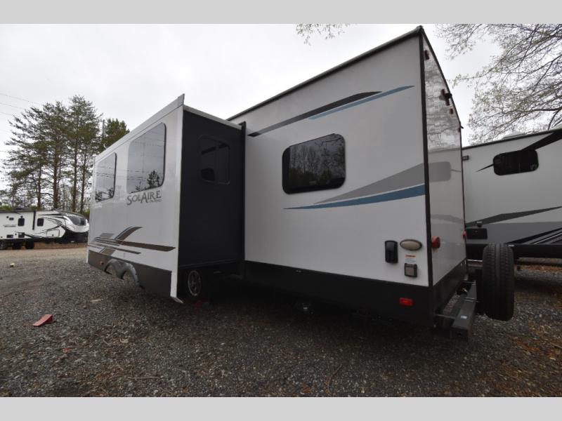 Each SolAire travel trailer or hybrid expandable features a 2/3 front fiberglass cap, a white hi-gloss exterior, and Dexter Tor-Flex torsion axles for smooth towing. You will love having a power tongue jack for easy set up, plus slam latch baggage doors with magnets to make unloading easier than ever. There is also a tire pressure monitoring system, a power awning with LED lights, and aluminum wheels included on the exterior. Head inside to find solid surface countertops, roller shades, a Furrion HDMI DVD/Bluetooth/HDMI stereo, and USB ports to keep your electronics charged.