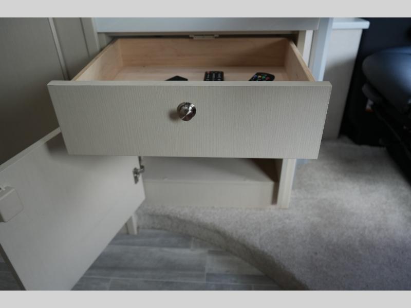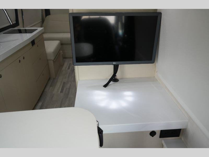 Front Lounge Workstation with 120V outlet, USB ports, Corian countertop, privacy shade, and storage cabinets.