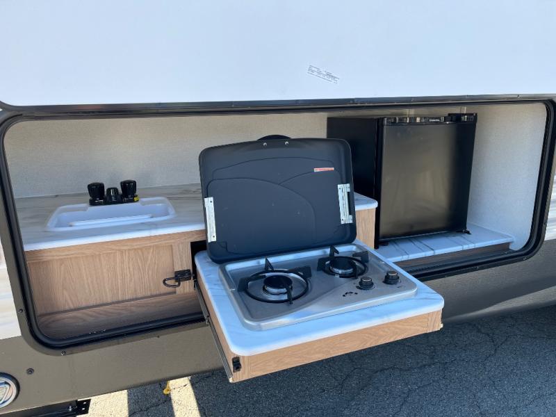 You and your family will love this trailer with all the sleeping accommodations, the privacy and the outdoor features! There are double-size bunks next to the full bathroom, a private front bedroom with space savings sliding doors, a walk-around queen bed, dual wardrobes, and overhead cabinets for storage. The slide offers more floor space while cooking with full amenities including a pantry, plus the sofa and U-shaped dinette offer plenty of seating. And the outside kitchen provides the cook another choice when feeding everyone, plus the 16' power awning gives you protection from the elements.