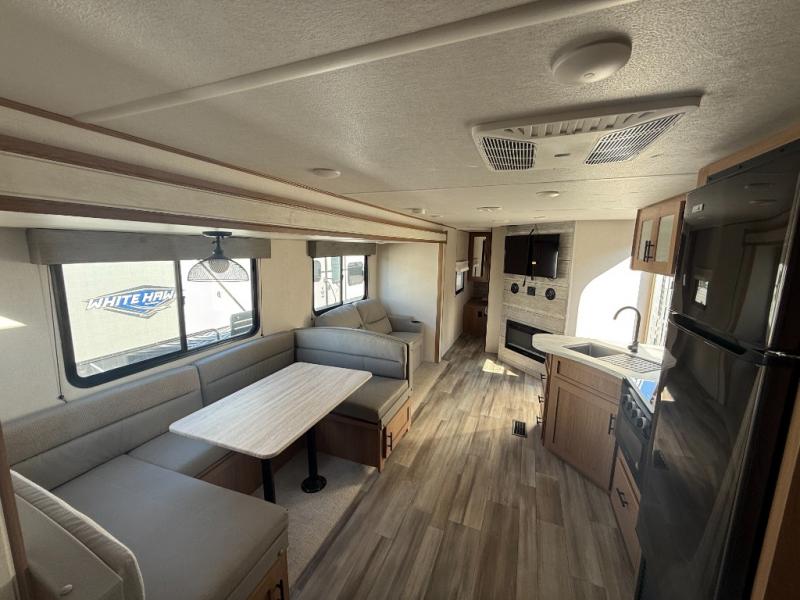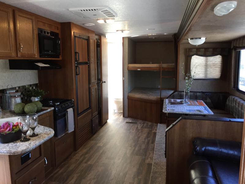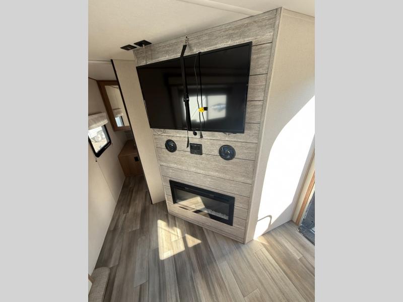 Your family will love this trailer and camping anywhere you go! With a full and half bathroom, you will have the easiest time getting ready in the morning and cleaning up after a full day of hiking. The half bathroom is completely secluded within the front bedroom creating an enticing master suite for the owner of this trailer, and the full bathroom contains the second exterior entry door so that everyone else can quickly get inside to use the restroom while outside playing. The large slide is going to make the main living space feel open and inviting, and the double-size bunks provide you with compact sleeping for four. There is also a large pantry for storing your snacks and a fireplace for keeping the interior cozy.