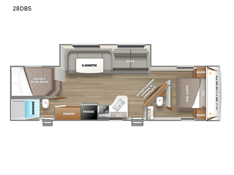 With any Avenger travel trailer by Prime Time, the exterior includes an aerodynamic radius front profile, a diamond plate front rock guard for protection on the road, and four stabilizer jacks to keep your unit secure. There is an aluminum exterior skin, a walk-on roof with decking, and an Extreme Weather package plus an enclosed underbelly so you can camp all year long. The interior offers a 13,500 BTU air conditioner for the perfect climate inside, in-floor ducted heat, a systems monitor panel, and a Bluetooth entertainment system to ensure you'll never go bored. Each model also includes designer window treatments, seamless Carefree Congoleum flooring, kitchen backsplash, and many more at-home comforts.