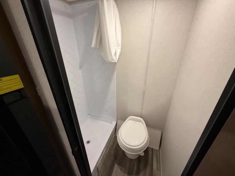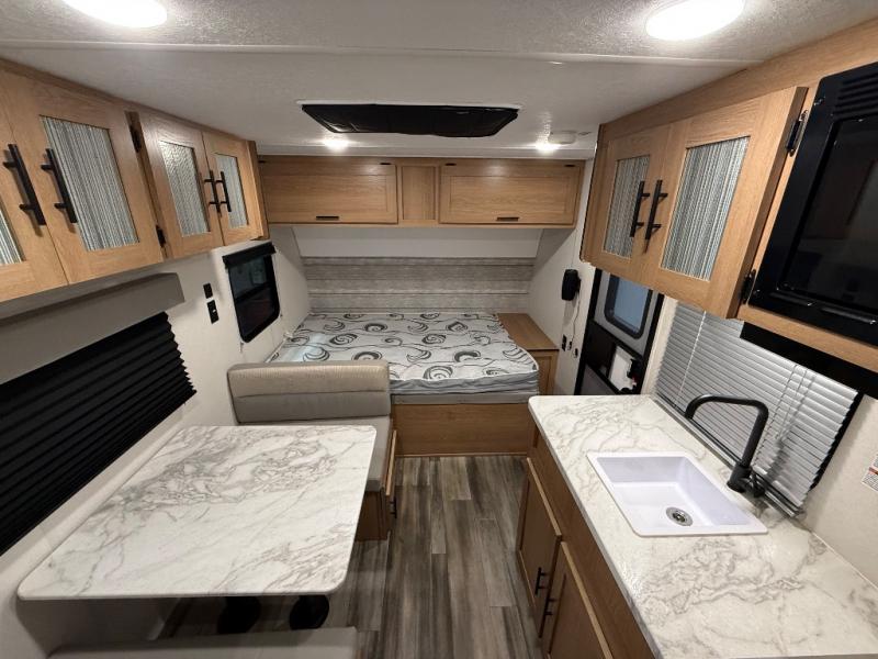 Compact and loaded with comfort and convenience for you to enjoy each and every camping trip! Because this trailer is easily towed by a minivan or SUV, you'll be ready in no time without having to purchase an extra vehicle to tow it. After a day of hiking, the kids will love sleeping on the bunk beds, and you can sleep on the front bed. Enjoy the LED-lit power awning as you make s'mores around the campfire or turn on the LED-lit outdoor speakers to have a dance party with friends and family. With enough storage for your valuables and board games, this trailer makes camping easy!