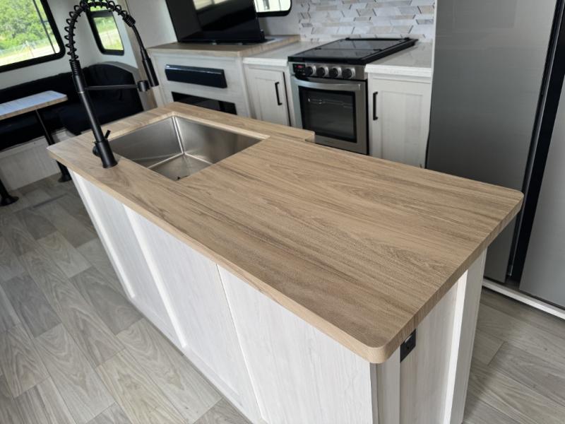 The Crusader fifth wheels by Prime Time RV are a step above the rest and it's not hard to see why. Each model has been constructed to last with its exclusive Eternabond construction, a one-piece TPO roof, and high gloss gel coat fiberglass exterior. The auto leveling system and the comprehensive universal docking center will have you set up to camp in no-time, and there is a convenient bottle opener and Doggy D-ring for your furry companions. You will fall in love with the interior that includes solid surface countertops, designer Carefree linoleum with Scotchgard technology, hardwood cabinet doors, and many more residential comforts. The Crusader also comes standard with dual "Whisper Quiet" ducted A/C's, a 35,000 BTU high capacity gas furnace, and the Extreme Thermal Package Plus, making your camping season year-around!