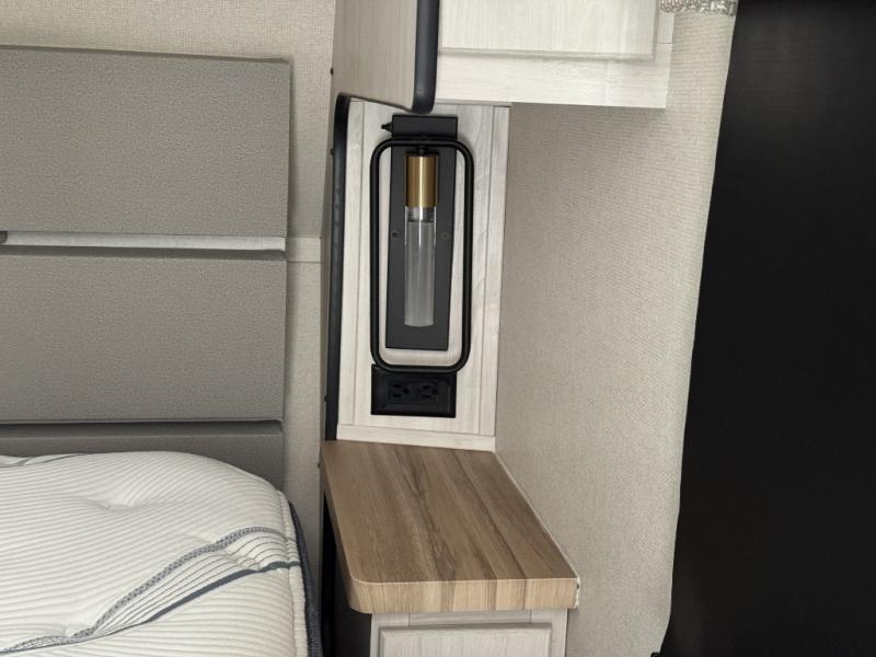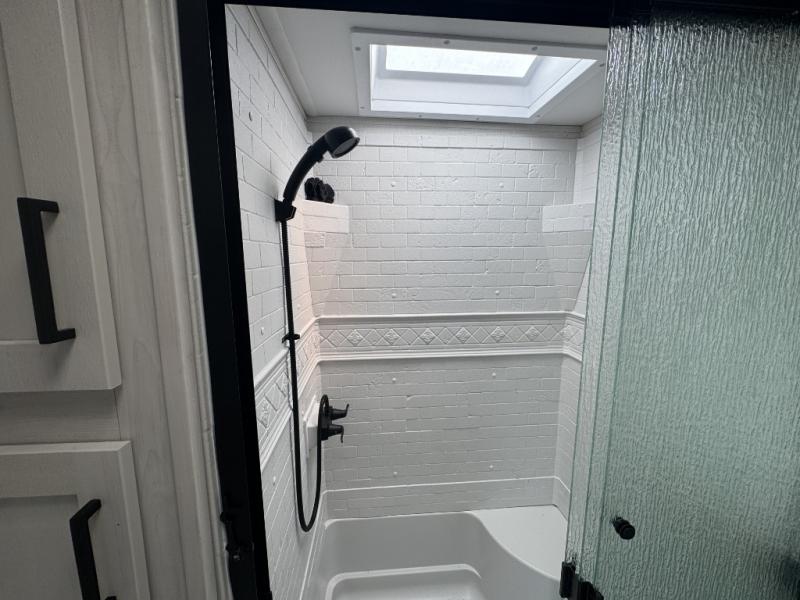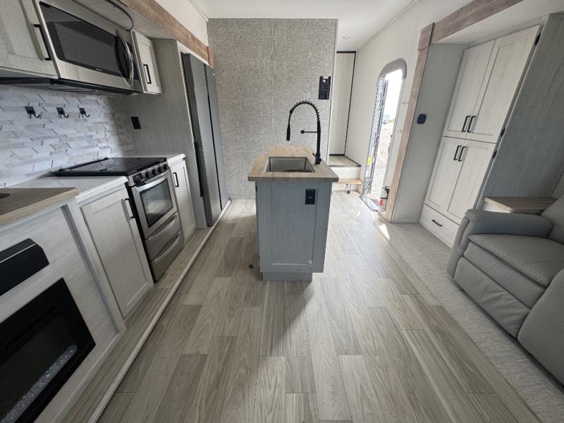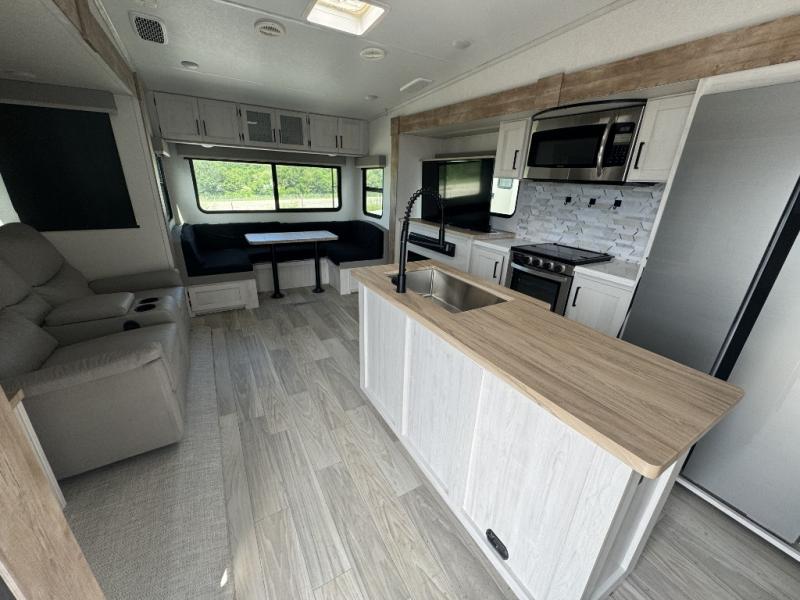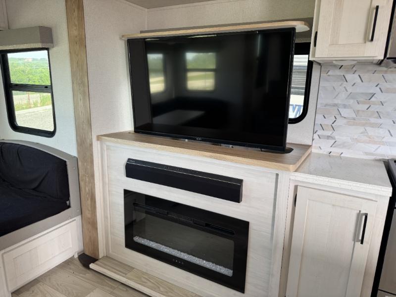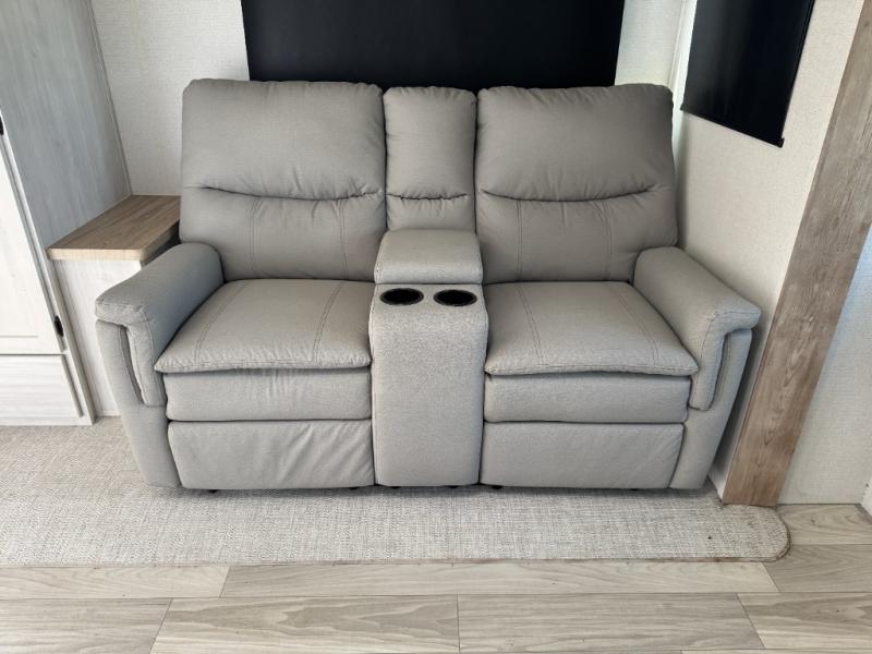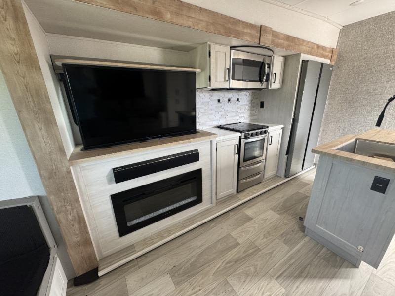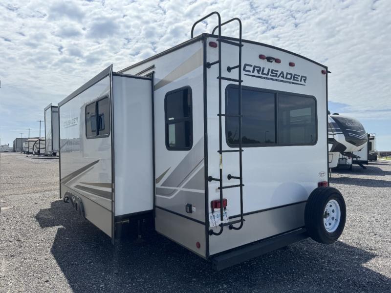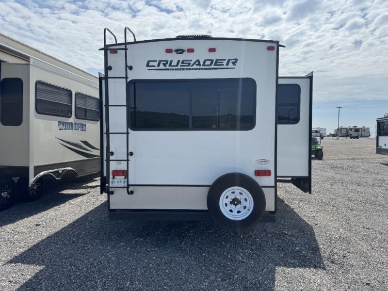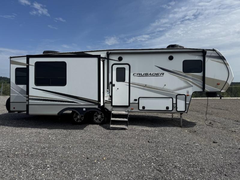 A roomy couples coach, or perfect unit for a small family! This Crusader fifth wheel offers triple slides with dual opposing slides in the main living and kitchen area to create ample walking around space. You will enjoy dining and entertaining at the rear u-shaped dinette which can also double as sleeping space for two littles ones when folded down. Theater seating opposite the entertainment center with a lift TV and fireplace makes for a cozy movie night. The chef in the family will appreciate this Crusader kitchen featuring a 16 cu. ft. refrigerator, a 30" microwave oven, and center island for food prep. Head up to the private bedroom with queen bed for a relaxing night's sleep and a wardrobe slide with mirrored doors, plus plenty of extra storage in nightstands and overhead cabinets. The bath features a shower, toilet, linen cabinet for your towels, and a vanity with medicine cabinet above. When you head outside, you will find an electric awning with LED lighting which provides you another living space to enjoy both day and night!