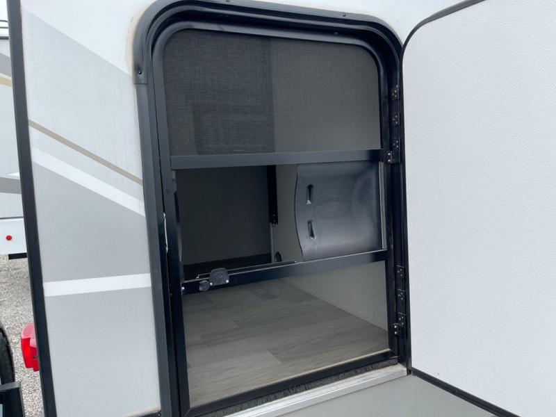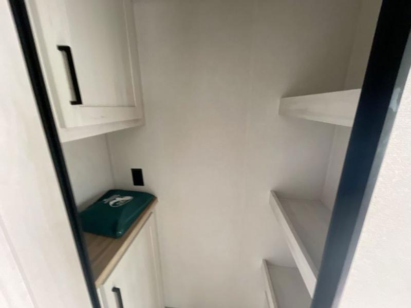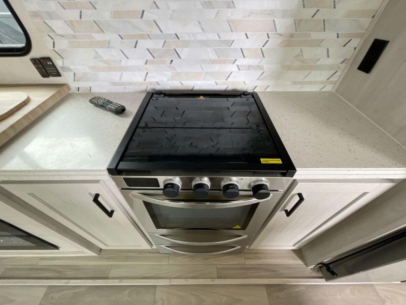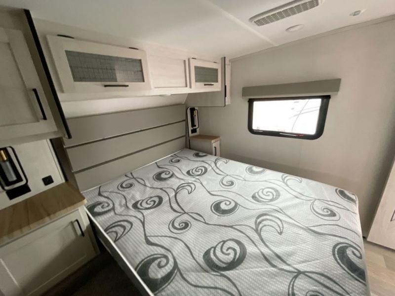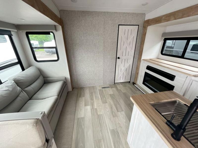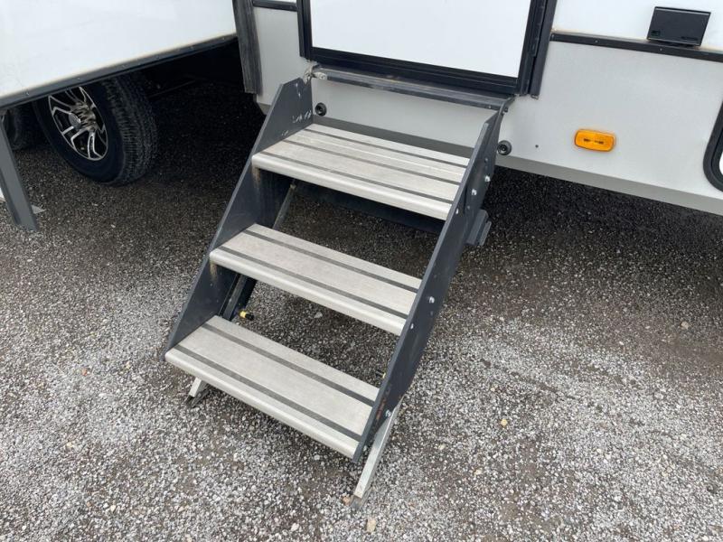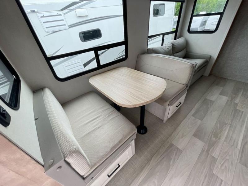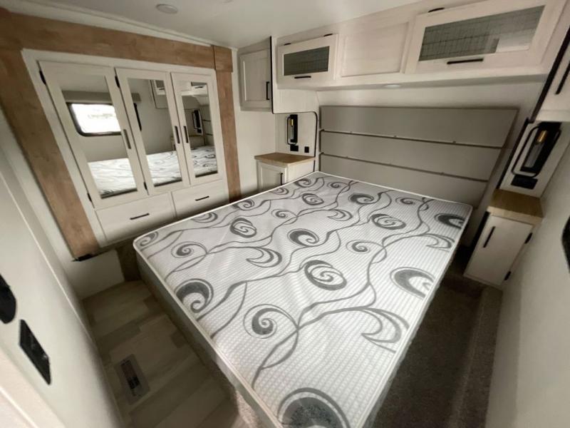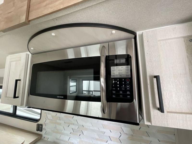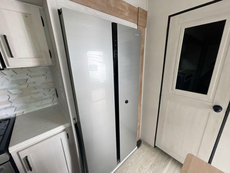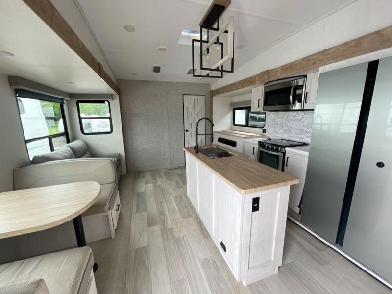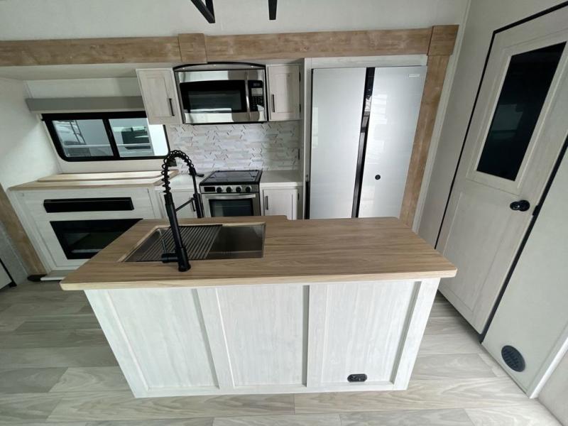 A great family fifth wheel with plenty of space for everyone! The kids or extra guests will enjoy the rear private bunkhouse with 74" x 55" Happi-Jac bunk beds, plus a half bath for convenience, and a closet with drawers and hanging storage. The main combined living and dining space features dual opposing slides for added space to move about. There is a a set of theater seats and a booth dinette for dining, or you can choose the optional free standing table and chairs. A kitchen island offers added prep space when making meals, as well as added storage in cabinets below. A 16 cu. ft. refrigerator, walk-in pantry, plus three burner cooktop and oven with overhead 30" microwave will allow you to make meals just like at home. There is an entry hutch for added storage with upper and lower cabinets plus a little counter space to drop keys or add photo frames, books, etc. The bathroom features a large shower with seat, vanity with sink and overhead medicine cabinet, plus line storage for towels and toiletries. The front private bedroom takes you away from the hustle and bustle of the main living area for a great night's rest and you will enjoy the added space thanks to the wardrobe that slides out featuring drawers below upper hanging storage with mirrored doors. There is additional storage in upper cabinets above the bed as well as on each side with bedside reading lights, nightstands, and more.