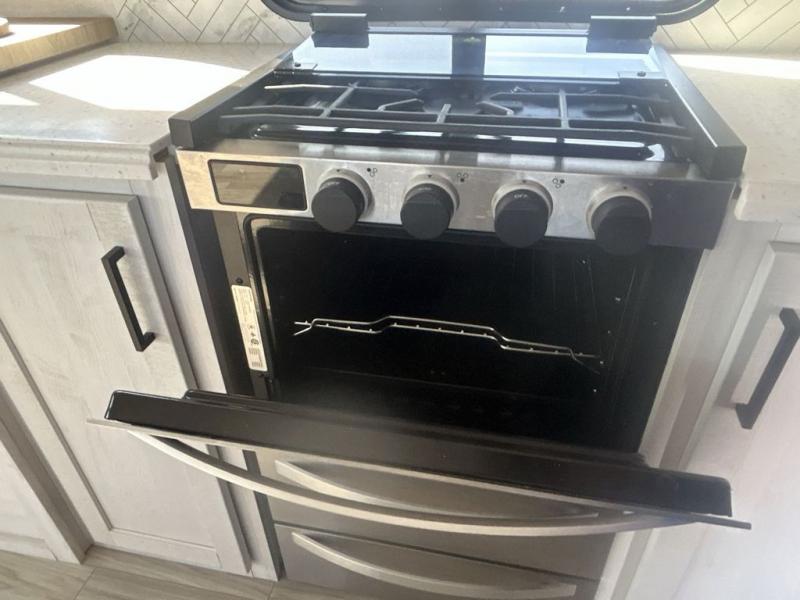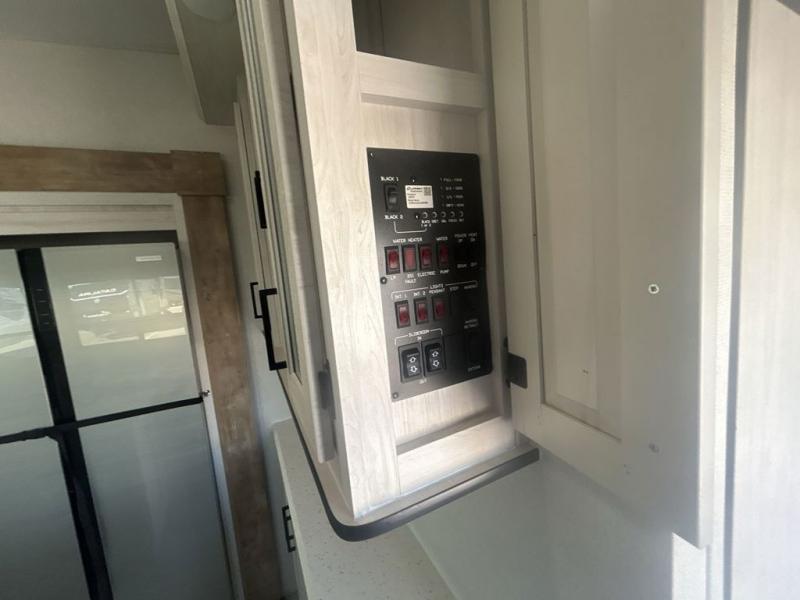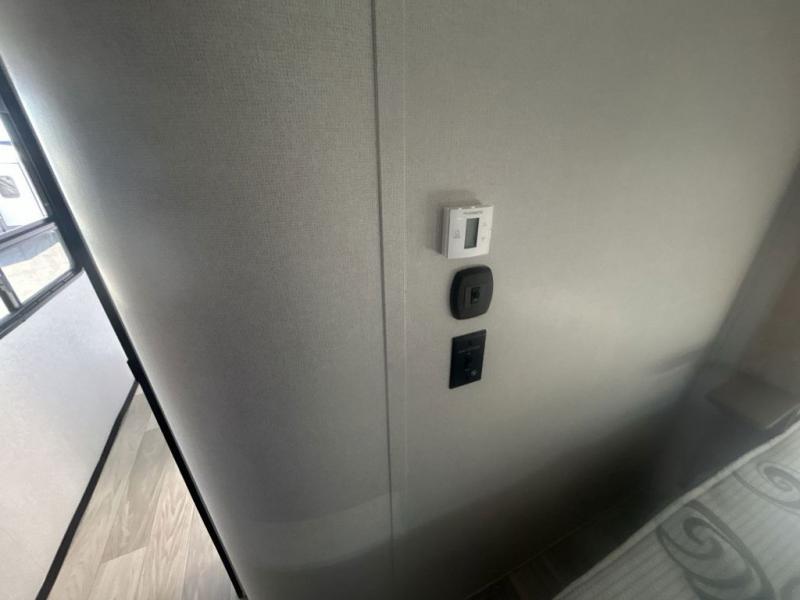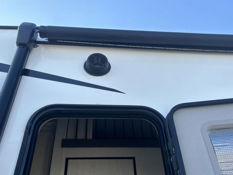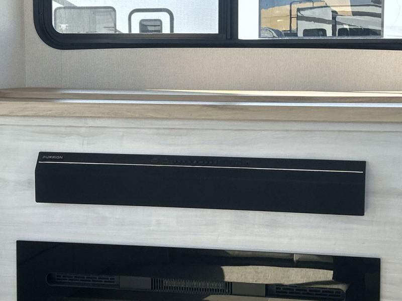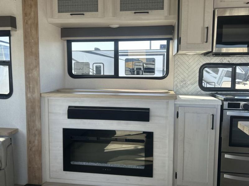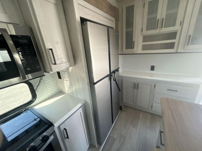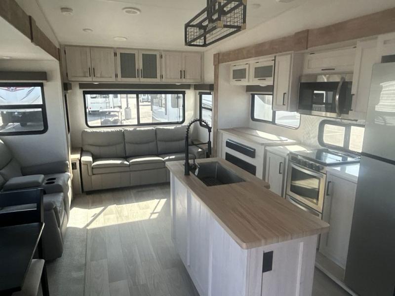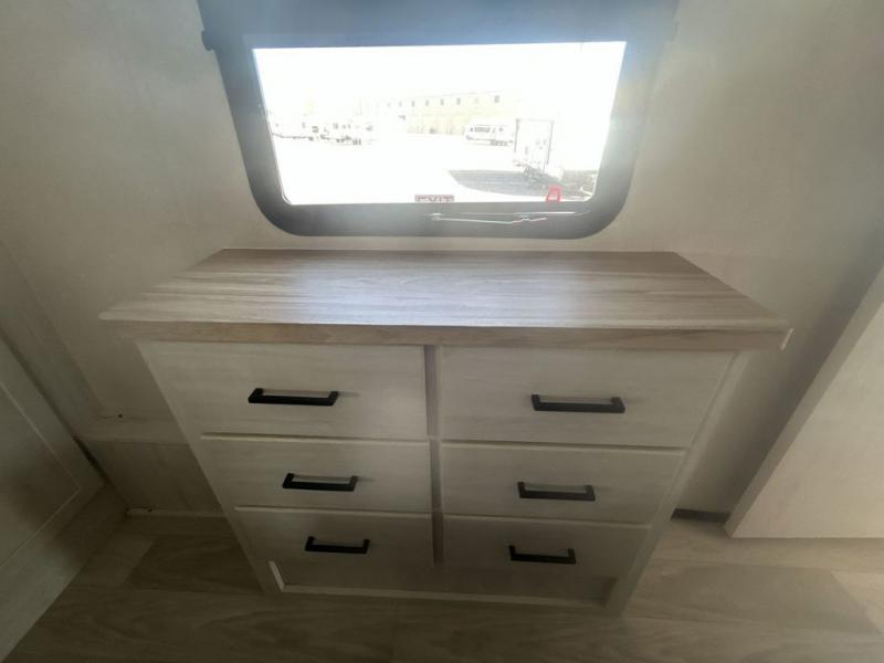 This fifth wheel is one your whole crew will love thanks to the middle bunkroom with a "Sleep & Play" sofa and an upper bunk! You will enjoy the front private bedroom all to yourselves with a king bed slide out, a large closet with washer and dryer prep, plus a dresser for more storage. When you're not outdoors relaxing under the 19' electric awning with LED lights, head to the rear living area to sit back on the theater seating or the hide-a-bed sofa. You'll also find an LED TV here and a booth dinette for game night. The chef will love the outside kitchen just as much as the indoor kitchen with a butcher block top, two pantries, plus a 30" residential style microwave!