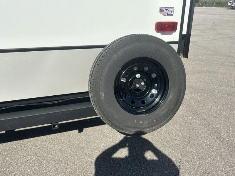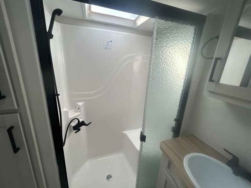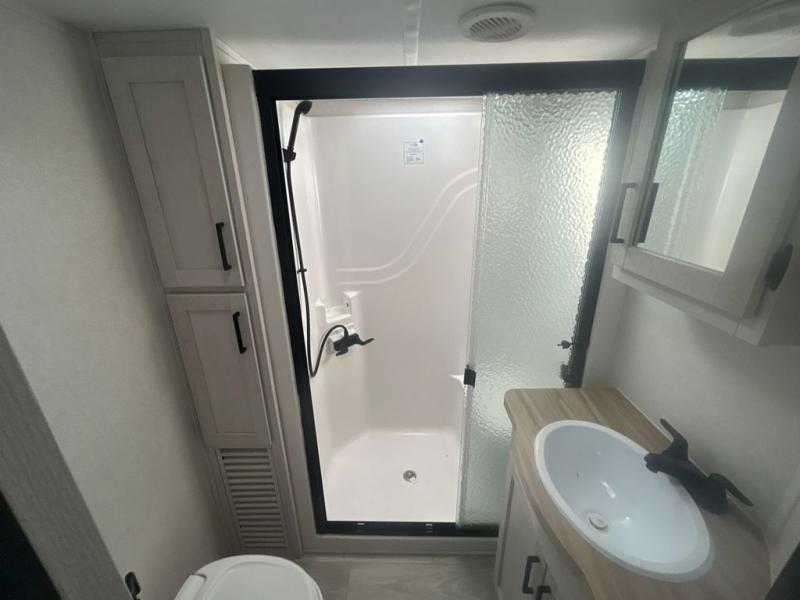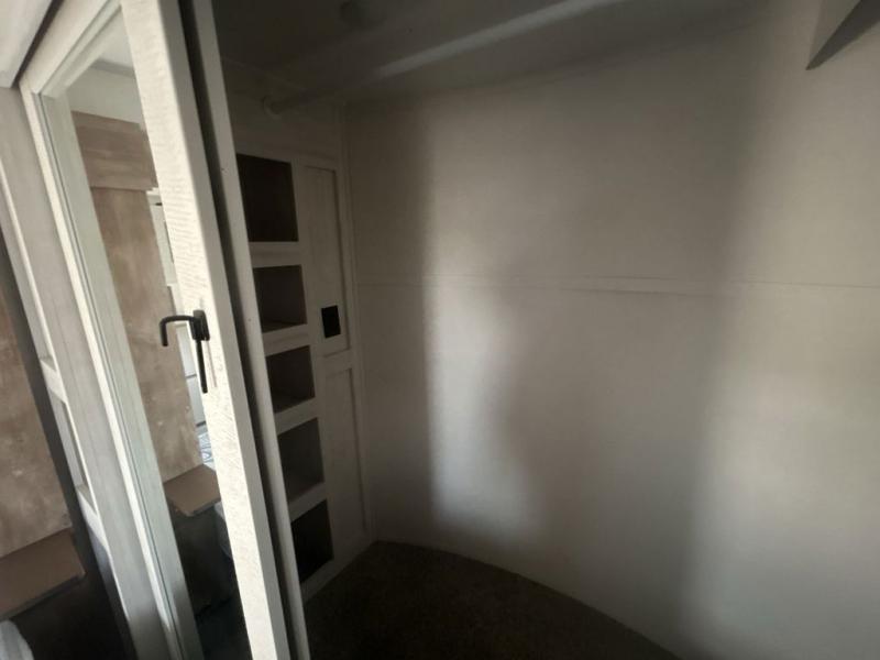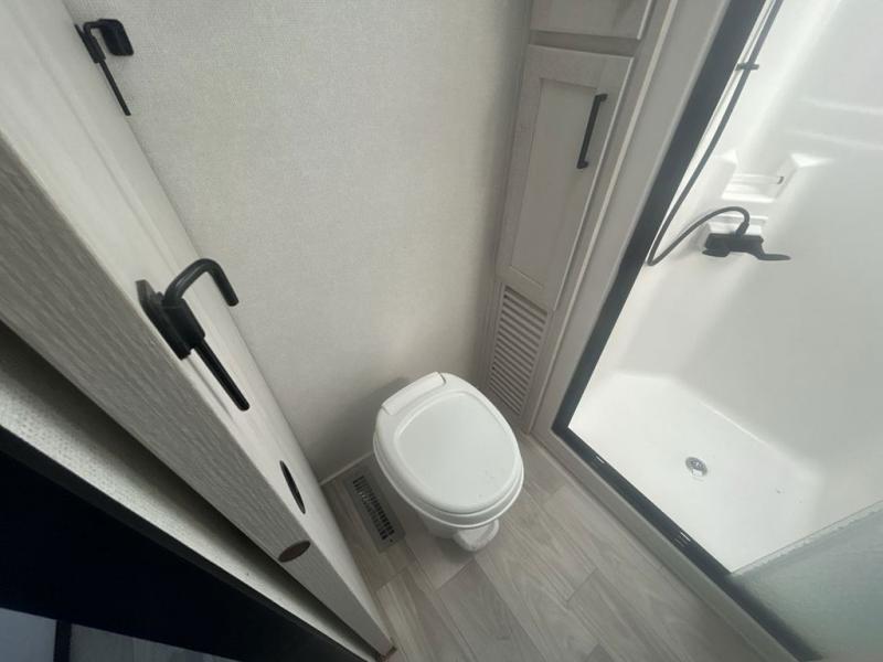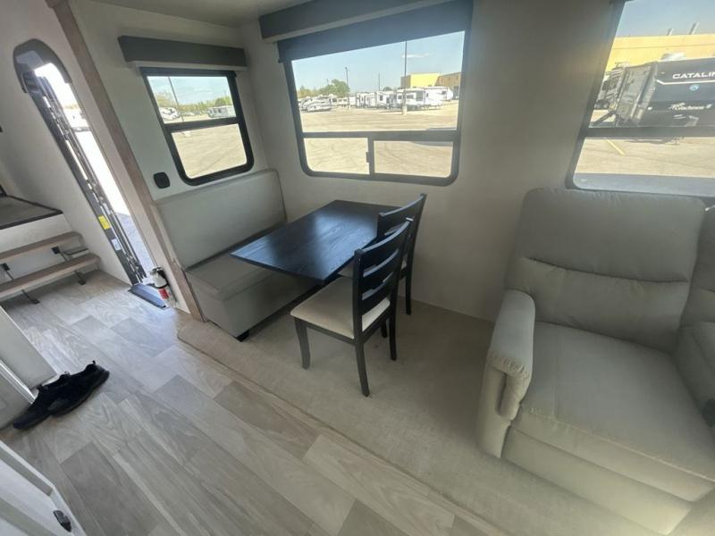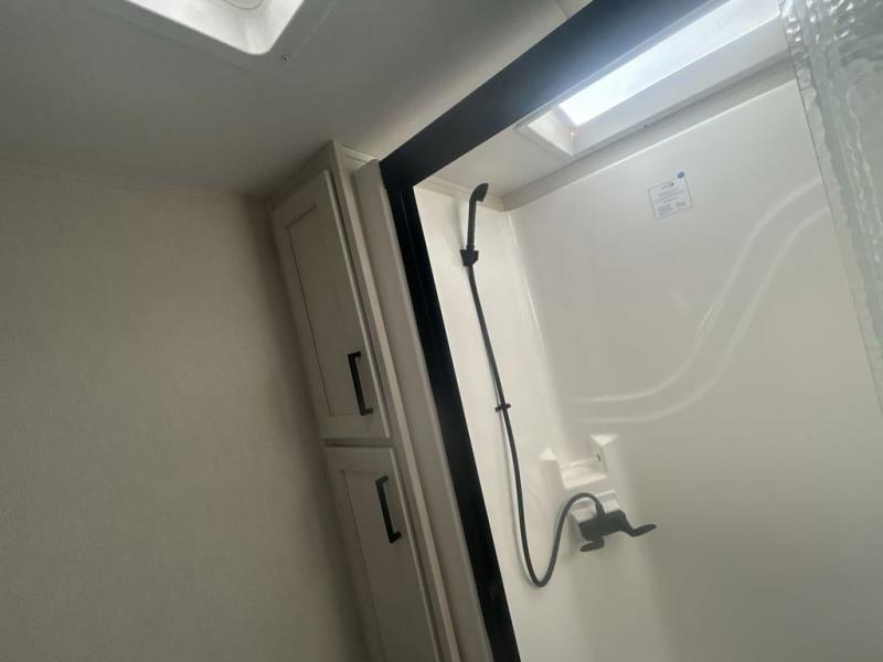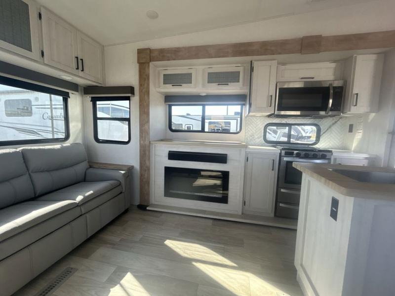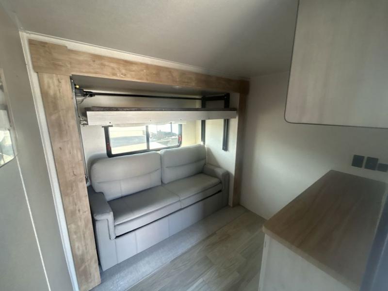 This fifth wheel is one your whole crew will love thanks to the middle bunkroom with a "Sleep & Play" sofa and an upper bunk! You will enjoy the front private bedroom all to yourselves with a king bed slide out, a large closet with washer and dryer prep, plus a dresser for more storage. When you're not outdoors relaxing under the 19' electric awning with LED lights, head to the rear living area to sit back on the theater seating or the hide-a-bed sofa. You'll also find an LED TV here and a booth dinette for game night. The chef will love the outside kitchen just as much as the indoor kitchen with a butcher block top, two pantries, plus a 30" residential style microwave!