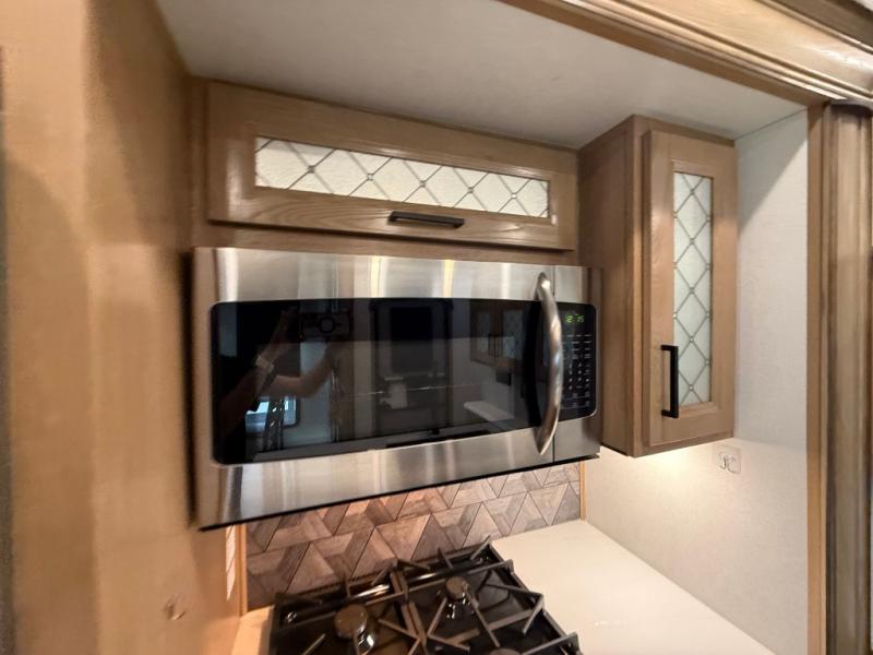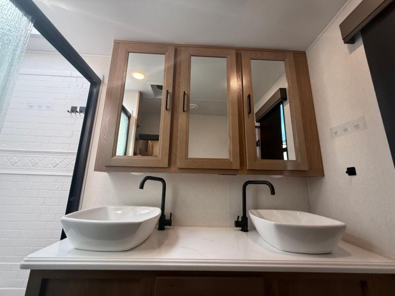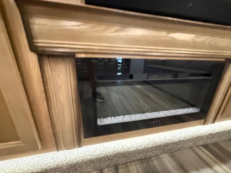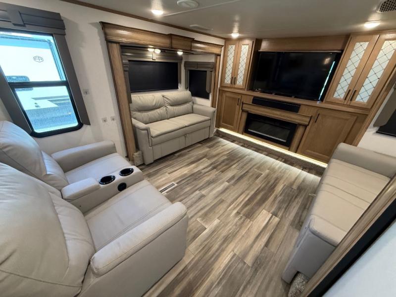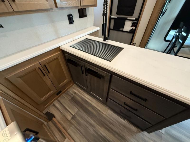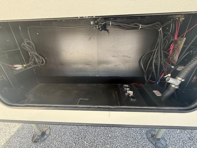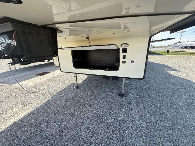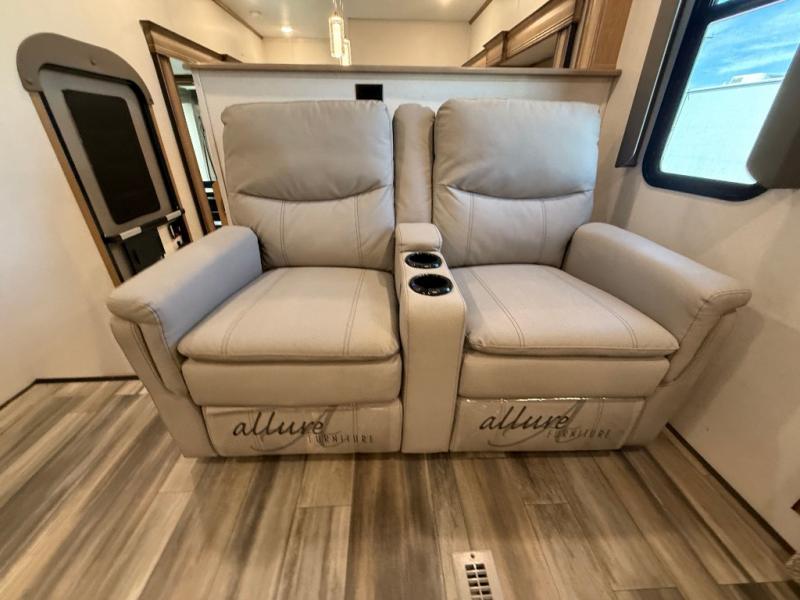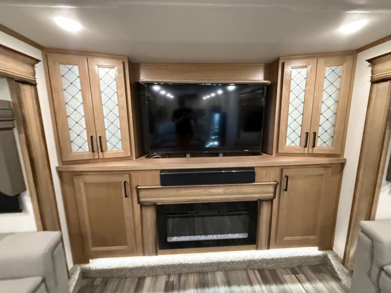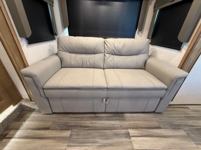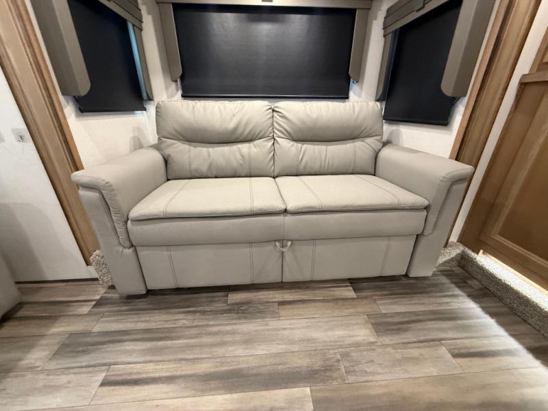 It's a clean decision with a bath and a half to take this fifth wheel on your next adventure! The front living area includes opposing EZ glide couches, 65" theater seating, and a front entertainment with a 50" LED pop up TV and fireplace for a cozy evening indoors. You can convert this area to a bedroom at night for the kiddos or guests, and the front windshield will provide natural light during the daytime. Prepare meals on the Furrion four burner cooktop, and leftovers can go in the 15 cu. ft. residential refrigerator. You and your spouse will love the master suite that includes a king bed slide, plenty of storage space, and an entrance into the full rear bathroom with a dual sink vanity to come in handy when getting ready each day. There is even a space prepped to add an optional washer and dryer if you plan to stay awhile!