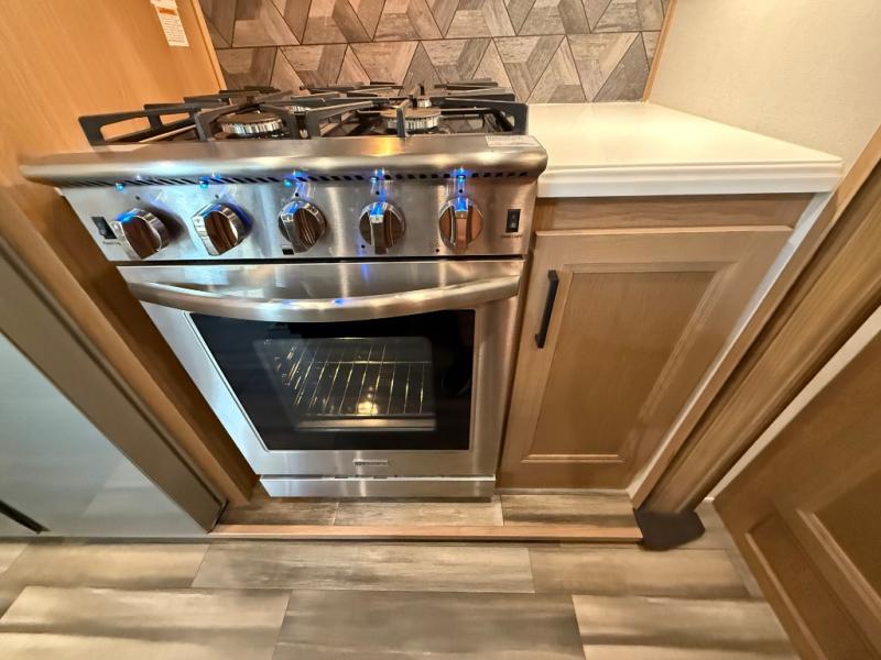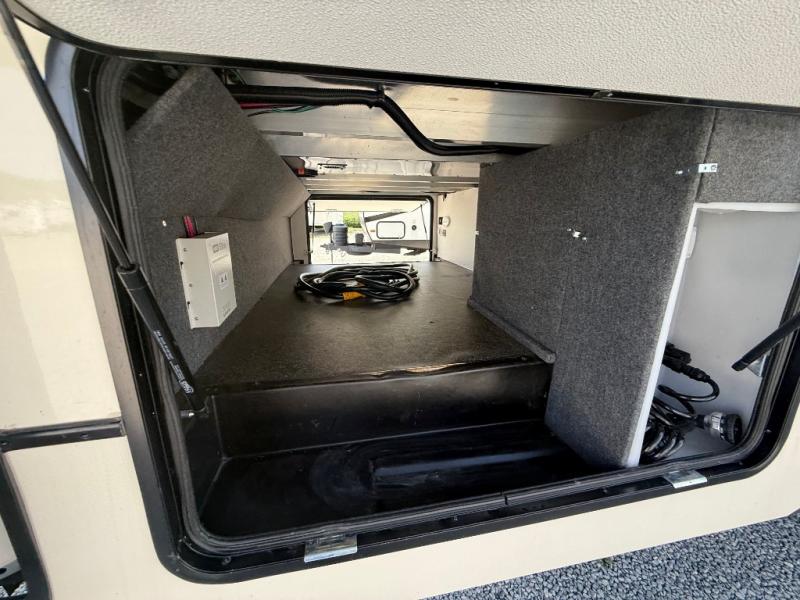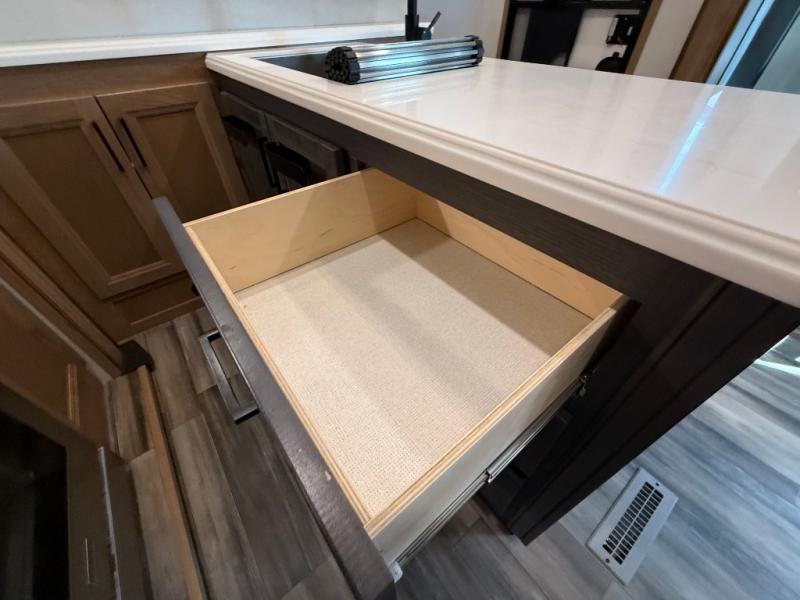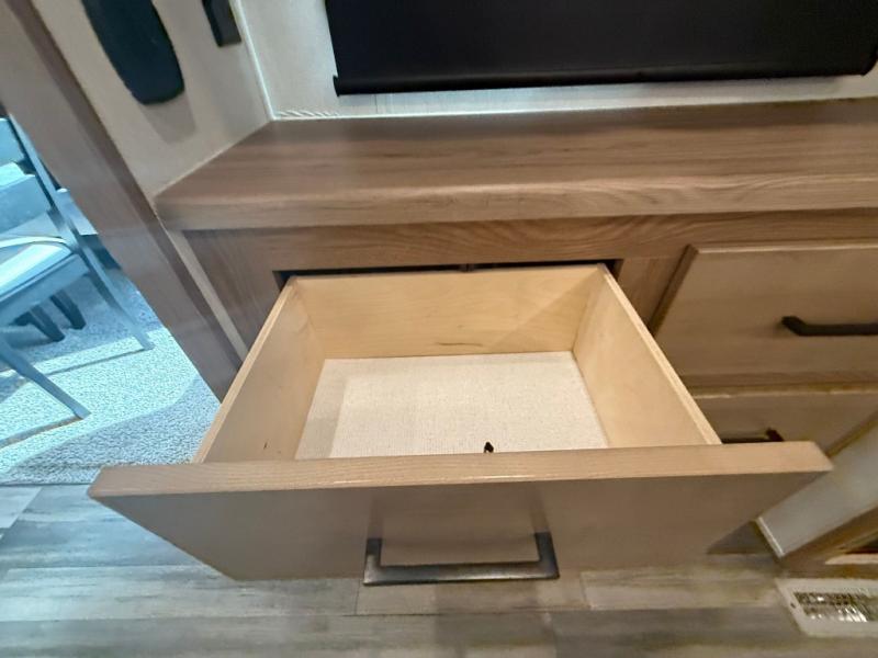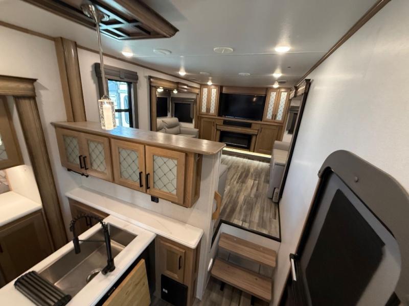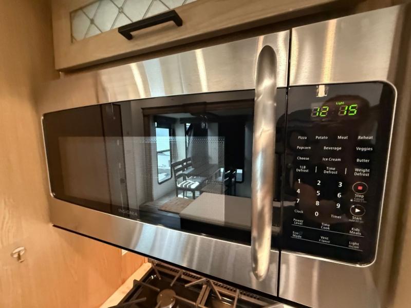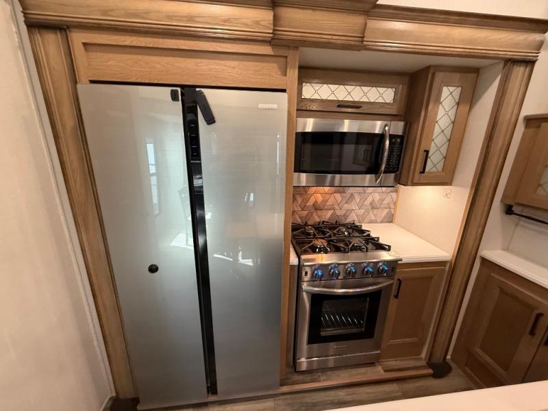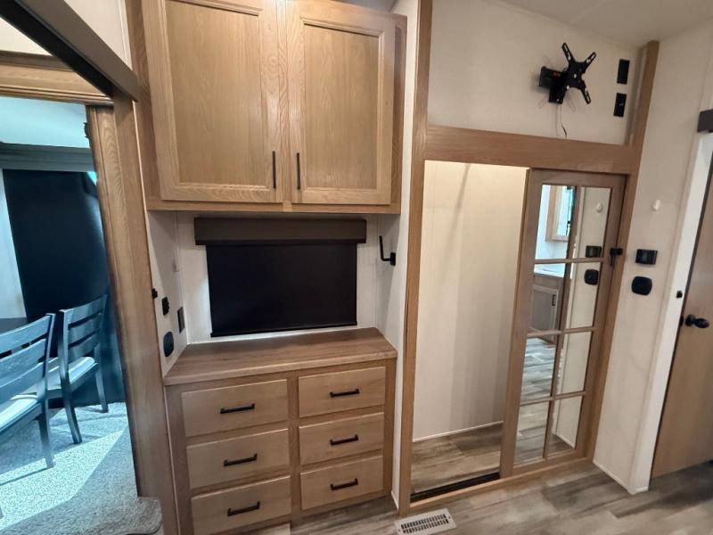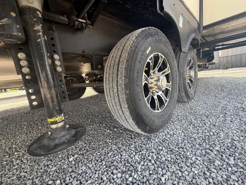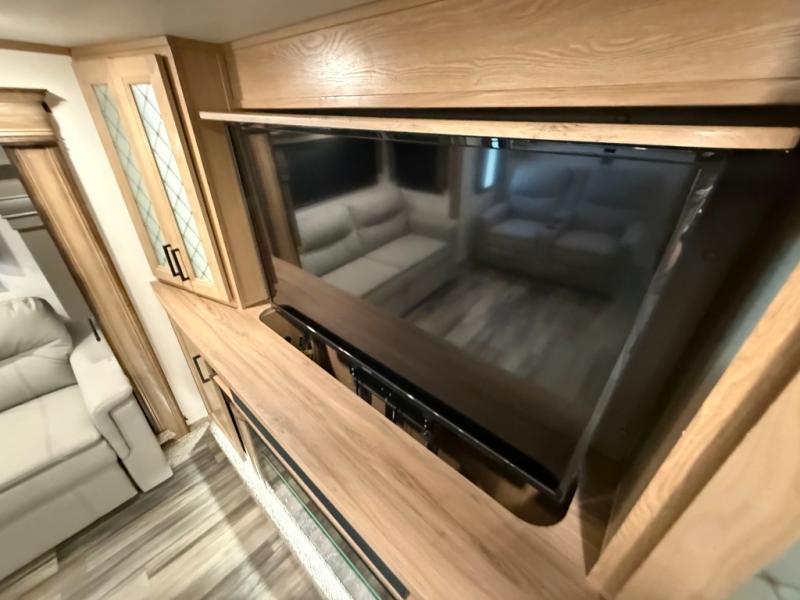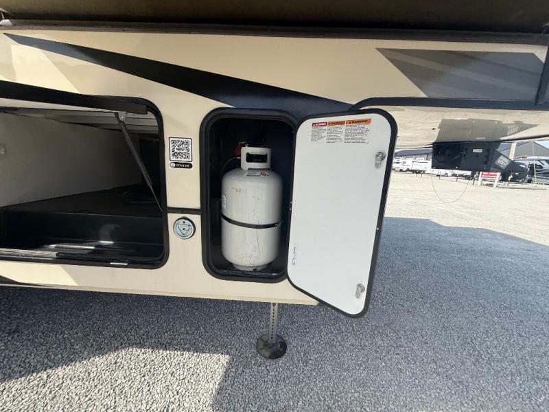 It's a clean decision with a bath and a half to take this fifth wheel on your next adventure! The front living area includes opposing EZ glide couches, 65" theater seating, and a front entertainment with a 50" LED pop up TV and fireplace for a cozy evening indoors. You can convert this area to a bedroom at night for the kiddos or guests, and the front windshield will provide natural light during the daytime. Prepare meals on the Furrion four burner cooktop, and leftovers can go in the 15 cu. ft. residential refrigerator. You and your spouse will love the master suite that includes a king bed slide, plenty of storage space, and an entrance into the full rear bathroom with a dual sink vanity to come in handy when getting ready each day. There is even a space prepped to add an optional washer and dryer if you plan to stay awhile!