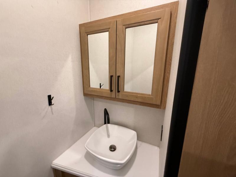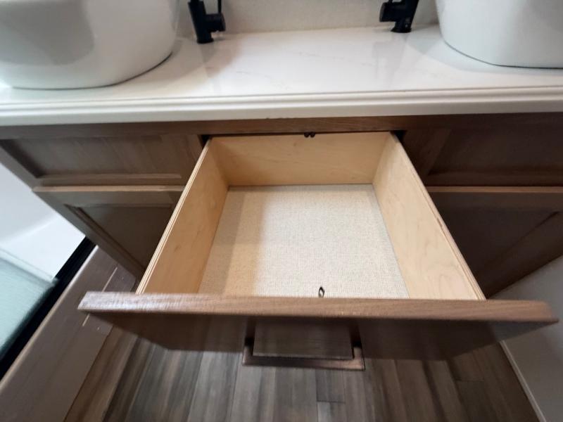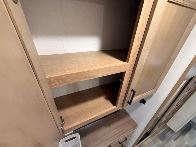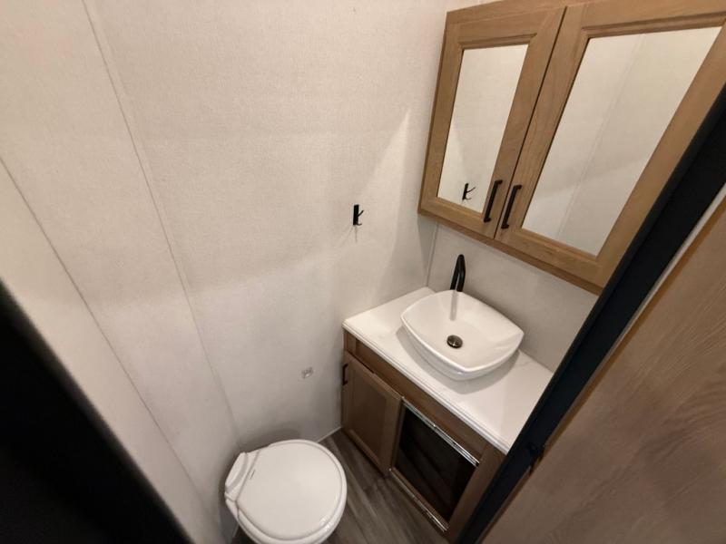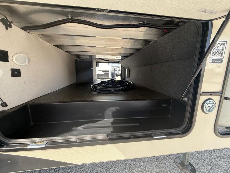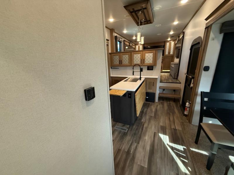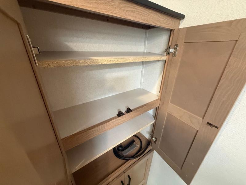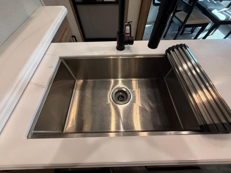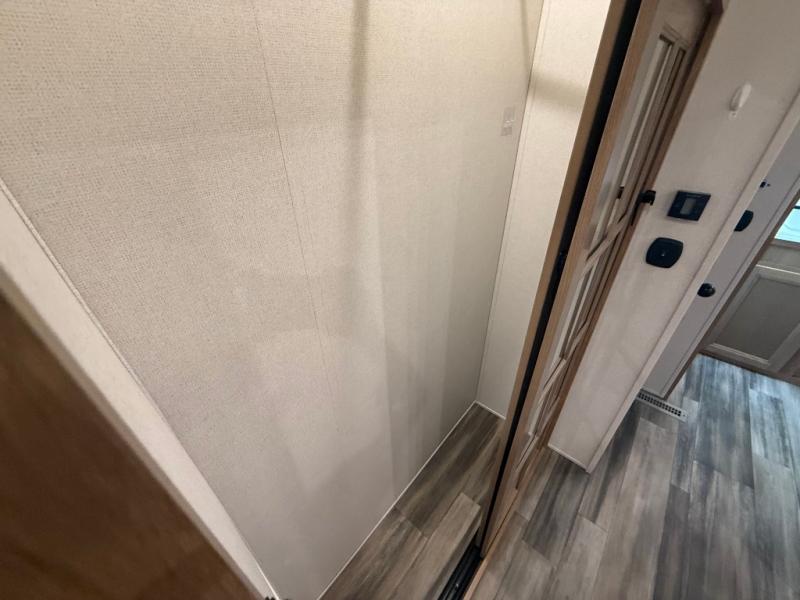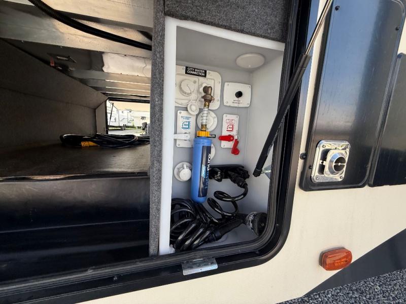 It's a clean decision with a bath and a half to take this fifth wheel on your next adventure! The front living area includes opposing EZ glide couches, 65" theater seating, and a front entertainment with a 50" LED pop up TV and fireplace for a cozy evening indoors. You can convert this area to a bedroom at night for the kiddos or guests, and the front windshield will provide natural light during the daytime. Prepare meals on the Furrion four burner cooktop, and leftovers can go in the 15 cu. ft. residential refrigerator. You and your spouse will love the master suite that includes a king bed slide, plenty of storage space, and an entrance into the full rear bathroom with a dual sink vanity to come in handy when getting ready each day. There is even a space prepped to add an optional washer and dryer if you plan to stay awhile!